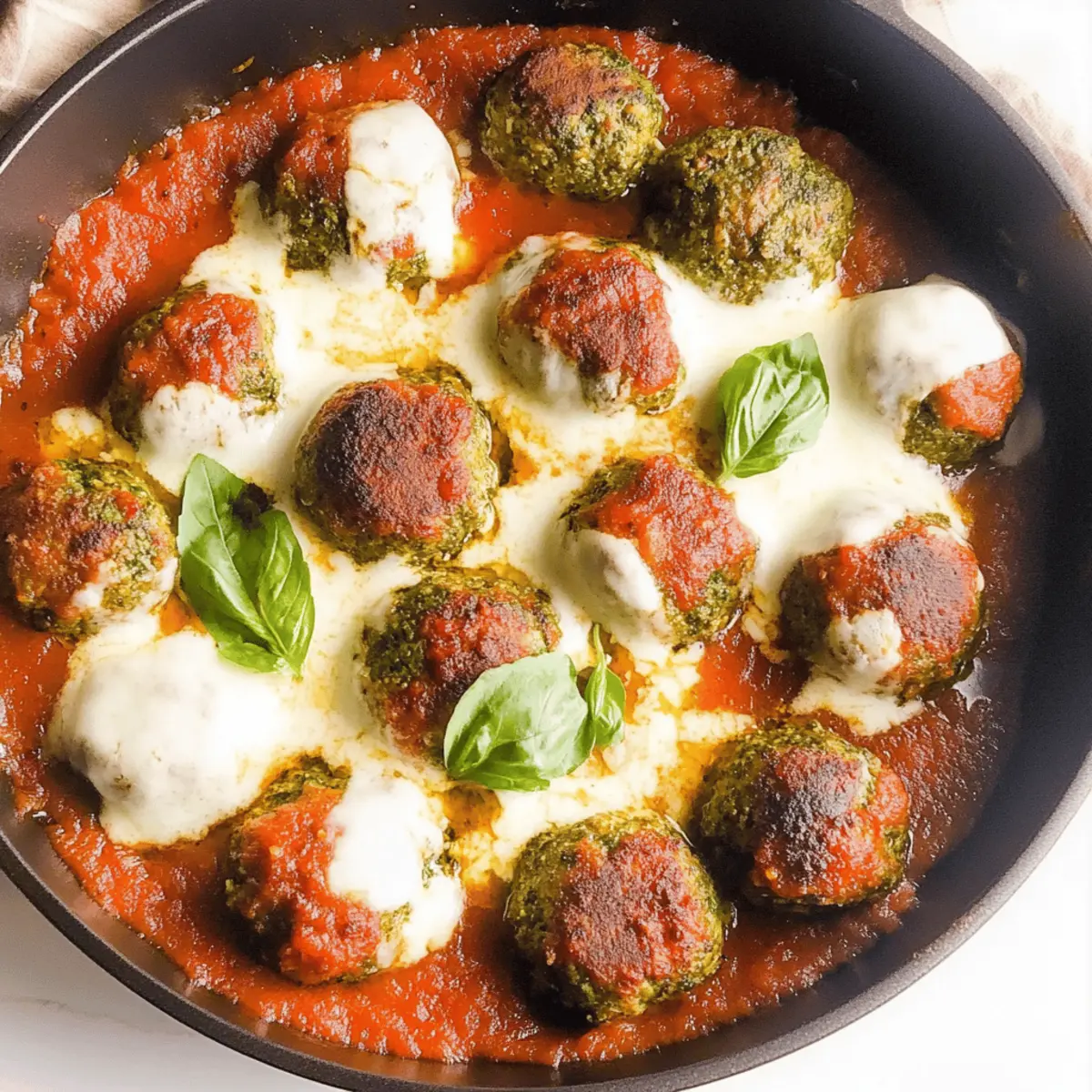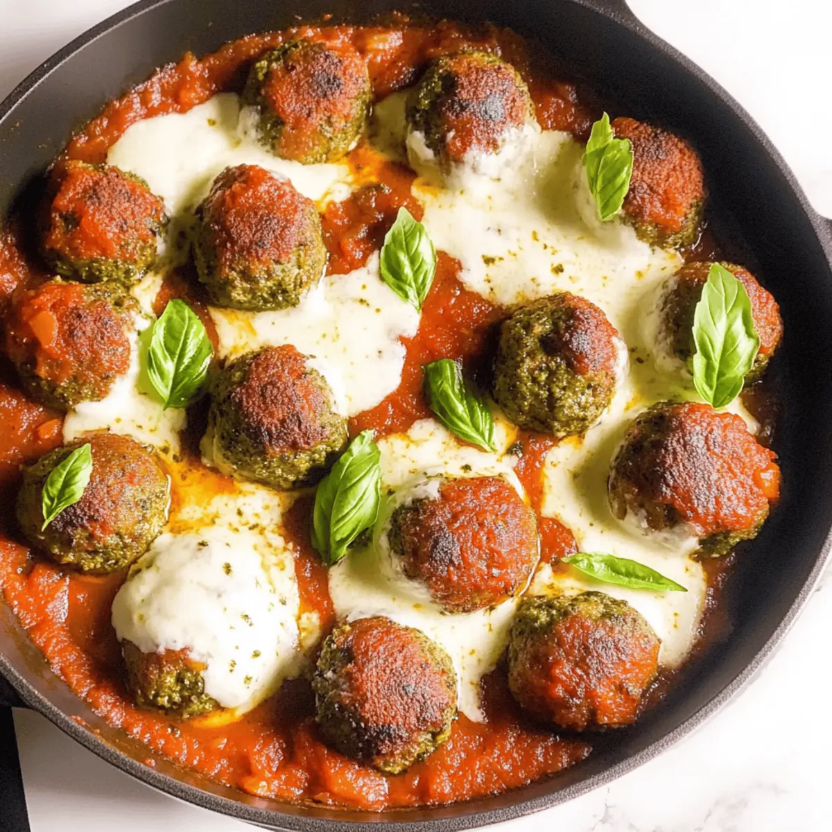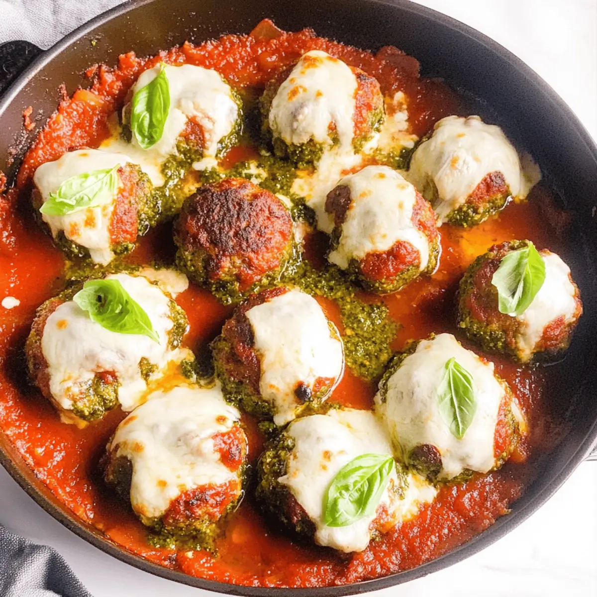 Flavor Explosion: These meatballs are brimming with a delightful mix of basil pesto and melted mozzarella that enhances every bite.