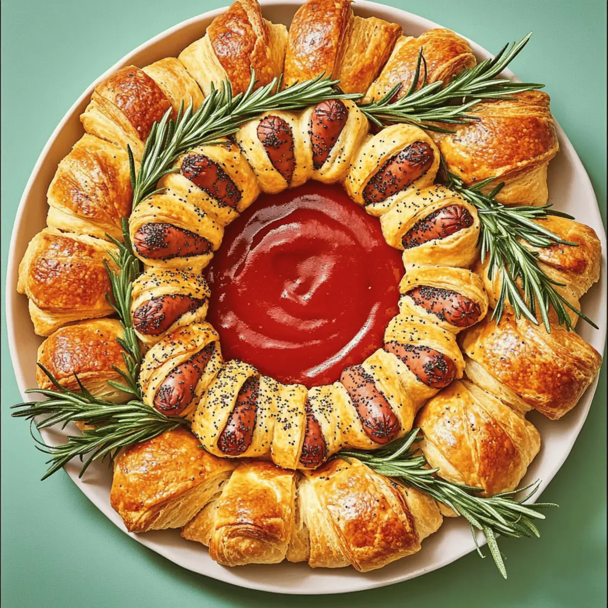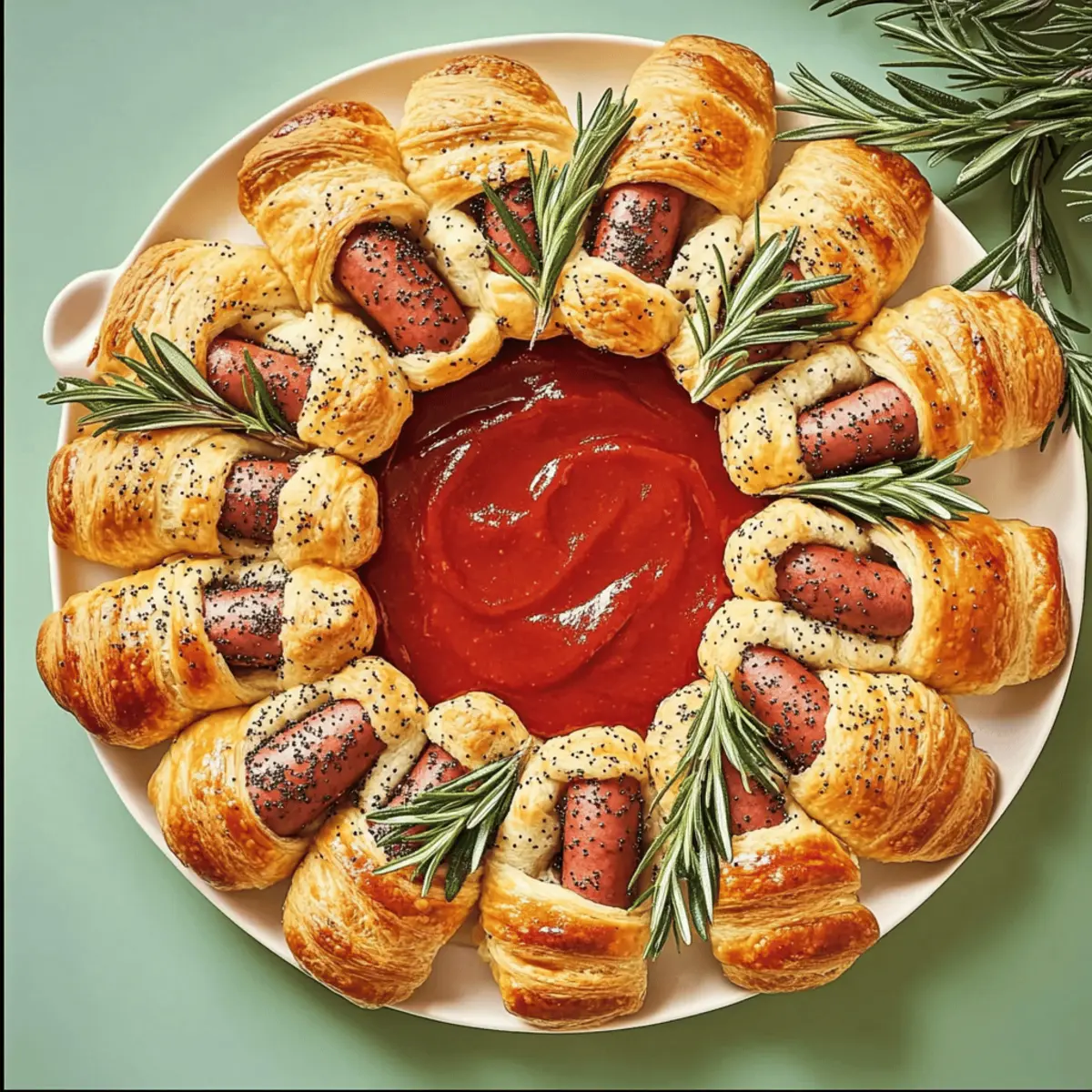 Jump to Recipe Print RecipeAs the aroma of freshly baked goods wafts through my kitchen, I can’t help but feel the excitement of holiday gatherings approaching. One of my favorites is this festive Pigs in a Blanket Wreath, a playful twist on a classic that never fails to bring joy. With simple ingredients and quick prep time, you’ll be able to whip this stunning centerpiece up in under an hour! Each buttery crescent roll wraps around savory mini hot dogs, accented perfectly by a zesty Dijon mustard kick and topped with poppy seeds for that extra crunch. This delightful wreath not only adds cheer to your Christmas dinner spread but also allows you to spend more time with loved ones and less time in the kitchen. Ready to impress your guests? Let’s dive into this delicious recipe! Why is this Pigs in a Blanket Wreath special? Versatility is the name of the game! This festive dish not only shines as a holiday appetizer but can also be adapted for parties year-round. Quick preparation means you can whip it up in under an hour, perfect for those last-minute gatherings. Flavor-packed with the zesty Dijon and sprinkling of poppy seeds, it elevates the traditional pigs in a blanket. Plus, presentation matters—the wreath shape is a showstopper that your guests will admire. Pair it with a variety of dips for a crowd-pleasing experience, and you can even prepare ahead for stress-free entertaining! Pigs in a Blanket Wreath Ingredients For the Wreath Refrigerated crescent rolls – Provides a flaky, buttery dough wrap for the mini hot dogs; puff pastry can be used for a richer texture. Mini hot dogs – The main filling offering savory flavor; consider using vegetarian hot dogs for a meat-free option. Dijon mustard – Adds a tangy depth of flavor when brushed onto the crescent dough; yellow mustard may be used for a milder taste. Egg wash – Creates a golden-brown finish on the baked wreath; alternatively, milk or a dairy-free option works well. Poppy seeds – Enhances flavor and presentation with a slight crunch; flaky sea salt or everything bagel seasoning can substitute them. Rosemary sprigs – Adds an herbal decoration for a festive presentation; though optional, they’re highly recommended for visual appeal. For Dipping Ketchup – A classic dipping option; grainy mustard or ranch dressing also pairs beautifully with the flavors of this Pigs in a Blanket Wreath. Step‑by‑Step Instructions for Pigs In A Blanket Wreath Step 1: Preheat the Oven Begin by preheating your oven to 375°F (190°C), or according to your crescent roll package instructions. This temperature will ensure your Pigs In A Blanket Wreath bakes to a beautifully golden finish. As the oven warms, gather your baking sheet and line it with parchment paper to prevent sticking and for easy cleanup. Step 2: Prepare the Crescent Dough Take your refrigerated crescent rolls and carefully unroll them onto a clean surface. Slice each dough triangle into thirds lengthwise to create strips that will wrap around the mini hot dogs. Make sure to keep the dough cold until you’re ready to work with it to ensure the best flaky texture in your wreath. Step 3: Add Dijon Mustard Brush the inside of each crescent dough strip generously with Dijon mustard. This delicious condiment will add that zesty kick to your Pigs In A Blanket Wreath. Make sure to coat the dough evenly for a flavor boost in every bite, ensuring each mini hot dog will be wrapped snugly in a layer of mustardy goodness. Step 4: Form the Wreath Shape Take a mini hot dog and wrap it tightly with a dough strip, starting from one end and spiraling down to the other. Once wrapped, arrange the hot dog-wrapped crescents in a circular shape on the prepared baking sheet to form a wreath. The wreath shape not only looks festive but enhances the charm of your appetizer presentation. Step 5: Egg Wash and Poppy Seeds In a small bowl, whisk an egg and use a pastry brush to gently coat the entire wreath with the egg wash. This step will give your Pigs In A Blanket Wreath a lovely golden-brown color as it bakes. Sprinkle poppy seeds generously over the wreath for an added crunch and visual appeal before sliding it into the preheated oven. Step 6: Bake to Perfection Bake the wreath in your preheated oven for 20-25 minutes. Keep an eye on it, and look for a golden-brown crust and a deliciously warm aroma filling your kitchen as signs that it’s ready. Be sure to check that the dough is fully cooked, as a flaky crust is the goal for your festive Pigs In A Blanket Wreath. Step 7: Garnish and Serve Once baked, remove the wreath from the oven and let it cool slightly for about five minutes. For a finishing touch, garnish your festive wreath with fresh rosemary sprigs for added color and aroma. Serve warm alongside your favorite dips like ketchup or mustard, and watch your guests delight in this charming holiday appetizer! Pigs In A Blanket Wreath Variations Feel free to get creative with this festive recipe and make it your own! Cocktail Sausages: Swap mini hot dogs for cocktail sausages to bring a different flavor and still keep it bite-sized. Vegetarian Option: Use vegetarian hot dogs for a plant-based twist that everyone can enjoy during the holidays. Cheese-Stuffed Sausages: Replace the hot dogs with cheese-stuffed sausages for an extra burst of flavor. Each bite will be delightfully cheesy and satisfying! Barbecue Sauce: Brush the crescent dough with barbecue sauce instead of Dijon for a smokier, sweeter taste. This twist is perfect for barbecue lovers! Everything Bagel Seasoning: Sprinkle everything bagel seasoning on top before baking for an added layer of deliciousness. It’s a simple way to elevate your wreath’s flavor! Mixed Cheeses: Incorporate a blend of cheeses like mozzarella and cheddar inside for a gourmet touch, creating a melty surprise in every bite. Spicy Mustard: If you love a kick, switch out Dijon for a spicy mustard to bring heat, perfect for those who enjoy bold 