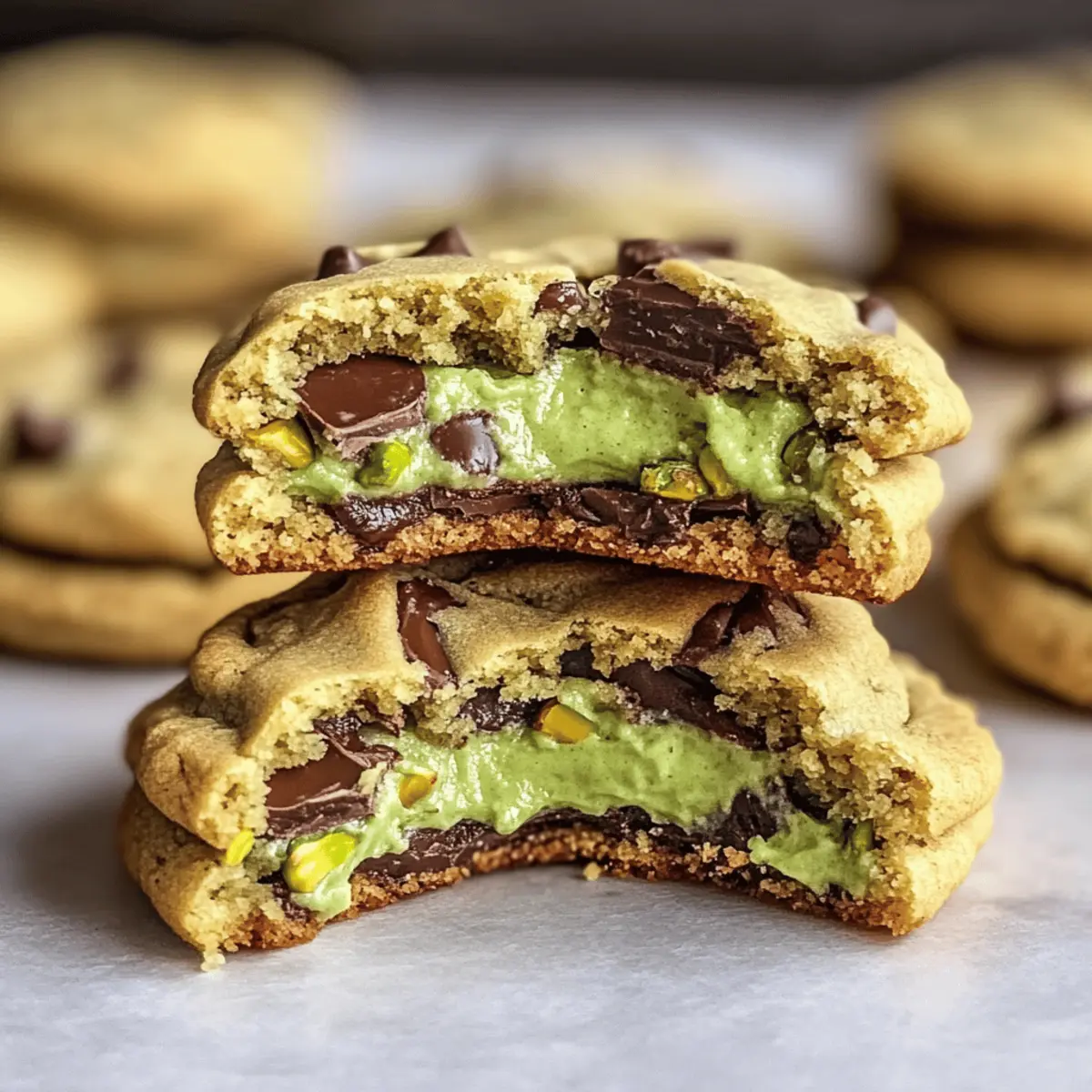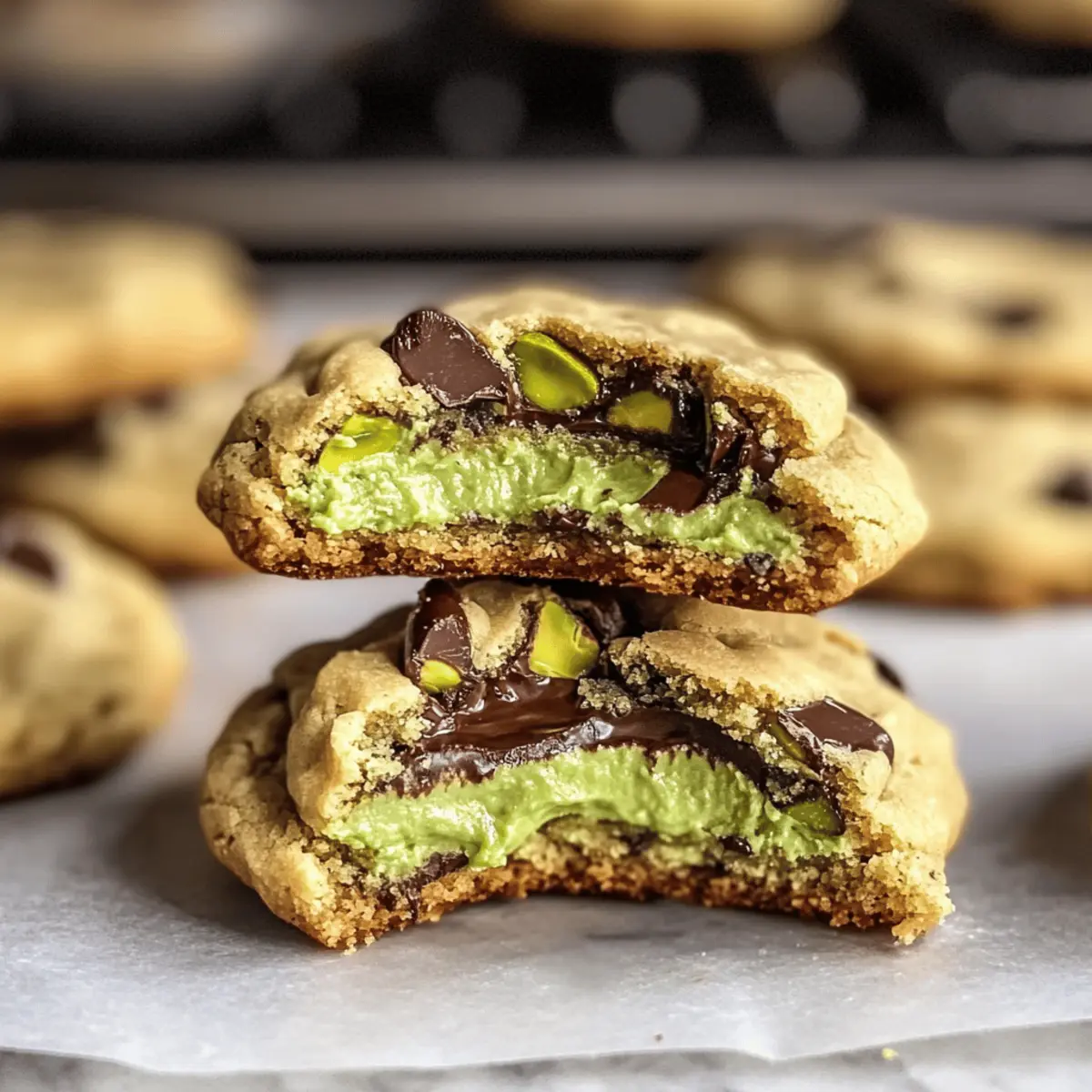 Jump to Recipe Print RecipeAs I stood in my kitchen, the delightful aroma of roasted pistachios wafted through the air, instantly transporting me to a cozy café. These Pistachio Cream Cookies have become my go-to dessert, thanks to their wonderfully chewy texture and a luscious, nutty filling that never fails to impress friends and family. Not only are they quick to whip up, but they also elevate any occasion—from simple afternoon snacks to festive gatherings. As the golden-brown edges hint at the rich chocolate chunks within, I can’t help but smile at the joy they bring. Curious about how to recreate this delicious experience in your own kitchen? Let’s dive into the recipe! Why Are Pistachio Cream Cookies Irresistible? Decadent flavor: The combination of nutty pistachio cream and rich chocolate chunks brings a delightful twist to your standard cookie experience. Easy to Make: With just a few simple ingredients, this recipe is perfect for both novice bakers and seasoned chefs alike. Versatile Option: Whether you enjoy them fresh or want to try variations like almond cream, the sky’s the limit! Perfect Treat: Ideal for any occasion, these cookies are sure to impress at gatherings or provide a cozy afternoon snack. Don’t forget to pair them with a glass of milk for the ultimate indulgence, or explore other delicious cookie recipes like Gingerbread Oatmeal Cookies or Mango Cookies Delightful! Pistachio Cream Cookies Ingredients • For that nutty, rich indulgence in every bite! For the Cookie Dough • All-purpose flour – Essential for structure; you can substitute with gluten-free flour for a gluten-free option. • Baking soda – Acts as a leavening agent; make sure it’s fresh to achieve the perfect rise. • Butter – Adds richness and moisture; unsalted butter or coconut oil works for a dairy-free cookie. • Brown sugar – Provides sweetness and moisture; swap with coconut sugar for a healthier alternative. • Granulated sugar – For that precise sweetness; it’s necessary for the texture and isn’t easily replaceable. • Eggs – Acts as a binding agent for moisture and structure; consider flax eggs for a vegan version. • Vanilla extract – Enhances flavor; pure vanilla is always preferred for the best taste. For the Filling • Pistachio cream – The star of the recipe; homemade will give a fresh taste, but store-bought works too. • Roasted pistachios – Adds delightful texture and flavor; unsalted is best, but walnuts are a fine substitution if needed. • Chocolate chunks – For added sweetness and richness; dark or semi-sweet chocolate can elevate the flavor even more. Creating these Pistachio Cream Cookies is a delicious experience you won’t want to miss! Step‑by‑Step Instructions for Pistachio Cream Cookies Step 1: Prepare Dough In a large mixing bowl, cream together 1 cup of softened butter and ¾ cup each of brown sugar and granulated sugar until the mixture is light and fluffy, about 3-5 minutes. Add 1 large egg and 1 teaspoon of pure vanilla extract, mixing until fully combined. The dough should be smooth and well blended, creating a rich foundation for your Pistachio Cream Cookies. Step 2: Combine Dry Ingredients In a separate bowl, whisk together 2 cups of all-purpose flour and 1 teaspoon of baking soda until evenly mixed. Gradually add the dry ingredients to the wet mixture, stirring gently until just combined. Be careful not to overmix, as this can lead to tougher cookies. The dough will be slightly sticky but should hold together nicely. Step 3: Incorporate Mix-Ins Fold in ½ cup of pistachio cream, ½ cup of chopped roasted pistachios, and ½ cup of chocolate chunks into the cookie dough. Use a spatula to evenly distribute the ingredients, ensuring every cookie has a delightful nutty filling and sweet chocolate. This step enriches the flavor profile of your Pistachio Cream Cookies, making them truly irresistible. Step 4: Chill the Dough Cover the mixing bowl with plastic wrap and refrigerate the dough for at least 30 minutes. This chilling period is crucial as it helps firm up the dough, making it easier to shape and preventing the cookies from spreading too much during baking. While waiting, you can preheat your oven to 350°F (175°C). Step 5: Shape Cookies Once the dough has chilled, remove it from the refrigerator and line a baking sheet with parchment paper. Scoop rounded tablespoons of dough and place them evenly on the prepared baking sheet, leaving about 2 inches of space between each scoop. This spacing allows the Pistachio Cream Cookies to spread perfectly while baking. Step 6: Bake Bake the cookies in your preheated oven for 10-12 minutes, or until the edges are golden brown but the centers remain soft. Keep an eye on them as they bake; the perfect cookie should look slightly underbaked in the center for that chewy texture. The delightful aroma of pistachio and chocolate will fill your kitchen! Step 7: Cool Remove the baking sheet from the oven and let the cookies cool for about 5 minutes on the sheet. This resting time allows them to firm up. Then, transfer the warm cookies to a wire rack to cool completely. Once cooled, you’ll be left with deliciously soft and chewy Pistachio Cream Cookies, ready to be enjoyed! Make Ahead Options These Pistachio Cream Cookies are perfect for meal prep enthusiasts looking to save time in the kitchen! You can prepare the cookie dough up to 24 hours in advance by mixing it and refrigerating it in an airtight container. For even longer storage, you can freeze the dough for up to 1 month—just scoop individual balls onto a parchment-lined baking sheet and freeze them until firm before transferring to a freezer-safe bag. When ready to bake, simply take the dough out and let it thaw in the refrigerator for a few hours or overnight. Bake as directed, ensuring you check the cookies earlier if they’re frozen, to enjoy fresh, delicious Pistachio Cream Cookies without the hassle on busy weekni