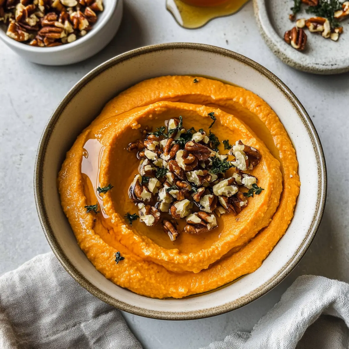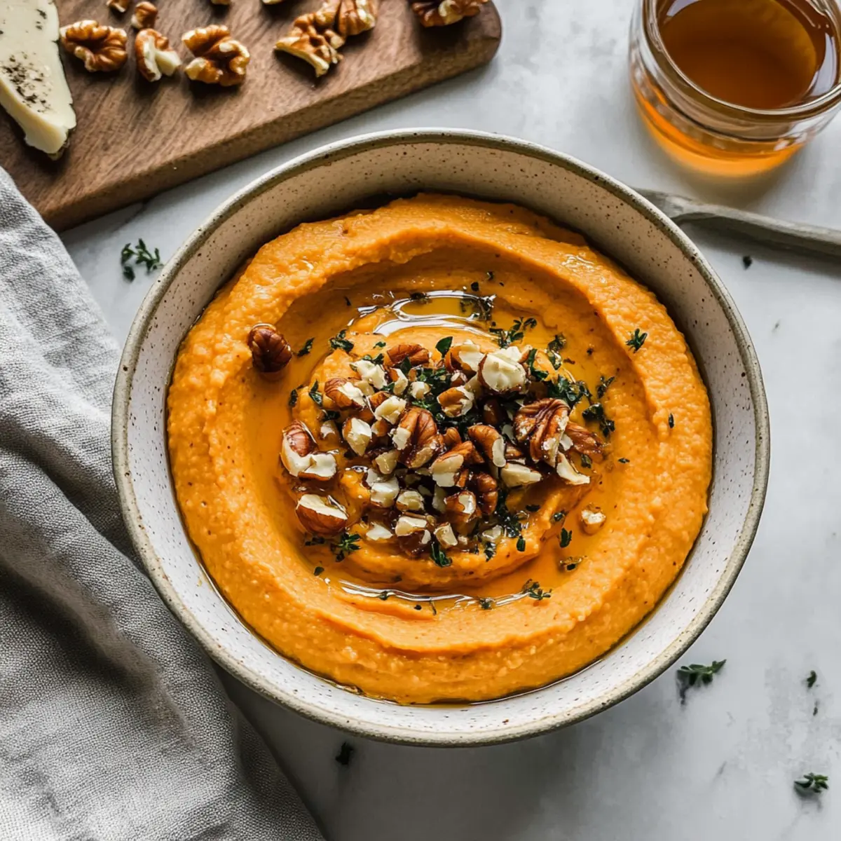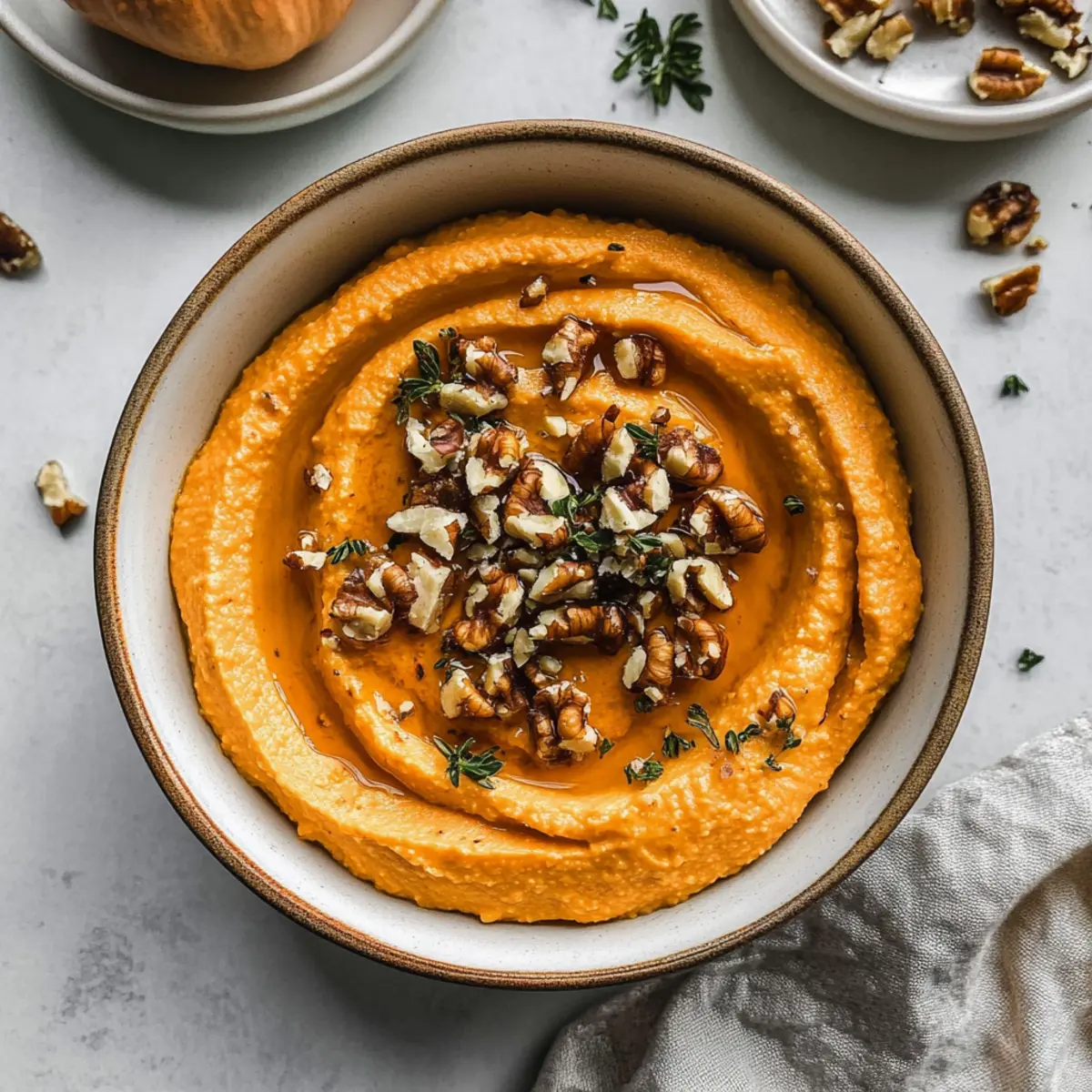 Jump to Recipe Print RecipeThere’s something magical about fall gatherings where the air is filled with laughter and the aroma of warm, inviting food. As the leaves change colors, I love to whip up a seasonal favorite: Pumpkin Whipped Feta Dip. This creamy delight marries the tangy richness of whipped feta with the natural sweetness of honey and the crunch of walnuts, creating a show-stopping appetizer that’s both gluten-free and vegetarian. Perfect for entertaining, it’s an easy-to-make dip that will have your guests coming back for more—whether paired with crusty bread or crisp veggies. Plus, it’s a delightful way to showcase pumpkin’s versatility beyond just desserts. Want to learn how to create this festive treat that tickles the taste buds? Let’s dive into the recipe! Why is Pumpkin Whipped Feta Dip a Must-Try? Irresistible Flavor: This dip combines savory feta and sweet pumpkin, creating a flavor profile that’s as unique as it is delicious. Effortless Preparation: With only a few simple steps, you’ll have an impressive appetizer ready in no time, making it perfect for busy hosts. Crowd-Pleasing Appeal: Everyone loves a good dip, and this one is sure to be the star of your next gathering. Serve with crackers, crusty bread, or even fresh veggies for a satisfying nibble. Nutritional Value: Packed with vitamins from pumpkin and healthy fats from feta, it’s a guilt-free indulgence that feels festive and fun. Make-Ahead Convenience: Prepare your Pumpkin Whipped Feta Dip in advance, so you can focus on enjoying the party! It’ll stay fresh in the fridge, ready to impress. If you want more awesome dip ideas, check out my delicious Spinach Feta Stuffed creation for another flavorful option! Pumpkin Whipped Feta Dip Ingredients For the Dip Feta Cheese – Use block feta stored in brine for the creamiest texture and savory flavor. Plain Greek Yogurt – Helps to balance the saltiness of the feta and adds creaminess; higher fat options yield a silkier dip. Canned Pumpkin Puree – Opt for unsweetened pumpkin puree to provide that delightful sweet and earthy flavor. Honey – Adjust to taste for added sweetness to counter the feta’s saltiness—start with one tablespoon and add more if desired. Dried Thyme – Elevates the dip with a hint of herbal freshness; fresh thyme works wonders too for a vibrant twist. Black Pepper – Freshly cracked adds aromatic spice; adjust to your taste for zingy warmth. Chopped Walnuts – Adds delightful crunch and richness to your dip, use raw or toast them for extra flavor. For Serving Crusty Bread or Crackers – Perfect vehicles for dipping, enhancing your Pumpkin Whipped Feta Dip experience; choose your favorite type! Step‑by‑Step Instructions for Pumpkin Whipped Feta Dip Step 1: Prepare the Base Start by combining a block of feta cheese and plain Greek yogurt in a food processor. Pulse the mixture until it becomes incredibly smooth and creamy, usually around 1-2 minutes. Scrape down the sides with a spatula to ensure everything is well incorporated, creating a luscious base for your Pumpkin Whipped Feta Dip. Step 2: Incorporate Pumpkin and Flavors Next, add the canned pumpkin puree, honey, dried thyme, and freshly cracked black pepper to the food processor. Blend the mixture until smooth and cohesive, which should take another 1-2 minutes. The vibrant orange color will signal that your Pumpkin Whipped Feta Dip is coming together beautifully, combining the delicious flavors perfectly. Step 3: Chill for Optimal Texture Transfer the creamy mixture into a bowl, cover it tightly, and refrigerate it for 30-60 minutes. This chilling step is essential for firming up the dip’s texture, ensuring it’s not too runny when served. This waiting time also allows the flavors to meld into a harmonious blend, enhancing the overall taste of your Pumpkin Whipped Feta Dip. Step 4: Garnish and Serve After the dip has chilled, remove it from the refrigerator and give it a quick stir. Transfer the chilled dip to a serving bowl and top it with chopped walnuts, a drizzle of honey, leaves of fresh thyme, and a sprinkle of additional black pepper for visual appeal. This festive garnish adds color and enticing aromas to your Pumpkin Whipped Feta Dip. Step 5: Choose Your Dippers Finally, prepare to serve your flavorful Pumpkin Whipped Feta Dip alongside crusty bread, crackers, or fresh vegetables such as carrot sticks and bell pepper slices. Arrange everything on a stylish serving platter, making it inviting for your guests. Enjoy the delightful creaminess and vibrant flavors as everyone digs into this exceptional appetizer! Pumpkin Whipped Feta Dip Variations Feel free to let your creativity shine and customize this dip with these delicious twists! Creamy Alternative: Substitute Greek yogurt with light sour cream for a richer, slightly tangy flavor that adds smoothness. Spicy Kick: Mix in a pinch of cayenne pepper or smoked paprika to elevate the heat level for those who love a little spice. Nutty Flavor Boost: Incorporate a tablespoon of tahini for an extra layer of nutty richness that pairs beautifully with pumpkin. Herb Variations: Swap dried thyme for fresh herbs like basil or cilantro to bring a new aromatic element to the dip. Sweet Surprise: For a delightful topping, sprinkle pomegranate seeds over the dip to add a burst of sweetness and vibrant color. Savory Garlic Infusion: Add roasted garlic for a mellow, sweet flavor that complements the feta perfectly, enhancing the dip’s savory profile. Extra Crunch: Use toasted pecans or almonds in place of walnuts for a unique crunchy texture and a different nutty flavor. Gourmet Cream Cheese: For creaminess with a twist, try using whipped cream cheese instead of feta for a milder, smoother dip. If you’re curious about more ways to elevate your appetizer game, be sure to check out my delightful Spinach Feta Stuffed creation for another delectable option! What to Serve with Pumpkin Whipped Feta Dip? As yo