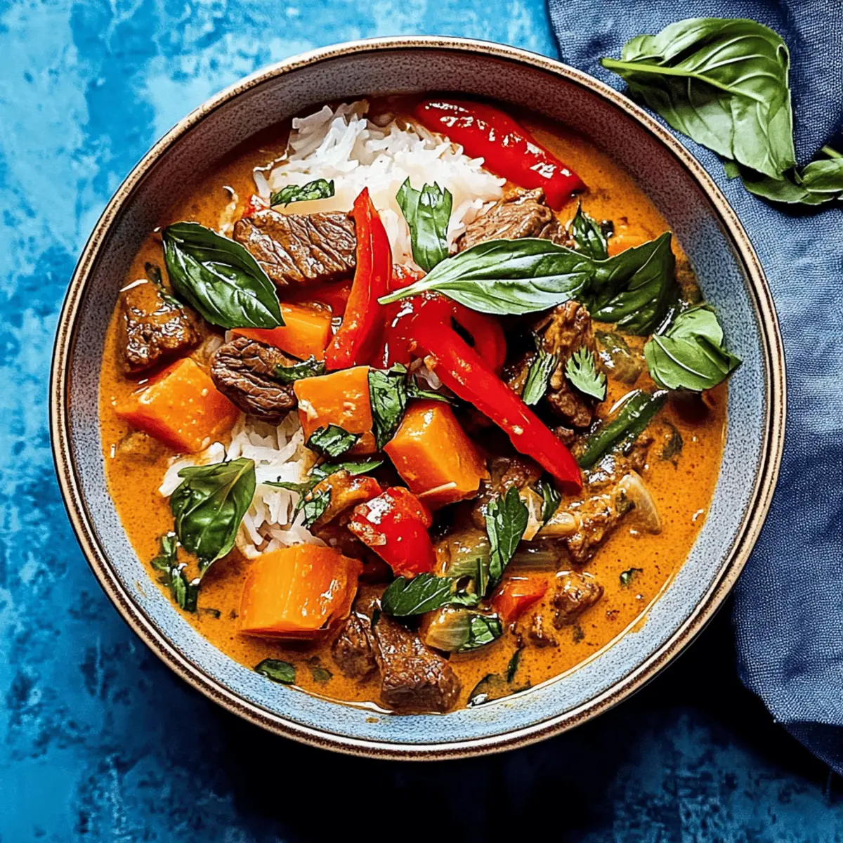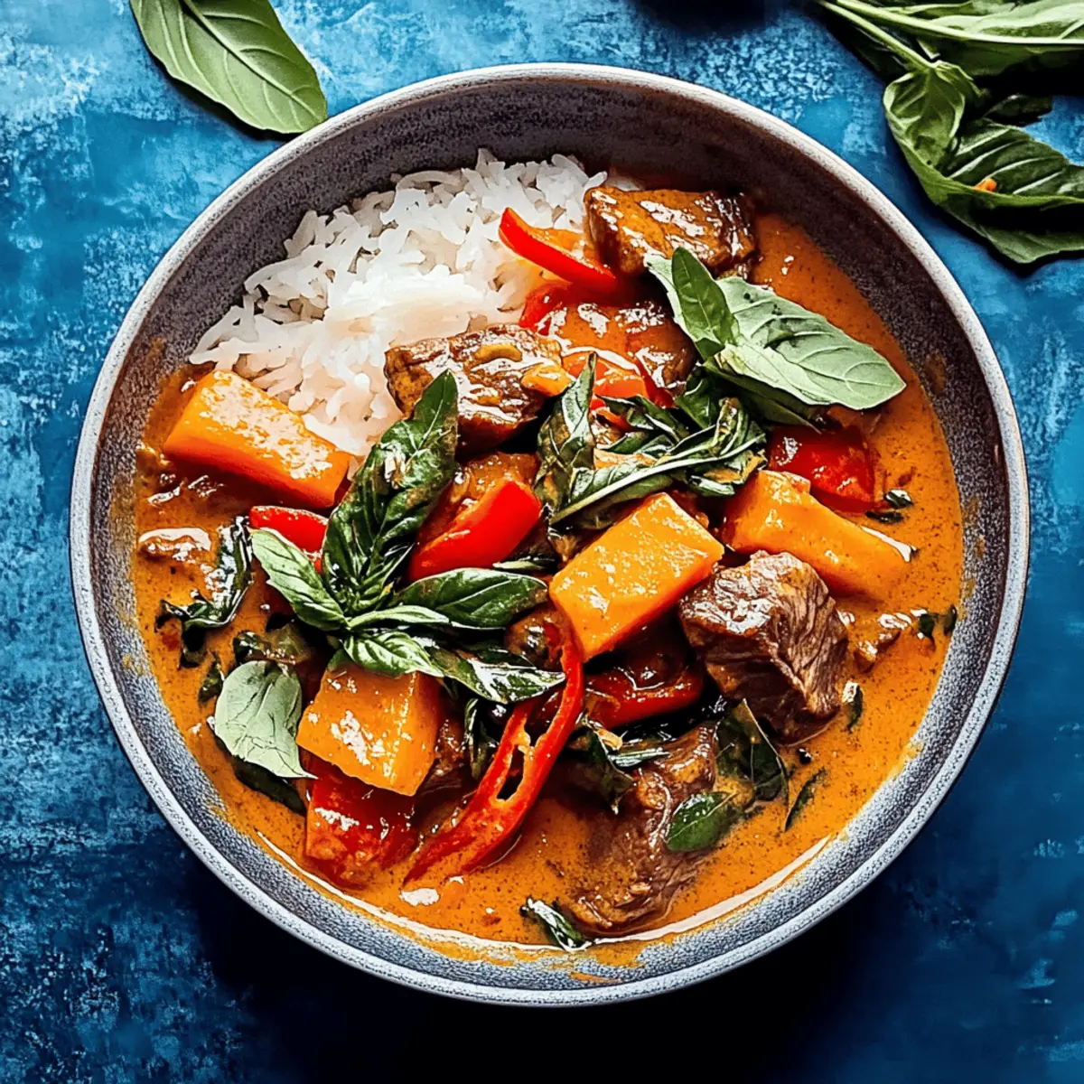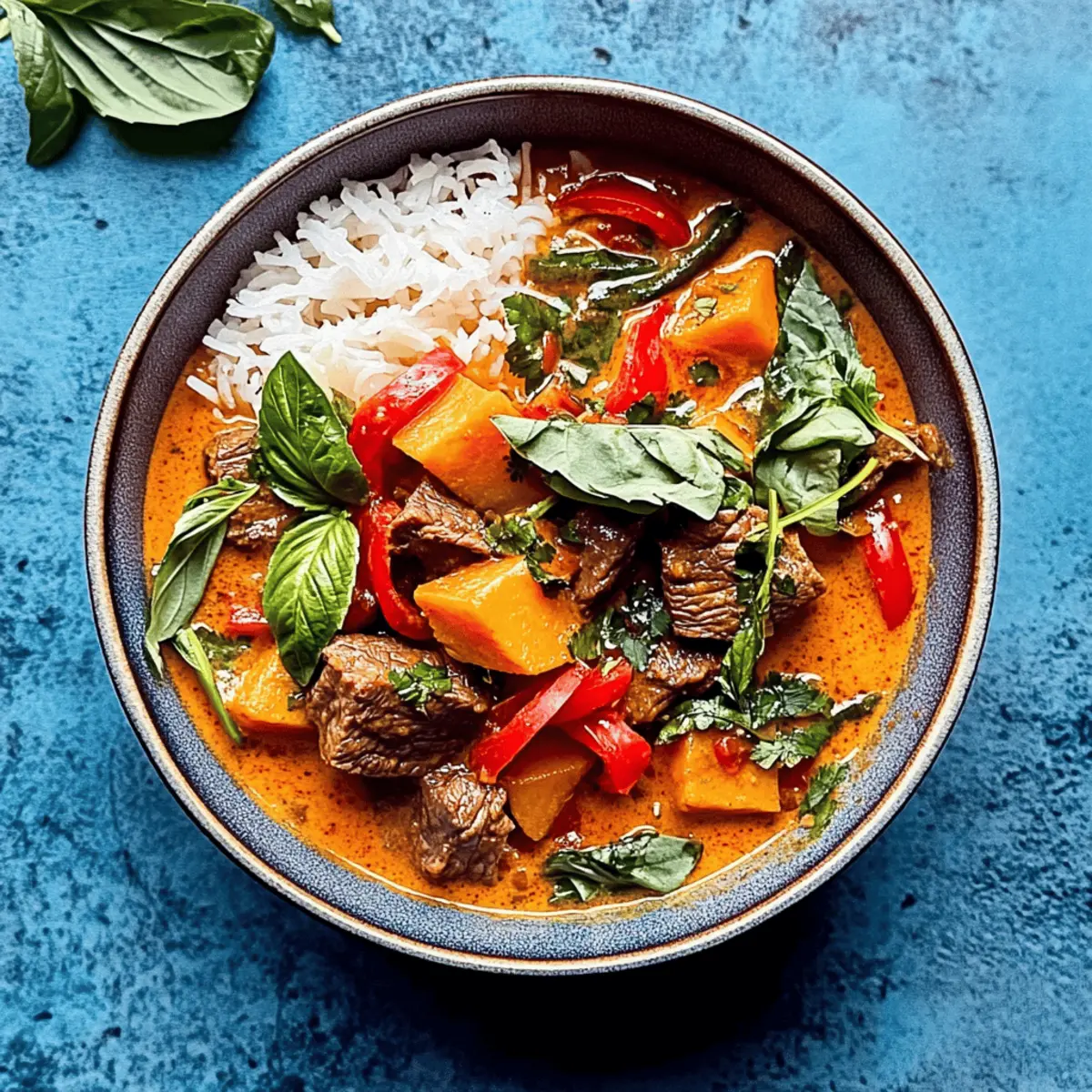 Once the sweet potatoes and bell peppers are cooked to your liking, remove the pot from heat. Serve this comforting Red Curry Beef over a bed of fluffy rice. For a touch of freshness, garnish each serving with chopped fresh cilantro, Thai basil, and the optional addition of sliced Thai chilies for an extra kick of heat.