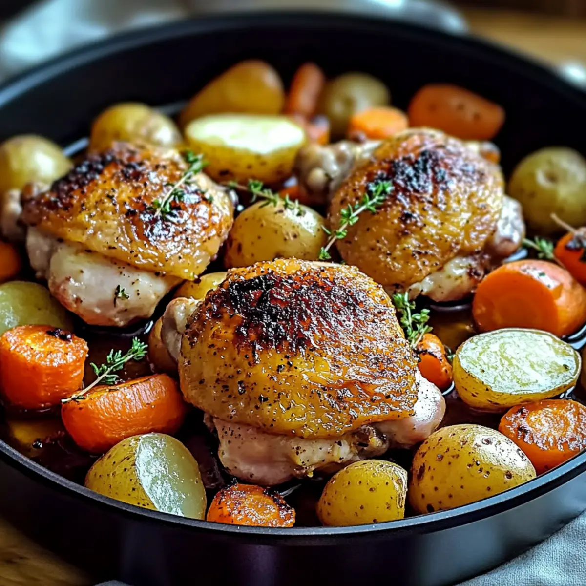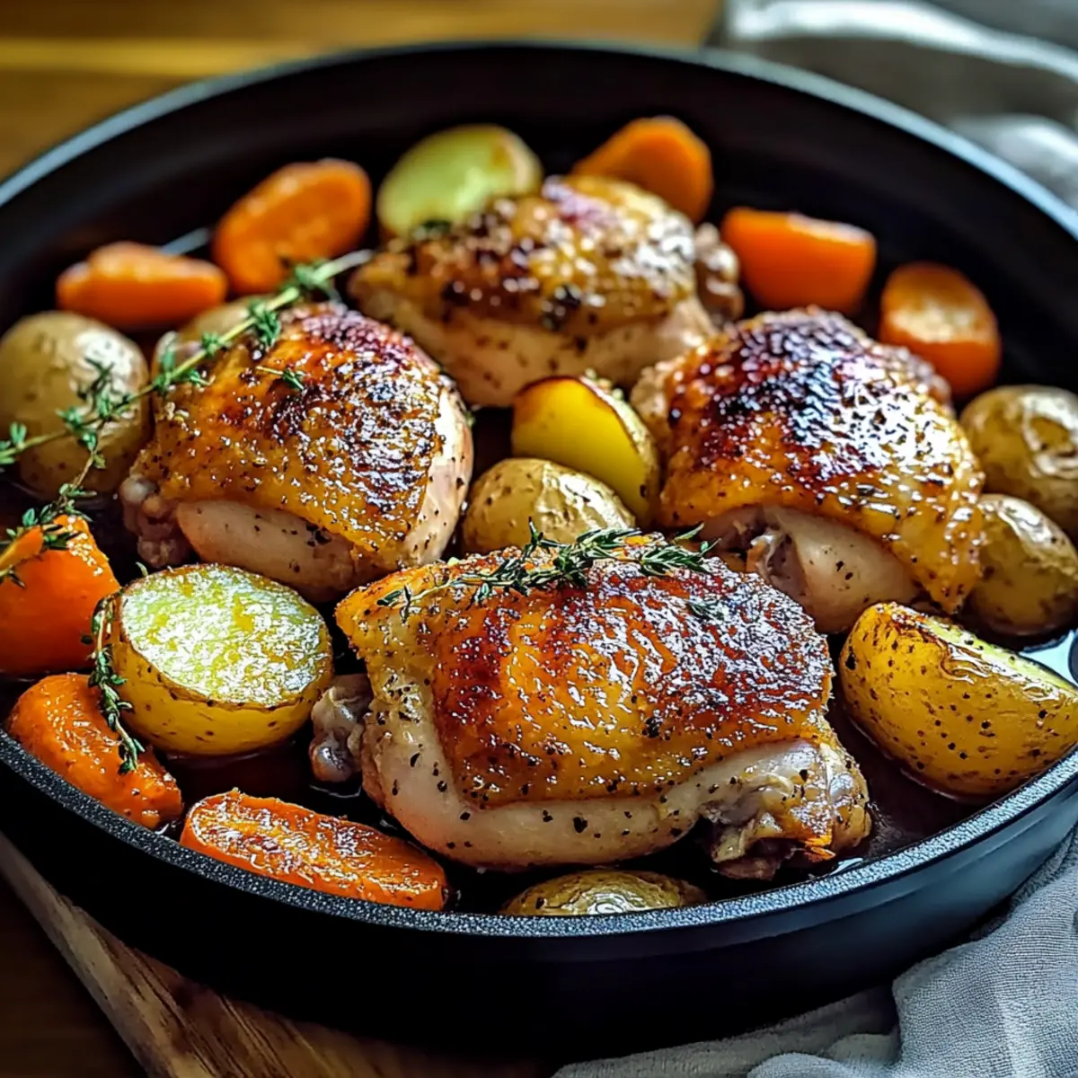 Jump to Recipe Print RecipeAs I stepped into my kitchen on a busy weeknight, the chaos of the day melted away with the enticing scent of One-Pan Roasted Chicken Thighs with Carrots and Potatoes. This dish transforms any hurried evening into a cozy family feast in under an hour. Not only does it deliver deliciously crispy-skinned chicken alongside tender, caramelized vegetables, but it’s also a gluten-free, family-friendly meal that everyone will love. With minimal cleanup thanks to the one-pan method, you’ll have more time to savor those precious moments at the table. Ready to create a comforting, satisfying dinner that warms both hearts and bellies? Let’s dive into this delightful recipe! Why Are One-Pan Meals So Popular? Ease of Preparation: This recipe simplifies dinner time—you’ll achieve a hearty meal with minimal effort in just one pan! Flavor Explosion: The blend of spices and herbs elevates the chicken while the vegetables soak up all the delectable juices for a mouthwatering experience. Customizable Options: Feel free to swap out ingredients according to your family’s preferences or seasonal produce; you can make it your own every time. Perfect for Busy Nights: Ready in under an hour, you can reunite with loved ones around the dining table without long hours in the kitchen. Crowd-Pleasing Delight: Serve it at family gatherings or dinner parties, and watch everyone come back for seconds! You’ll find it pairs beautifully with a fresh side salad, just like with my Garlic Chicken Thighs or the comforting BBQ Chicken Mac. Roasted Chicken Thighs Ingredients • Your perfect guide to a delicious meal! For the Chicken Bone-in Chicken Thighs – Offers juicy, flavorful meat; you can substitute with skinless chicken breasts for a lighter variant. Olive Oil – Essential for achieving golden-brown color and enhancing flavor; no direct substitutes. Salt – Enhances all the natural flavors; adjust according to taste preferences. Pepper – Adds a dash of warmth; feel free to customize the amount to suit your palate. Garlic – Fresh garlic brings a delightful aroma; can be swapped with 1/4 teaspoon of garlic powder for each clove substitute. Dried Thyme – Elevates the savory taste; fresh thyme can be used—just remember to adjust since it’s more potent. Dried Rosemary – Introduces a fragrant herbaceous note; fresh rosemary is a great swap, adjusting for its stronger flavor. For the Vegetables Yukon Gold Potatoes – Provides a creamy texture; substitute with sweet potatoes if you desire a touch of sweetness. Carrots – Their natural sweetness brightens the dish; no direct substitutes, as they are integral to the flavor profile. This comforting dish of Roasted Chicken Thighs with Carrots and Potatoes is sure to become a family favorite! Step‑by‑Step Instructions for One-Pan Roasted Chicken Thighs with Carrots and Potatoes Step 1: Preheat Oven Begin by preheating your oven to 425°F (220°C). While the oven warms up, line a large baking sheet with parchment paper to facilitate easy cleanup and enhance the roasting process. This essential step ensures that your Roasted Chicken Thighs with Carrots and Potatoes cook evenly and develop a wonderfully crispy skin. Step 2: Prepare Chicken Next, pat your bone-in chicken thighs dry using paper towels to help achieve that golden skin. Drizzle the chicken with olive oil, ensuring it’s evenly coated. Season generously with salt, pepper, minced garlic, dried thyme, and rosemary, creating a fragrant marinade. This blend will infuse the chicken with flavor as it roasts to perfection. Step 3: Prepare Vegetables Now it’s time to prep your vegetables! Cut the Yukon Gold potatoes into bite-sized cubes and slice the carrots into uniform 1-inch pieces to ensure even cooking. Toss the veggies in a bowl with a bit of olive oil, salt, and pepper, letting your senses delight in the blend of colors and freshness. This combination adds a lovely sweetness to your dish. Step 4: Arrange on Baking Sheet Carefully place the seasoned chicken thighs skin-side up on the prepared baking sheet, ensuring they have space around them. Nestle the seasoned carrots and potatoes around the chicken, spreading them out to prevent overcrowding. This arrangement allows the heat to circulate evenly, ensuring your Roasted Chicken Thighs with Carrots and Potatoes turn out beautifully crispy and tender. Step 5: Roast Slide the baking sheet into your preheated oven and roast for 35-40 minutes. Keep an eye on the chicken; it should reach an internal temperature of 165°F (74°C) when done, and the skin will be golden brown. The aroma wafting through your kitchen will signal that dinner is almost ready, enhancing the anticipation for a comforting meal. Step 6: Rest Chicken Once your chicken and vegetables are perfectly roasted, remove the baking sheet from the oven and let the chicken rest for about 5 minutes. Resting allows the juices to redistribute within the meat, resulting in juicy, flavorful chicken. This brief moment of patience before serving enhances the deliciousness of your Roasted Chicken Thighs with Carrots and Potatoes. Step 7: Serve Finally, present your one-pan masterpiece directly from the baking sheet for a rustic, family-style meal. The vibrant colors and inviting aroma of your Roasted Chicken Thighs with Carrots and Potatoes will have everyone gathering around the table, eager to dig in and enjoy this delightful dish together. What to Serve with One-Pan Roasted Chicken Thighs with Carrots and Potatoes As you prepare to savor the rich flavors of your hearty chicken dish, consider how to round out your meal for even more comfort and satisfaction. Crispy Green Salad: A refreshing salad with mixed greens and a bright vinaigrette balances the roasted flavors, adding a crisp texture that’s incredibly satisfying. Garlic Bread: Toasted garlic bread perfectly complements the dish, offering a crunchy, buttery bite that’s perfect for sopping up juices. S