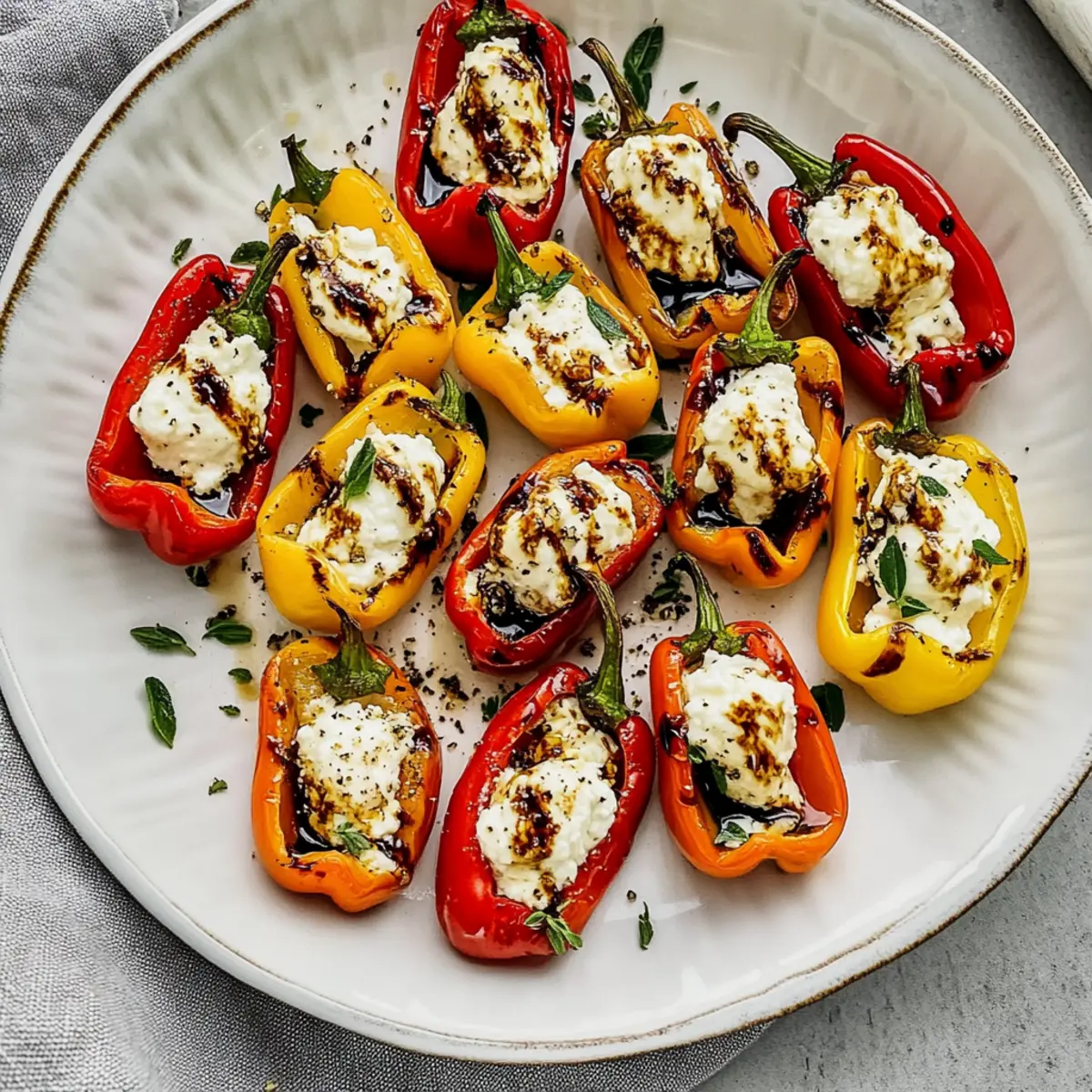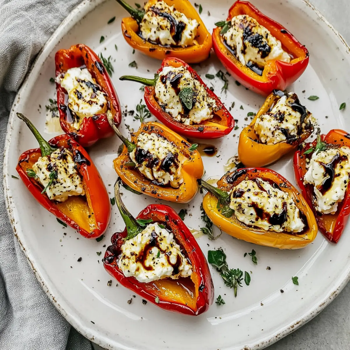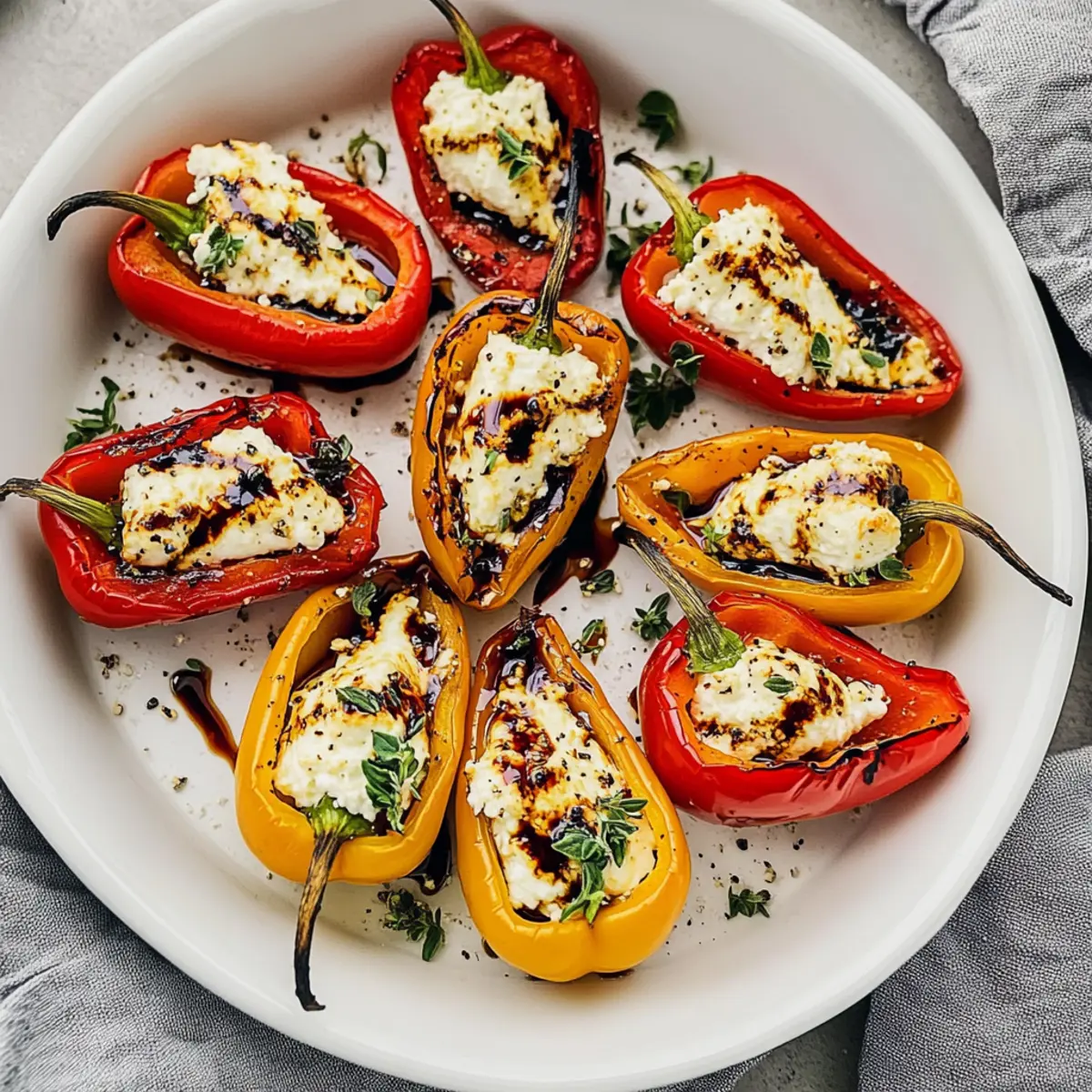 Jump to Recipe Print RecipeAs the sun sets and friends gather around, there’s nothing quite like the aroma of baked mini peppers wafting through the air. My Balsamic Goat Cheese Stuffed Mini Peppers have become a go-to in my kitchen, and I’m excited to share them with you. Not only are these roasted delights a gluten-free and vegetarian treat, but they also take just minutes to prepare, making them perfect for any spontaneous get-together. The combination of creamy goat cheese with a touch of balsamic glaze and honey creates a flavor explosion you won’t want to miss. Plus, they can be prepped ahead of time, leaving you free to mingle or enjoy that first glass of wine. Are you ready to elevate your appetizer game? Let’s dive into this colorful and satisfying dish! Why Are These Mini Peppers So Irresistible? Bursting with Flavor: Each bite is an exciting blend of sweet, tangy, and savory goodness that will have everyone coming back for more. Quick and Easy: With minimal prep and just 20-25 minutes in the oven, you’ll have a delightful dish that impresses and satisfies. Customizable to Your Taste: Feel free to experiment with different cheeses or toppings! Whether it’s crumbled bacon or a hint of heat from hot honey, you can make it your own. Healthy and Guilt-Free: Gluten-free and vegetarian, these peppers are a nutritious snack packed with vitamins and healthy fats, perfect for any occasion. Perfect for Any Gathering: Whether it’s a casual dinner or a lively party, these mini peppers are an eye-catching appetizer that guests will adore, much like our Teriyaki Pineapple Peppers or Chili Cheese Dog Casserole. Get ready to impress your friends with this easy, flavorful treat! Roasted Goat Cheese Stuffed Mini Peppers Ingredients For the Peppers • Mini Sweet Bell Peppers – These colorful beauties are the star of the dish, offering a sweet, crunchy texture. For the Filling • Goat Cheese – This creamy, tangy cheese creates a luscious filling; feel free to use flavored varieties for an extra kick! • Balsamic Glaze – A drizzle enhances the flavor with a perfect balance of sweetness and acidity; store-bought is a great time-saver! • Honey – Adds a touch of natural sweetness; consider using hot honey for a spicy twist. • Fresh Thyme – An aromatic herb that elevates the dish’s flavor; dried thyme can be a good substitute, though fresh is preferred. • Black Pepper – A simple spice that complements the filling nicely; omit if you prefer a milder flavor. Get ready to savor these roasted goat cheese stuffed mini peppers that are gluten-free, vegetarian, and oh-so-delicious! Step‑by‑Step Instructions for Roasted Goat Cheese Stuffed Mini Peppers Step 1: Preheat and Prepare Peppers Begin by preheating your oven to 400°F (200°C). While the oven warms up, wash and dry 12 mini sweet bell peppers. Cut each pepper in half lengthwise and gently remove the seeds and white membranes, allowing for a smooth surface to hold the delicious goat cheese filling. Step 2: Stuff Peppers with Goat Cheese In a mixing bowl, take 4 ounces of goat cheese and use a fork to soften it slightly. Carefully fill each pepper half with goat cheese, pressing gently to pack it in, ensuring no gaps remain. You can adjust the amount based on your personal preference—don’t be shy to heap a little extra for that creamy goodness! Step 3: Bake the Stuffed Peppers Arrange the stuffed mini peppers in a single layer on a baking dish, ensuring they’re not overcrowded. Roast them in the preheated oven for 20-25 minutes, or until they appear lightly browned and tender. You’ll know they’re done when the peppers are slightly caramelized, and the cheese is wonderfully warm. Step 4: Drizzle with Balsamic Glaze Once the roasted goat cheese stuffed mini peppers are out of the oven, let them cool for a minute. Drizzle each pepper with a bit of balsamic glaze and honey, allowing the sweetness to complement the savory filling. Step 5: Garnish and Serve Finish by sprinkling a few fresh thyme leaves and a pinch of black pepper over the top of each pepper. This final touch enhances both flavor and presentation, making your roasted goat cheese stuffed mini peppers ready to impress your guests. Serve them warm and watch as everyone delights in this vibrant appetizer! What to Serve with Balsamic Goat Cheese Stuffed Mini Peppers Elevate your gatherings with delightful sides that complement the sweet, savory depth of these mini pepper appetizers. Crispy Garden Salad: A fresh salad with mixed greens and a citrus vinaigrette adds a bright, crunchy contrast to the creamy stuffing of the peppers. The refreshing notes cleanse the palate beautifully. Herbed Quinoa: Fluffy, protein-packed quinoa tossed with fresh herbs and lemon pairs wonderfully with these stuffed peppers, creating a satisfying and nutritious meal that everyone will enjoy. Garlic Bread: Serve warm, buttery garlic bread alongside for a delightful crunch. The rich flavors of the bread balance perfectly with the sweetness of the peppers. Whipped Feta Dip: This creamy dip offers a tangy complement, perfect for dipping your roasted pepper bites or fresh veggies. A touch of olive oil and herbs can elevate the flavors even further. Roasted Vegetable Medley: Seasonal veggies drizzled with olive oil and herbs bring a colorful, hearty addition that echoes the roasted nature of the peppers. The varied textures keep every bite exciting! Chilled White Wine: A crisp Sauvignon Blanc or a refreshing Prosecco enhances the meal’s lively flavors, making it perfect for gatherings. The acidity plays well with the creaminess of the goat cheese. Chocolate-Dipped Strawberries: For dessert, serve chocolate-dipped strawberries to cap off the meal with a sweet, decadent finish. The fruity sweetness mirrors the honey drizzled on the peppers. With these pairings, your Balsamic Goat Cheese Stuffed Mini Peppers will shine as the centerpiece of a foolproof, crowd-pleasing feast! Ex