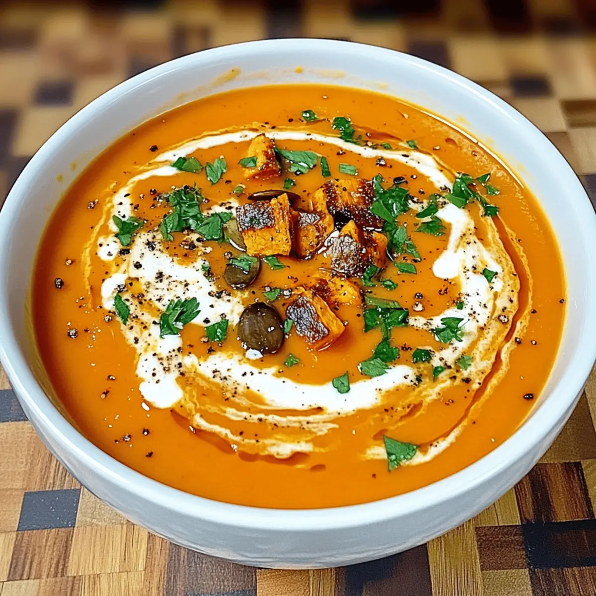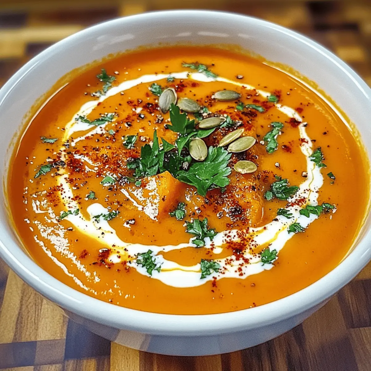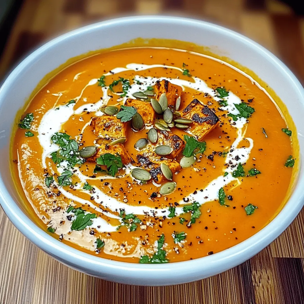 Jump to Recipe Print RecipeAs the cool breeze of autumn whispers through the trees, there’s nothing quite like curling up with a bowl of warm soup. Enter my Creamy Roasted Sweet Potato Soup with Coconut Milk, a dish that beautifully marries the natural sweetness of roasted sweet potatoes with the richness of coconut milk. This versatile recipe is not only easy to whip up but also a comforting go-to for busy weeknights or lazy weekends. Plus, you can customize it with your favorite toppings and spices, allowing you to create a unique experience every time you serve it. So, who’s ready to dive into this cozy bowl of pure bliss? Your taste buds will thank you! Why is This Soup So Irresistible? Comforting warmth: This Roasted Sweet Potato Soup envelops you in cozy vibes, making it perfect for any chilly evening or relaxed weekend. Easy to make: With just a handful of ingredients and simple steps, you can whip up a delicious soup in no time. Versatile flavors: Customize your soup with various toppings or spices—think toasted pumpkin seeds or a drizzle of hot sauce for an extra kick! Healthy goodness: Packed with vitamins A and C, it’s a nutritious way to enjoy comfort food without guilt. Endless adaptations: Feel free to experiment with ingredients like carrots or coconut milk, or even swap the broth for a rich vegetable option to suit your preferences. Dive into this comforting delight and discover why it’s one of my go-to recipes! Roasted Sweet Potato Soup Ingredients For the Soup Base • Sweet Potatoes – Adds natural sweetness and creamy texture; substitute with butternut squash for a different flavor. • Onion – Provides aromatic base flavor; use shallots for a milder taste. • Carrots – Enhances sweetness and adds color; parsnips can be used for a more earthy taste. • Celery – Contributes to the flavor base; omit if you prefer a simple profile. • Garlic – Delivers robust flavor; garlic powder can be used as a substitute (1 clove = 1/8 tsp). • Olive Oil – Used for sautéing vegetables; coconut oil gives a richer flavor if preferred. • Ground Cumin – Adds warmth and depth; coriander is a great substitute for a different spice profile. • Smoked Paprika – Provides a smoky flavor; regular paprika works well for a milder option. • Cayenne Pepper – Optional for heat; feel free to omit if you prefer a milder soup. • Vegetable Broth or Chicken Broth – Liquid base for the soup; go gluten-free with specific broths if needed. • Coconut Milk – Adds creaminess and richness, making this Roasted Sweet Potato Soup simply divine; cashew cream can be used as a nut-based alternative. • Salt and Pepper – Enhances overall flavors; adjust according to your taste. For Optional Garnishes • Toasted Pumpkin Seeds – Adds crunch and a nutty flavor contrast; an excellent source of healthy fats. • Fresh Cilantro – Delivers a burst of freshness; consider parsley if cilantro isn’t your favorite. • Crème Fraîche or Greek Yogurt – Provides a creamy texture and tang; a dollop on top elevates every bowl! Step‑by‑Step Instructions for Roasted Sweet Potato Soup Step 1: Prep the Vegetables Begin by peeling and cubing 2 large sweet potatoes into small, even pieces so they cook uniformly. Then, chop 1 onion, 2 carrots, and 2 celery stalks, ensuring they’re diced finely for an aromatic base. Finally, mince 2 cloves of garlic to introduce robust flavor to your Roasted Sweet Potato Soup. Set all the prepared vegetables aside, ready for cooking. Step 2: Sauté Aromatics In a large pot, heat 2 tablespoons of olive oil over medium heat. Once hot, add the chopped onion, carrots, and celery, sautéing for 5–7 minutes until they soften and the onion becomes translucent. Next, stir in the minced garlic, 1 teaspoon of ground cumin, and 1 teaspoon of smoked paprika, cooking for an additional minute until fragrant and golden. Step 3: Cook Sweet Potatoes Add the prepared sweet potato cubes to the pot along with 4 cups of vegetable broth. Raise the heat to bring the mixture to a boil. Once boiling, reduce the heat to low, cover the pot, and let it simmer for 20–25 minutes, or until the sweet potatoes are fork-tender and readily break apart when tested with a fork. Step 4: Blend the Soup After cooking, carefully remove about one-third of the soup and set it aside in a bowl. Use an immersion blender to puree the remaining soup in the pot until it becomes smooth and creamy, ensuring there are no large chunks left. If you don’t have an immersion blender, carefully transfer the hot soup to a regular blender in batches, blending until silky. Step 5: Combine Ingredients Once blended, return the reserved soup back to the pot and stir in a can (13.5 oz) of coconut milk for that creamy richness. Season with salt and pepper to taste, simmering gently for another 5 minutes. This step allows the flavors of the Roasted Sweet Potato Soup to meld beautifully together. Step 6: Serve and Garnish Ladle the velvety Roasted Sweet Potato Soup into bowls, and feel free to garnish with your choice of toasted pumpkin seeds, fresh cilantro, or a dollop of crème fraîche for added texture and flavor. Serve hot, ideally accompanied by crusty bread or a light salad for a complete meal experience. Expert Tips for Roasted Sweet Potato Soup Even Sizes: Ensure your sweet potatoes are cut into uniform pieces for even cooking, helping them to blend smoothly into the soup. Blending Safety: When using a regular blender, blend in batches to prevent pressure buildup and ensure safety. Vent the lid slightly while blending. Flavor Boost: Let the soup simmer longer after adding the coconut milk to enhance flavors, making your Roasted Sweet Potato Soup even more delicious. Spice Adjustments: Feel free to taste and adjust the spices throughout the cooking process; remember, it’s easier to add than to take away. Garnish Variety: Consider mixing up toppings for each serving; toasted pumpkin seeds, fresh 