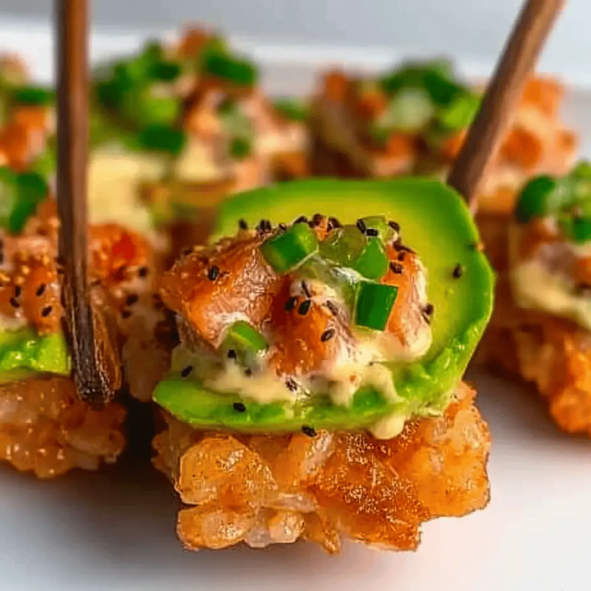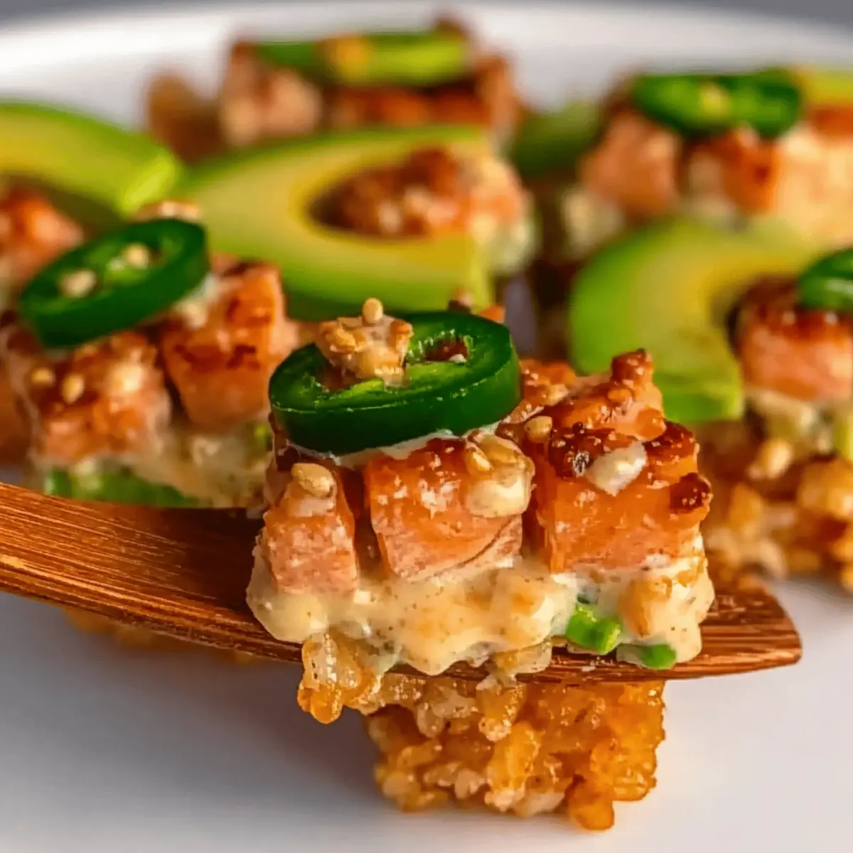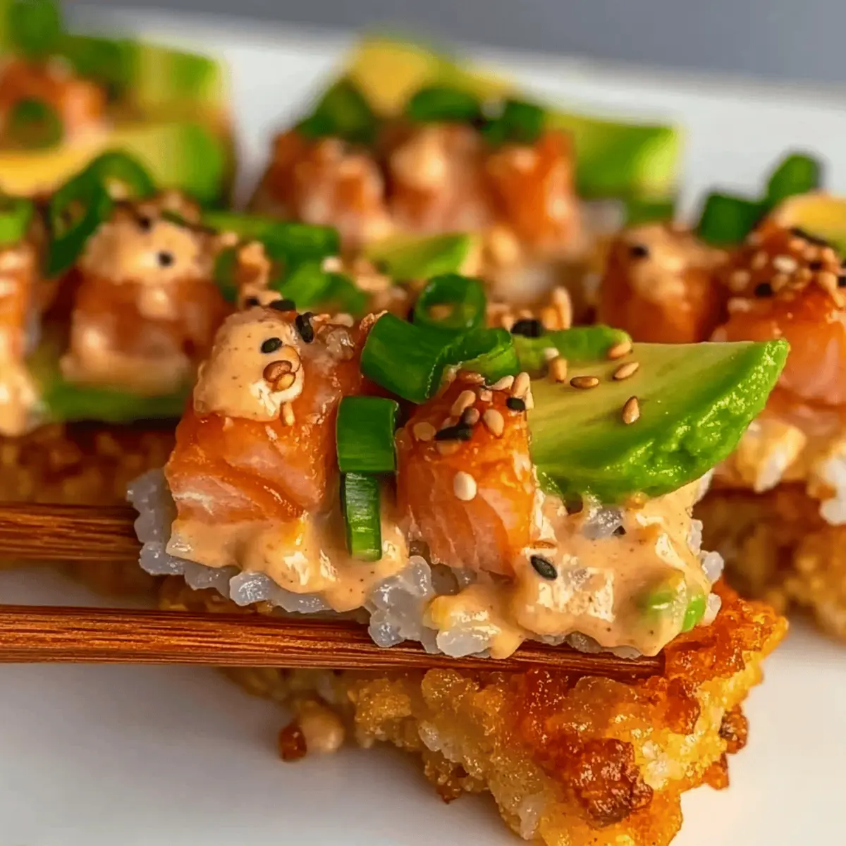 Jump to Recipe Print RecipeAs I bit into the golden crispy rice topped with creamy salmon, I was instantly transported to a bustling izakaya in Tokyo, where flavors dance and mingle with the rhythm of lively chatter. This Crispy Rice with Spicy Salmon is my delicious take on a trendy Japanese fusion appetizer that’s not only simple to make but sure to impress your guests. It combines the satisfying crunch of fried sushi rice with a zesty, spicy salmon topping, making it a perfect choice for your next gathering or a cozy night in. Plus, it’s a healthier alternative that brings your palate a taste of gourmet while being incredibly easy to whip up! Are you ready to elevate your appetizer game with this delightful dish? Why is Salmon Crispy Rice a must-try? Irresistible Crunch: The harmonious contrast of crispy rice against the creamy, spicy salmon creates a mouthwatering experience that will have everyone coming back for more. Easily Customizable: You can easily tweak the toppings to suit your taste—try adding mango slices for sweetness or swapping salmon for tuna if you prefer. Quick and Simple: This recipe is perfect for busy evenings or last-minute gatherings, making it an easy go-to for impressing guests without spending hours in the kitchen. Healthier Choice: Enjoy the flavors of a trendy Japanese appetizer while skipping the fast food—this is a delightful yet nutritious option! Crowd-Pleaser: Whether you’re hosting a party or planning a cozy night in, this dish is sure to wow your guests and leave them raving. Explore more delightful seafood options with our Bang Bang Salmon or try a tasty Smoked Salmon Cottage to keep your culinary creativity flowing! Salmon Crispy Rice Ingredients For the Rice • Cooked Sushi Rice – Essential for texture; use short-grain rice to achieve optimal stickiness when frying. • Rice Vinegar – Adds acidity and flavor; can substitute with apple cider vinegar for a different taste. • Sugar – Balances the acidity of vinegar; substitute with honey for a natural sweetness. • Salt – Enhances flavor; sea salt works great as a substitute. • Vegetable Oil – Necessary for frying; can use any neutral oil like canola or grapeseed. For the Salmon Topping • Sushi-grade Salmon – Provides the main protein and flavor; ensure freshness and consider substituting with tuna for a different variation. • Kewpie Mayo – Adds creaminess and umami flavor; regular mayonnaise can be used but may lack the distinct taste. • Sriracha – Brings heat; adjust amount based on your spice preference. • Scallion – Adds freshness and flavor; can substitute with chives or green onions. • Soy Sauce – Contributes a deep umami flavor; consider tamari for a gluten-free option. • Sesame Oil – Offers a nutty flavor; can replace with olive oil if unavailable. For the Garnish • Sliced Avocado – Provides creaminess and enhances presentation; optional but highly recommended. • Jalapeno – Adds extra heat; feel free to omit for a milder version. • Black and White Sesame Seeds – Adds texture and visual appeal; recommended for garnish but can be omitted. Ready to take your appetizer game to the next level? These ingredients are your stepping stones to creating the delightful Salmon Crispy Rice that everyone will love! Step‑by‑Step Instructions for Salmon Crispy Rice Step 1: Prepare the Seasoned Rice In a small bowl, whisk together rice vinegar, sugar, and salt until fully dissolved. Carefully fold this mixture into your cooked sushi rice to ensure even seasoning. Aim for a light, sticky texture that’s essential for shaping the rice later. Once well mixed, transfer the seasoned rice to a lined baking pan, spreading it out evenly. Step 2: Chill the Rice Press the seasoned rice down firmly into the baking pan to create an even layer. Cover the pan with plastic wrap and refrigerate it for at least 4 hours, or preferably overnight. This chilling step is crucial as it helps the rice firm up, making it easier to cut into perfect shapes for your Salmon Crispy Rice appetizer. Step 3: Prepare the Salmon Mixture Once the rice has chilled, take your sushi-grade salmon and chop it into small, bite-sized pieces. In a mixing bowl, combine the chopped salmon with Kewpie mayo, sriracha, soy sauce, scallions, and sesame oil. Stir everything together until well blended and creamy, then cover and refrigerate until you’re ready to assemble your crispy rice. Step 4: Cut the Chilled Rice Remove the chilled rice from the refrigerator and carefully lift it from the pan. Using a sharp knife, cut the rice into 16 equal rectangles. This will help ensure each piece cooks evenly and has a perfect crispy exterior, which is vital for achieving that delightful contrast in your Salmon Crispy Rice. Step 5: Heat the Oil In a large skillet, heat vegetable oil over medium heat until hot, about 350°F (175°C). To test if the oil is ready, drop a grain of rice into the oil; if it sizzles immediately, the oil is at the perfect frying temperature. This initial step is vital to achieving that crispy, golden surface on your rice. Step 6: Fry the Rice Rectangles Carefully place the cut rice rectangles into the hot oil, ensuring they are not overcrowded in the pan. Fry for about 2-3 minutes on each side until golden brown and crispy. Use a spatula to flip them halfway through for even cooking. Keep an eye on them, as they can brown quickly and you want that perfectly crispy texture. Step 7: Drain the Fried Rice Once the rice rectangles are beautifully crispy and golden, use a slotted spoon to remove them from the skillet. Place them on a plate lined with paper towels to absorb any excess oil. This step is essential to keep your Salmon Crispy Rice light and not greasy. Step 8: Assemble the Appetizer To create your finished dish, begin by topping each crispy rice piece with a slice of avocado for added creaminess. Then, spoon a generous amount of the creamy salmon mixture on top. Finish 