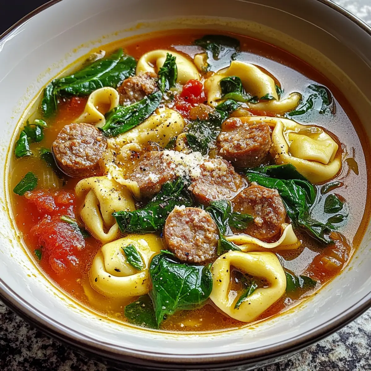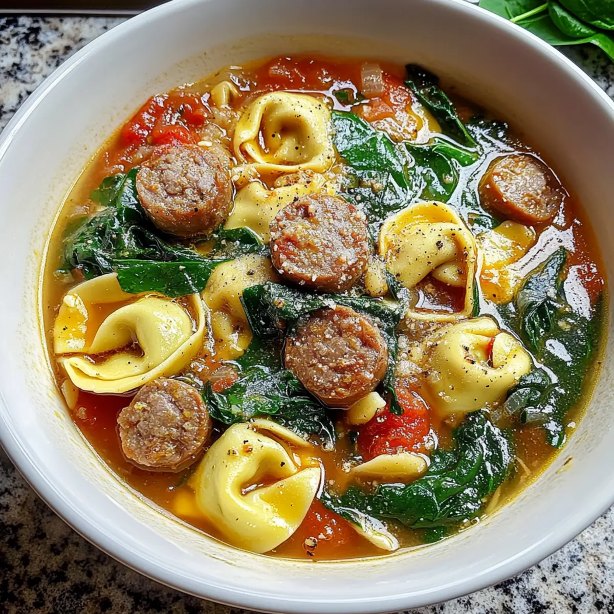 Jump to Recipe Print RecipeAs the chill of evening sets in, I find solace in a warm bowl of Sausage Tortellini Soup with Spinach. The aroma wafting through my kitchen is like a comforting hug, with savory Italian sausage, vibrant spinach, and tender tortellini creating a deliciously inviting sight. This beginner-friendly recipe is perfect for those bustling weeknights when you crave something hearty yet quick to whip up. It’s not just a meal; it’s a nourishing escape that satisfies your soul and appetite, all in under an hour. With just the right touch of heat from crushed red pepper flakes, you’ll discover a delightful contrast in every spoonful. Ready to turn your kitchen into a cozy Italian bistro? Let’s dive into this scrumptious recipe! Why is this soup a must-try? Comforting on chilly nights, this Sausage Tortellini Soup offers the warm embrace you crave. Beginner-friendly and quick to prepare, it’s ready in under an hour. Flavor-packed with savory sausage and vibrant spinach, each bowl is a delightful medley. Versatile, you can easily swap in veggies or plant-based sausage for a twist. Perfect with crusty sourdough, this is a meal that will quickly become a family favorite! Whether you’re busy or just looking to impress, this soup delivers satisfaction! Sausage Tortellini Soup Ingredients • A delightful mix of flavors awaits! For the Soup Olive Oil – For sautéing the sausage; feel free to swap with canola or vegetable oil. Italian Sausage – Provides robust and savory depth; choose mild or spicy based on your taste. Onion – Adds a sweet, aromatic foundation; opt for yellow or white for the best flavor. Garlic – Enhances the soup’s aroma; fresh minced is ideal, but garlic powder works too—just use less. Dried Oregano – Contributes classic Mediterranean flavor; can be replaced with Italian seasoning if needed. Dried Thyme – Offers herbal notes; fresh thyme elevates the dish if you have it on hand. Crushed Red Pepper Flakes – Brings just the right amount of heat; adjust based on your spice preference. Chicken Broth – The foundation of your soup; low-sodium is recommended for a healthier option. Diced Tomatoes – Brightens up the dish with tangy sweetness; canned tomatoes are a convenient choice. Cheese Tortellini – Tender pasta that soaks up the broth; use fresh or frozen based on your availability. Fresh Spinach – Adds vibrant color and nutrients; kale can be a suitable substitute if you’re out of spinach. Salt and Black Pepper – Essential for seasoning; add according to your taste. Grated Parmesan Cheese – A rich finishing touch for serving that enhances the overall dish. Enjoy creating this heartwarming Sausage Tortellini Soup with Spinach! Step‑by‑Step Instructions for Sausage Tortellini Soup with Spinach Step 1: Sauté the Sausage In a large pot, heat 2 tablespoons of olive oil over medium heat for about 1 minute. Add 1 pound of Italian sausage, breaking it into smaller pieces with a wooden spoon. Cook for 6-8 minutes until the sausage is browned and cooked through, stirring occasionally to ensure all sides are evenly cooked. Step 2: Cook the Aromatics Once the sausage is browned, add 1 diced onion to the pot. Sauté for 4-5 minutes, stirring frequently, until the onion becomes soft and translucent. This will create a sweet, aromatic foundation for your Sausage Tortellini Soup with Spinach, setting the stage for the flavors to develop. Step 3: Add Garlic and Herbs Next, stir in 3 minced garlic cloves, 1 teaspoon of dried oregano, 1 teaspoon of dried thyme, and ½ teaspoon of crushed red pepper flakes. Cook for about 1-2 minutes until fragrant. This step will infuse the soup with incredible flavor, so keep an eye on it to prevent burning. Step 4: Pour in the Liquids Pour in 6 cups of low-sodium chicken broth and add a 14.5-ounce can of diced tomatoes with their juices. Stir the mixture well and bring it to a gentle boil over medium-high heat. This will meld all the flavors together while you prepare for the next step. Step 5: Add the Tortellini Once boiling, add 2 cups of cheese tortellini to the pot. Reduce the heat to medium and simmer according to the package instructions, typically around 3-5 minutes. You’ll know it’s ready when the tortellini is tender and floats to the top, creating a delightful, comforting base for your soup. Step 6: Incorporate the Spinach After the tortellini has cooked, gently fold in 4 cups of fresh spinach. Allow it to wilt for 1-2 minutes, stirring occasionally. The vibrant green spinach not only adds nutrition but also a pop of color to your Sausage Tortellini Soup with Spinach. Step 7: Season to Taste Now that your soup is bubbling with flavor, season to taste with salt and black pepper. Start with a pinch of each, taste, and gradually add more as needed to enhance the overall flavor. This is the perfect moment to adjust the spice level according to your preference. Step 8: Serve and Enjoy Ladle the hot soup into bowls, making sure to capture plenty of sausage, tortellini, and spinach in each serving. Top with a sprinkle of grated Parmesan cheese for an extra rich flavor. This warm and satisfying Sausage Tortellini Soup with Spinach is ready to be enjoyed with crusty bread or your favorite salad! What to Serve with Savory Sausage Tortellini Soup with Spinach Warm, comforting, and bursting with flavor, this dish deserves delightful companions to round out your meal. Crusty Sourdough Bread: Perfect for dipping, it adds a rustic crunch that complements the soup’s creamy broth. Simple Green Salad: Light and fresh, a salad with mixed greens and a lemon vinaigrette cools down the warm flavors. Garlic Breadsticks: These buttery delights bring an irresistible aroma and flavor, perfect for mopping up your savory broth. Roasted Vegetables: Caramelized seasonal veggies add sweetness and a delightful crunch, enhancing the comfort of your meal. Parmesan Crisps: These crispy bites offer a savory, cheesy crun