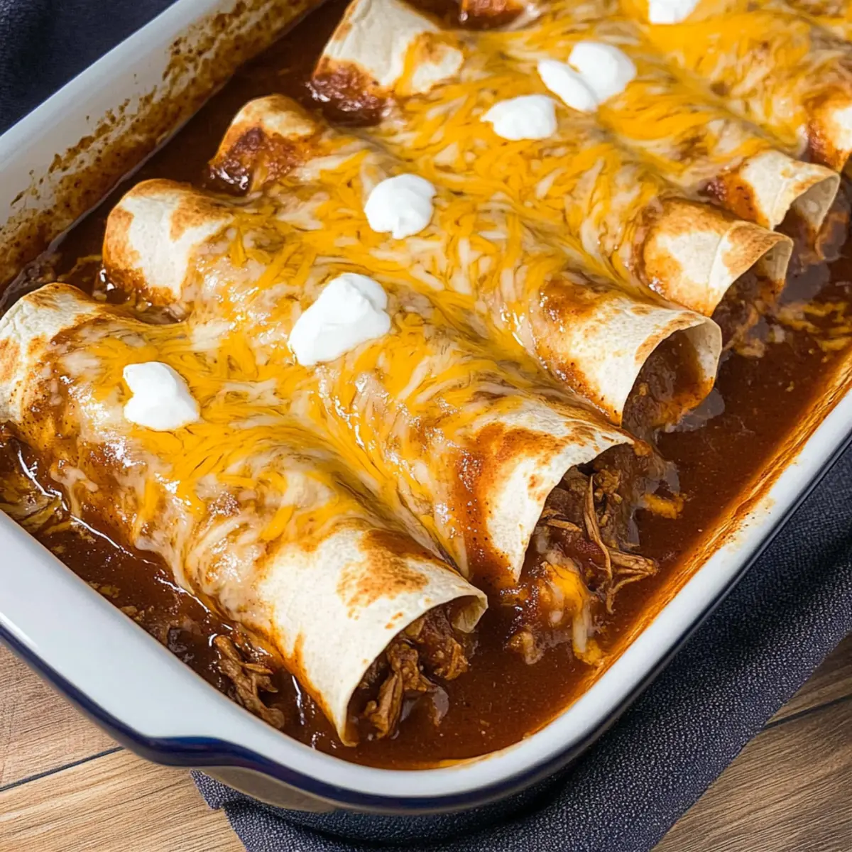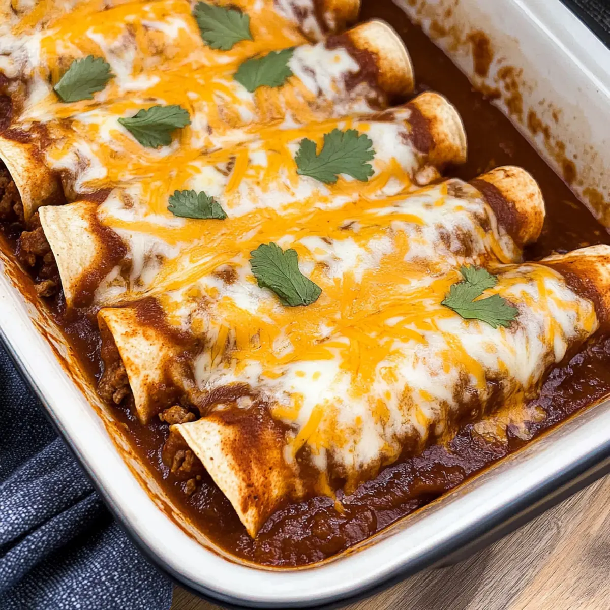 Jump to Recipe Print RecipeA recent comment from a friend about her love for comfort food sparked a memory that immediately took me to a cozy kitchen filled with the mouthwatering aroma of slow-cooked meat. This is the same magic you’ll find when preparing my Slow Cooker Shredded Beef Enchiladas. You’ll experience the delightful combination of tender, juicy beef wrapped in warm tortillas, generously covered in zesty enchilada sauce and a blanket of melted cheese. Not only are these enchiladas a crowd-pleaser, but they also save you time in the kitchen, letting the slow cooker do the heavy lifting. Perfect for a hearty family meal or a relaxing night in, this recipe balances the deliciousness of Tex-Mex cuisine with the simplicity of slow cooking. Can you envision a better way to add delight to your dinner table? Why are Shredded Beef Enchiladas a Must-try? Flavor Explosion: Expect a rich taste experience with tender beef seasoned to perfection, all enveloped in the goodness of enchilada sauce. Time-saving Delight: The slow cooker makes this recipe a breeze, allowing you to go about your day while deliciousness simmers away. Ultimate Comfort Food: Gather family and friends around this hearty dish—they won’t be able to resist the cheesy, beefy goodness! Versatile Variations: Want to switch things up? Try Ground Beef Lettuce Wraps or even a fresher twist with Thai Basil Beef. Crowd-Pleasing Charm: These enchiladas are so good, you might find yourself making them every week! Just imagine the smiles at dinner time. Shredded Beef Enchiladas Ingredients For the Beef Filling • Chuck Roast – This rich beef cut brings unrivaled flavor; choose a well-marbled piece for maximum tenderness. • Beef Broth – Hydrates the meat and enhances its overall flavor; use chicken broth for a lighter taste if preferred. • Chili Powder – Adds that signature Tex-Mex warmth; feel free to adjust the spice level to your liking. • Cumin – This earthy spice is a must for authentic flavor; don’t skip on this classic ingredient! • Salt – Essential for balancing and enhancing all the flavors; kosher salt works beautifully for even distribution. • Onion Powder – Boosts the savory essence of the dish; fresh onions lend even more depth if you’re a fan. • Garlic Powder – Infuses a lovely aroma and taste; substitute with fresh minced garlic for a punchier profile. • Black Pepper – Adds a hint of heat; freshly cracked pepper will elevate the flavor beautifully. For Assembly • Red Enchilada Sauce – This is key for moisture and flavor; choose your favorite store-bought brand or go homemade for an extra touch! • Flour Tortillas – Keep everything together; warm them slightly to avoid cracking—corn tortillas also work if warmed first. • Mexican Blend Cheese – Creamy and melty, this cheese blend is the perfect topping; try Monterey Jack or Cheddar for a different melting experience. Make these Shredded Beef Enchiladas your next family dinner, and watch them disappear in a flash! Step‑by‑Step Instructions for Shredded Beef Enchiladas Step 1: Prepare Shredded Beef Place the chuck roast in your slow cooker and pour in the beef broth. Sprinkle the chili powder, cumin, salt, onion powder, garlic powder, and black pepper evenly over the meat. Cover and cook on low for 6-7 hours, until the beef is tender and easily shreds with a fork. Once done, shred the beef directly in the cooker, mixing it with the flavorful juices. Step 2: Assemble Enchiladas Preheat your oven to 350°F (175°C). In a 9×13-inch baking dish, spread ½ cup of the red enchilada sauce on the bottom. Take each warm tortilla and fill it with ¼ cup of the shredded beef and 2 tablespoons of Mexican blend cheese. Roll the tortilla tightly and place it seam-side down in the baking dish. Continue this process until all tortillas are filled and snugly arranged in the dish. Step 3: Bake Enchiladas Pour any remaining red enchilada sauce over the rolled tortillas in the baking dish, ensuring an even coverage. Sprinkle the remaining cheese generously on top. Bake in the preheated oven for about 20 minutes, watching for the sauce to bubble and the cheese to melt beautifully. Once done, remove the dish and let it cool for 5 minutes before serving to allow the flavors to meld together. How to Store and Freeze Shredded Beef Enchiladas Fridge: Store leftover shredded beef enchiladas in an airtight container for up to 3 days. Make sure they’re fully cooled before sealing to maintain freshness. Freezer: To freeze, wrap enchiladas tightly in plastic wrap or aluminum foil, then place in a freezer-safe container. They can be frozen for up to 2 months. Reheating: When ready to enjoy, thaw overnight in the fridge, then reheat in the oven at 350°F (175°C) for about 20 minutes, or until heated through. Freshness Tip: If you’re freezing, consider undercooking the enchiladas slightly before freezing for optimal texture upon reheating. Make Ahead Options These Shredded Beef Enchiladas are a perfect solution for busy home cooks looking to streamline their meal prep! You can prepare the shredded beef up to 3 days in advance; simply cook it in the slow cooker, shred it, and store it in an airtight container in the refrigerator. Additionally, you can assemble the enchiladas up to 24 hours ahead—just fill the tortillas, roll them up, and place them in the baking dish with sauce and cheese. Before serving, bake them directly from the fridge for about 25-30 minutes, ensuring they’re heated through and the cheese is bubbly. This way, you get to enjoy all the fabulous flavors of homemade enchiladas with minimal effort on busy weeknights! Tips for the Best Shredded Beef Enchiladas Quality Meat: Choose a well-marbled chuck roast for the best tenderness. Avoid lean cuts, as they may result in a drier filling. Spice Adjustment: Start with the recommended spices, but feel free to tweak the chili powder and cumin levels to cater to your family’