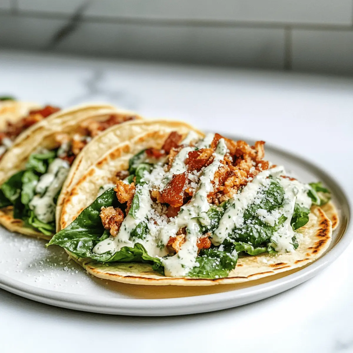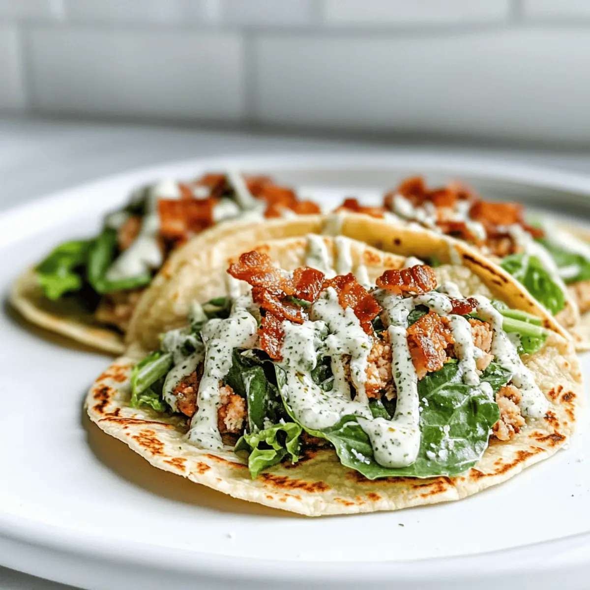 Jump to Recipe Print RecipeWhen I first discovered the magic of Smash Chicken Caesar Tacos, it felt like a culinary revelation. Imagine crispy little tortillas cradling seasoned ground chicken, all dressed up like a classic Caesar salad. The beauty of this recipe lies not just in its delightful crunch and juicy filling, but in its versatility and speed—ready in under 20 minutes! These protein-packed tacos are perfect for a quick dinner or meal prep, making them the ultimate solution for those busy weeknights when you crave something delicious without spending hours in the kitchen. Plus, you can customize them to suit your taste—add extra toppings or swap out ingredients with ease! Curious how these delightful tacos come together? Let’s dive into the recipe! Why Are Smash Chicken Caesar Tacos a Must-Try? Quick Preparation: With just under 20 minutes needed from start to finish, these tacos are perfect for busy weeknights. Protein-Packed Delight: Ground chicken serves as a hearty and healthy base, keeping you satisfied without the heaviness of fast food. Crispy and Crunchy: The unique cooking method ensures your tortillas are crispy, providing an irresistible texture that plays well with the juicy filling. Customizable Fun: Easily adjust ingredients to suit your preferences—whether you prefer adding extra greens, swapping for Cheesy Garlic Chicken, or trying a different dressing. Incredible Flavor Fusion: Experience the classic Caesar salad flavors in a handheld taco. It’s a delightful twist that will impress everyone around your dinner table! Crowd-Pleasing Appeal: These tacos make for an excellent meal prep or family dinner option, ensuring everyone has something they love in one neat package! Smash Chicken Caesar Tacos Ingredients For the Filling • Ground Chicken – Provides lean protein for a hearty base; swap with ground turkey for a similar flavor and texture. • Garlic Powder – Adds aromatic depth to the chicken; use fresh garlic for a more intense flavor. • Salt and Black Pepper – Enhances overall flavor profile; adjust quantities based on taste preference. For the Tortillas • Small Flour Tortillas – Acts as the vessel for the taco, providing a crispy exterior; gluten-free tortillas can be used to accommodate dietary needs. For the Toppings • Romaine Lettuce – Adds freshness and crunch; substitute with iceberg for a milder taste or spinach for added nutrients. • Caesar Dressing – Delivers the characteristic creamy, tangy flavor of Caesar salad; consider homemade dressing for a healthier twist. • Grated Parmesan Cheese – Provides a rich, cheesy element; use nutritional yeast for a dairy-free option. • Bacon Bits – Introduces a salty crunch; for a vegetarian alternative, omit or replace with croutons. Step‑by‑Step Instructions for Smash Chicken Caesar Tacos Step 1: Prep Chicken Mixture In a mixing bowl, combine 1 pound of ground chicken with garlic powder, salt, and black pepper. Use your hands or a spoon to thoroughly mix the ingredients until the chicken is evenly seasoned. This fusion lays the foundation for the flavor-packed filling that will make your Smash Chicken Caesar Tacos irresistible. Step 2: Apply Chicken to Tortillas Take small flour tortillas and spread a thin, even layer of the seasoned ground chicken on the backside of each one. Press down firmly to ensure the chicken adheres well, allowing the meat to cook evenly. This step not only assembles your tacos but also preps them for the crispy perfection ahead. Step 3: Cook Tortillas Heat a skillet over medium-high heat and add a drizzle of avocado oil. Once the skillet is hot (you should see a shimmer in the oil), place the tortillas chicken-side down. Cook them for about 2-3 minutes until the chicken is golden brown and fully cooked, emitting a delicious aroma. Step 4: Flip and Crisp With care, flip each tortilla over using a spatula, ensuring you keep the mixture intact. Crisp the other side for an additional 1-2 minutes until it becomes golden and crispy. This step is crucial to achieving the delightful crunch that complements the juicy filling of your Smash Chicken Caesar Tacos. Step 5: Top Tacos After cooking, remove the tacos from the skillet and allow them to cool slightly. Top each taco with a generous amount of fresh romaine lettuce, followed by a drizzle of creamy Caesar dressing. Finish with a sprinkle of grated Parmesan cheese and crispy bacon bits for that irresistible topping combination. Step 6: Serve Finally, fold each taco in half and serve them warm to enjoy the heavenly contrast of textures and flavors. These Smash Chicken Caesar Tacos are perfect for a quick dinner or a fun meal prep option, providing a delightful taste of Caesar salad wrapped in a delicious taco shell. Make Ahead Options These Smash Chicken Caesar Tacos are perfect for meal prep, allowing you to savor the delicious flavors while saving valuable time during busy weeknights! You can prepare the seasoned ground chicken up to 24 hours in advance; simply store it in an airtight container in the fridge until you’re ready to cook. Additionally, chop your romaine lettuce and pack it separately to keep it crisp. When it’s time to serve, reheat the chicken mixture in a skillet to avoid drying it out, then assemble the tacos by layering the crisp chicken, fresh lettuce, Caesar dressing, and toppings just before enjoying. With this prep work, you’ll have a quick, stress-free dinner that still tastes just as delicious! Storage Tips for Smash Chicken Caesar Tacos Fridge: Store leftover tacos in an airtight container for up to 3 days, keeping toppings separate to prevent sogginess. Freezer: If prepped in advance, freeze the uncooked chicken mixture in a sealed bag for up to 2 months. Thaw overnight in the fridge before use. Reheating: For crispy leftovers, reheat tacos in a skillet or air fryer on medium heat, ensuring the tortillas remain crunchy. Avoid microwaving for best results. Assembly Tip: A
