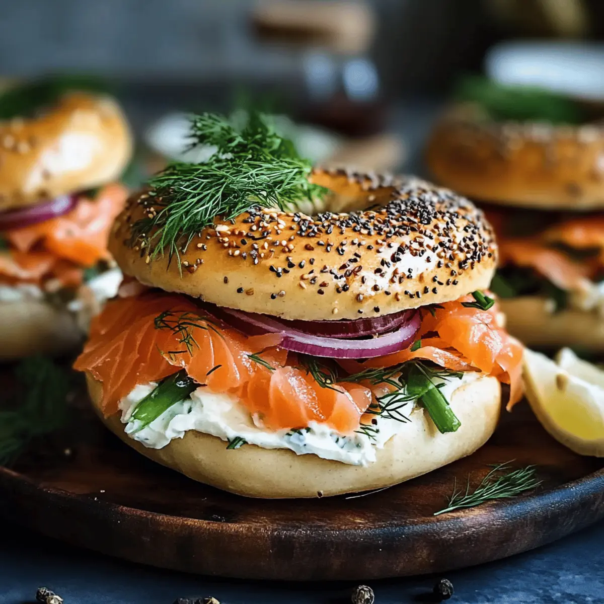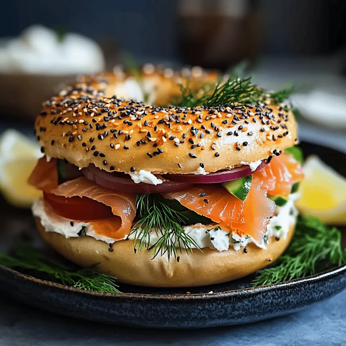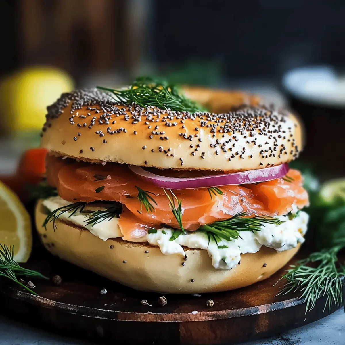 Jump to Recipe Print RecipeThe rich aroma of freshly toasted bagels wafts through my kitchen, instantly pulling me into a delightful breakfast moment. Nothing feels quite as indulgent yet approachable as a Smoked Salmon Bagel. This quick and easy dish comes together in just 8 minutes, making it a perfect choice for those busy mornings when you crave something special but want to skip the takeout line. Imagine silky smoked salmon nestled atop a layer of creamy, dreamily flavored spread—perhaps with a hint of lemon zest or fresh herbs—and finished with crisp vegetables; it’s a breakfast that feels like a gourmet treat yet is simple enough for everyday enjoyment. Plus, this recipe is wonderfully adaptable—use your favorite bagel variety or mix up the cream cheese to suit your taste. Are you ready to elevate your brunch game? Let’s dive right in! Why is the Smoked Salmon Bagel special? Deliciously Versatile: You can customize it with your favorite bagel varieties like everything or whole wheat, giving it a unique twist every time. Flavor-packed Cream Cheese: Elevate your spread by mixing in herbs or lemon zest, making every bite bursting with flavor. Quick and Easy: Ready in just 8 minutes, it’s perfect for busy mornings or a leisurely brunch with friends. Crowd Pleaser: This dish easily impresses guests—just serve alongside a refreshing side salad or some fruit for a complete meal. Health Benefits: Packed with omega-3s from the salmon, it’s a nutritious choice that keeps you satisfied. Get ready to love every bite of this easy indulgence! Smoked Salmon Bagel Ingredients For the Bagel Base • Fresh Bagels – Choose your favorite type, such as plain, sesame, or whole wheat, for a personalized touch. For the Toppings • Smoked Salmon (4 oz) – This rich, savory ingredient provides protein and flavor; feel free to try hot-smoked salmon for a bolder taste. • Cream Cheese (4 tablespoons) – Use this luscious spread as a base; you can even mix in fresh herbs or lemon zest for an upgraded flavor. • Red Onion (¼ small) – Adds a crunchy bite and sharpness; opt for green onions if you prefer something milder. • Tomato (optional, 1 small) – Incorporates freshness; be sure to select ripe varieties for the best flavor. • Capers (2 tablespoons) – These little gems contribute saltiness; rinse them if you want to tone down the brine. • Fresh Dill Sprigs – A beautiful and aromatic garnish that enhances the dish’s freshness. • Lemon Wedges – Serve alongside for a zesty splash that brightens the entire meal. • Black Pepper – Freshly ground pepper will elevate the flavors perfectly; sprinkle generously to taste. Step‑by‑Step Instructions for Smoked Salmon Bagel Step 1: Toast the Bagels Begin by slicing your fresh bagels in half, exposing their soft, fluffy interiors. Preheat your toaster or oven to medium heat and toast the bagels for about 3–4 minutes or until they are golden brown and slightly crispy. This step adds a delightful crunch, setting the perfect base for your Smoked Salmon Bagel. Step 2: Spread the Cream Cheese Once the bagels are toasted to perfection, generously spread 2 tablespoons of cream cheese on each half while they are still warm. Allowing the cream cheese to melt slightly will enhance the creaminess of your Smoked Salmon Bagel. Make sure to cover the entire surface for a delightful balance of flavors. Step 3: Layer the Smoked Salmon Gently lay 2 ounces of smoked salmon over the cream cheese, ensuring even coverage on both bagel halves. The silky texture of the salmon should slightly overlap in spots for an enticing visual appeal. This savory layer is the star of your Smoked Salmon Bagel, providing depth and richness to every bite. Step 4: Add Fresh Vegetables Top the smoked salmon with thin rings of red onion and freshly sliced tomato, if using. The crunch of the onion and the juiciness of the tomato add texture and balance to your bagel. Aim for a colorful presentation that not only pleases the eye but also enhances the taste of your Smoked Salmon Bagel. Step 5: Finish it Off with Capers and Dill Sprinkle 1 tablespoon of capers over each bagel half for a burst of briny flavor that complements the salmon beautifully. Garnish with a few sprigs of fresh dill for an aromatic touch. This finishing step adds a gourmet feel to your Smoked Salmon Bagel. Step 6: Serve and Enjoy Serve your Smoked Salmon Bagel immediately, accompanied by lemon wedges and a sprinkle of freshly ground black pepper for an extra kick. This dish is best enjoyed fresh, allowing you to experience the marvellous blend of flavors. Indulge in this delightful breakfast creation! Expert Tips for the Best Smoked Salmon Bagel Toast to Perfection: Always toast your bagels just right; under-toasting can lead to a soggy base, while over-toasting can make them too crunchy. Flavor Test: Before assembly, taste your cream cheese and salmon together to ensure a delicious flavor balance; it dramatically impacts the overall dish! Freshness Matters: Keep smoked salmon refrigerated until you’re ready to use it for maximum freshness and flavor; consume promptly for the best experience. Prep Ahead: Prepare all your toppings in advance, but assemble the bagels right before serving to maintain the perfect texture and crunch. Experiment with Colors: Feel free to add colorful toppings like microgreens or avocado for a visually stunning and nutritious Smoked Salmon Bagel. Smoked Salmon Bagel Variations Feel free to get creative with your Smoked Salmon Bagel and elevate its flavors to fit your mood! Herbed Cream Cheese: Mix cream cheese with fresh chives or dill for an aromatic twist. This simple switch amplifies the freshness, making each bite even more delightful. Hot-Smoked Salmon: Swap in hot-smoked salmon for a spicier, bolder flavor. This alteration will bring a delightful heat that contrasts beautifully with the creaminess of the cheese. Alternative Bagel Types: Try different bagel op