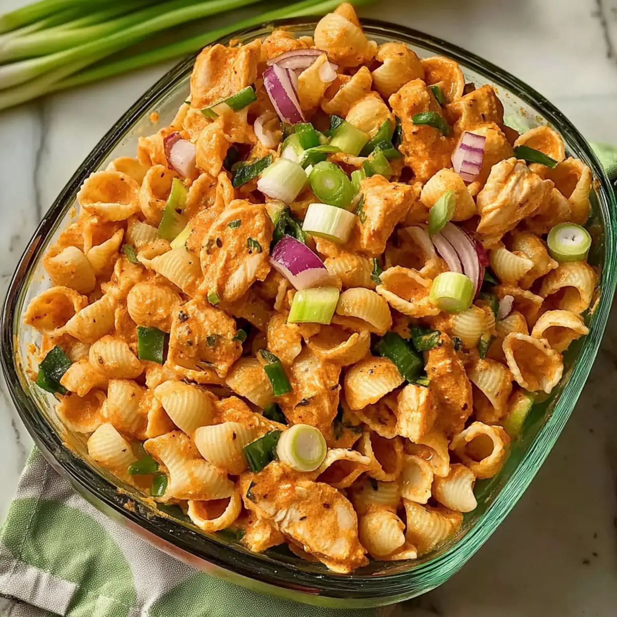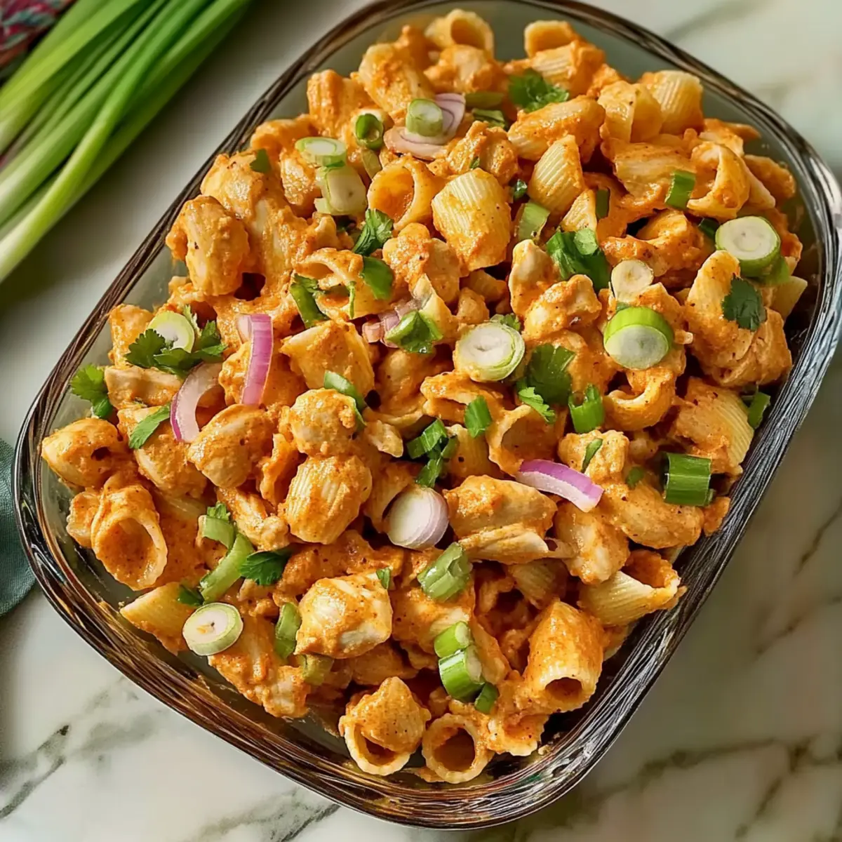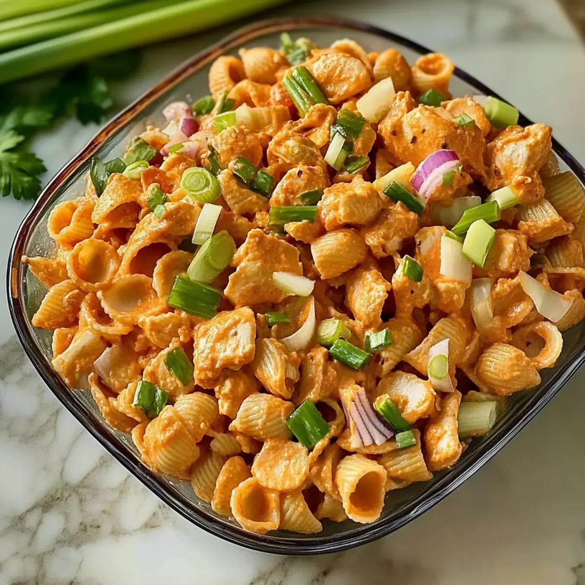 Jump to Recipe Print RecipeAs the sizzling aroma of roasted chicken fills my kitchen, I can’t help but feel a wave of excitement for this Spicy High Protein Buffalo Pasta Salad. With its delightful combination of tender chicken, creamy yogurt, and a kick of buffalo sauce, this dish transforms a classic pasta salad into a high-protein powerhouse. Perfect for meal prep, it comes together in under an hour and is best enjoyed chilled, making it an ideal choice for busy weeknights or potluck gatherings. Not to mention, every bite offers a balancing crunch from fresh veggies that will keep you reaching for more. Curious about how to whip up a bowl of this flavorful goodness? Let’s dive right in! Why is Buffalo Pasta Salad a Must-Try? Bold flavors: This Spicy High Protein Buffalo Pasta Salad packs a punch with the tangy zip of buffalo sauce and creamy yogurt, making it a fun twist on traditional pasta salads. Meal prep friendly: Ready in under an hour, it’s perfect for busy weekdays and can be prepped ahead of time for quick meals. Versatile: Easily customize with grilled shrimp or tofu for a vegetarian delight, or adjust the spice level to suit your taste. Crowd-pleaser: Ideal for potlucks or family gatherings, this dish is sure to impress guests with its bold flavors and vibrant colors. Healthy twist: High in protein and full of veggies, it’s a nutritious alternative to fast food that doesn’t skimp on flavor. Want to complement your meal? Pair it with a light Mandarin Orange Salad for a refreshing side! Spicy High Protein Buffalo Pasta Salad Ingredients For the Salad • Orecchiette – The perfect pasta shape for holding onto the creamy dressing; feel free to swap with any short pasta you have on hand. • Chicken Breast – This is your main source of protein; boneless and skinless is ideal, but rotisserie chicken works too for added flavor. • Red Onion – Adds a mild sweetness; shallots can be used for a milder taste or if you prefer roasted flavors. • Carrots – Bring a sweet crunch to the dish; substitute bell peppers or cucumbers for a different texture profile. • Celery – Offers a refreshing crunch; fennel or jicama can provide a unique taste twist. • Scallions – Provide subtle onion flavor; chives can serve as an excellent alternative if you’re looking for something milder. For the Seasoning • Onion Powder – Enhances depth in the chicken; feel free to use garlic powder for a bolder kick. • Garlic Powder – Boosts umami and savory notes; fresh minced garlic can also be used but may alter the cooking time. • Paprika – Adds a slight smokiness and vibrant color; smoked paprika can deepen the flavor even more. • Salt – Essential for bringing out all the flavors; don’t skip seasoning the pasta water! For the Dressing • Buffalo Sauce – This is where the heat comes from; adjust to taste, with Franks RedHot being a popular choice. A homemade version works wonders too! • Yogurt – Provides a creamy element that balances the spices; Greek yogurt is ideal, but dairy-free substitutes are great too for those with dietary restrictions. With these ingredients, you’re all set to create a flavorful Spicy High Protein Buffalo Pasta Salad that’s not only satisfying but also brimming with nutrition! Step‑by‑Step Instructions for Spicy High Protein Buffalo Pasta Salad Step 1: Preheat the Oven Begin by preheating your oven to 425°F (220°C). This high temperature will help roast the chicken and red onions to perfection, giving them a deliciously caramelized finish. While the oven heats, prepare your chicken for seasoning so that everything is ready for the next steps. Step 2: Prepare the Chicken Pat your boneless, skinless chicken breast dry with a paper towel, and season both sides generously with a mixture of onion powder, garlic powder, paprika, and salt. This seasoning blend enhances the chicken’s flavor beautifully, providing a tasty contrast to the tangy buffalo sauce in the final Spicy High Protein Buffalo Pasta Salad. Step 3: Arrange Chicken and Onions Slice your red onions into 1-inch wedges and arrange them on a sheet pan along with the seasoned chicken. Ensure the vegetables are evenly spread to allow for proper roasting. This combination will help the onions mingle with the chicken, adding sweetness as it cooks. Step 4: Roast the Chicken and Onions Place the sheet pan in the preheated oven and roast for 18-20 minutes, or until the chicken’s internal temperature reaches 165°F (74°C). Keep an eye on them; the chicken should be golden and slightly crispy, while the onions will soften and become fragrant, blending their flavors with the chicken. Step 5: Cook the Pasta While the chicken and onions are roasting, bring a large pot of salted water to a rolling boil. Add the orecchiette pasta and cook according to package instructions until al dente, which usually takes about 8-10 minutes. Drain the pasta and allow it to cool slightly; this will help prevent it from wilting the fresh veggies. Step 6: Chop Ingredients Once your chicken and onions have roasted and cooled a bit, chop them into bite-sized pieces. Then, dice the raw vegetables: chop the carrots, celery, and scallions into small, even pieces. This ensures a balanced bite in your Spicy High Protein Buffalo Pasta Salad with every mouthful. Step 7: Whisk the Dressing In a medium mixing bowl, whisk together the buffalo sauce and yogurt until smooth and well combined. Adjust the buffalo sauce quantity based on your heat preference—the creaminess of the yogurt will help mellow out the spice while still delivering flavor. Step 8: Combine Everything In a large mixing bowl, combine the chopped chicken, cooked orecchiette pasta, and diced vegetables. Pour the buffalo-yogurt dressing over the top and gently toss everything together. Ensure every piece is well-coated, creating a hearty, flavorful Spicy High Protein Buffalo Pasta Salad. Step 9: Serve or Chill You can serve the salad immedia