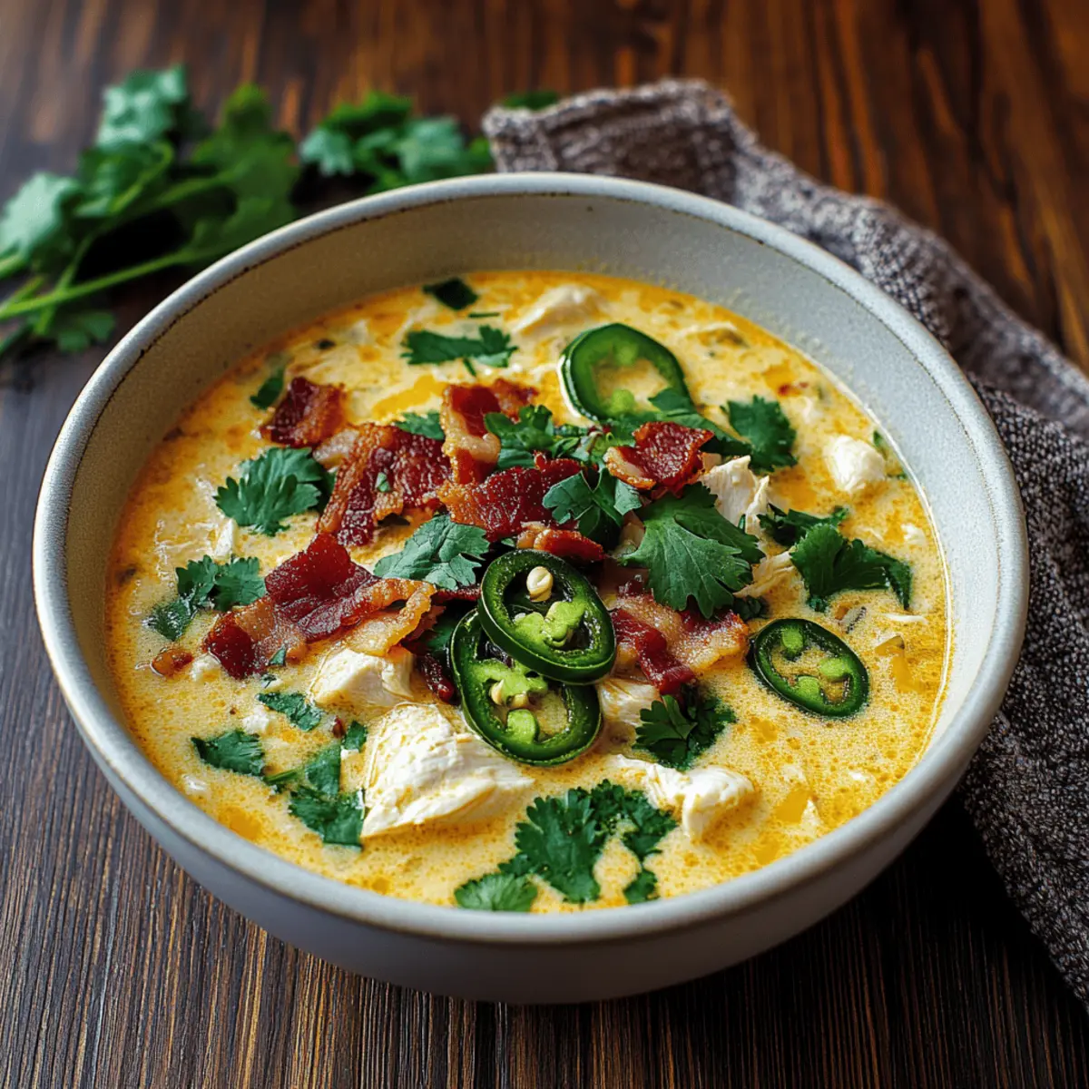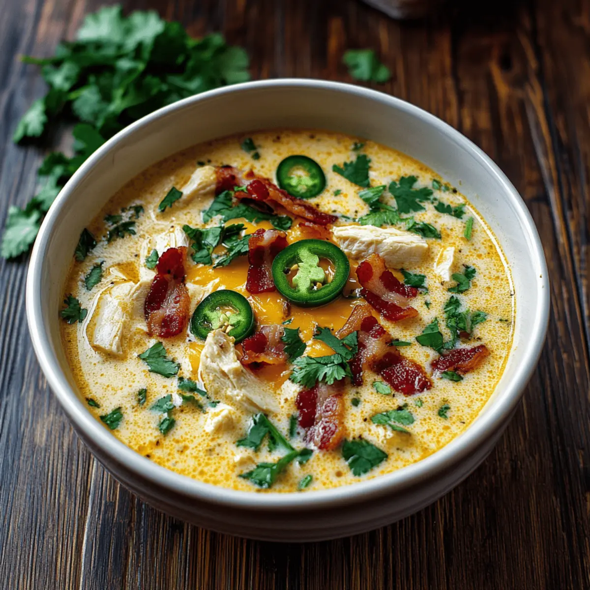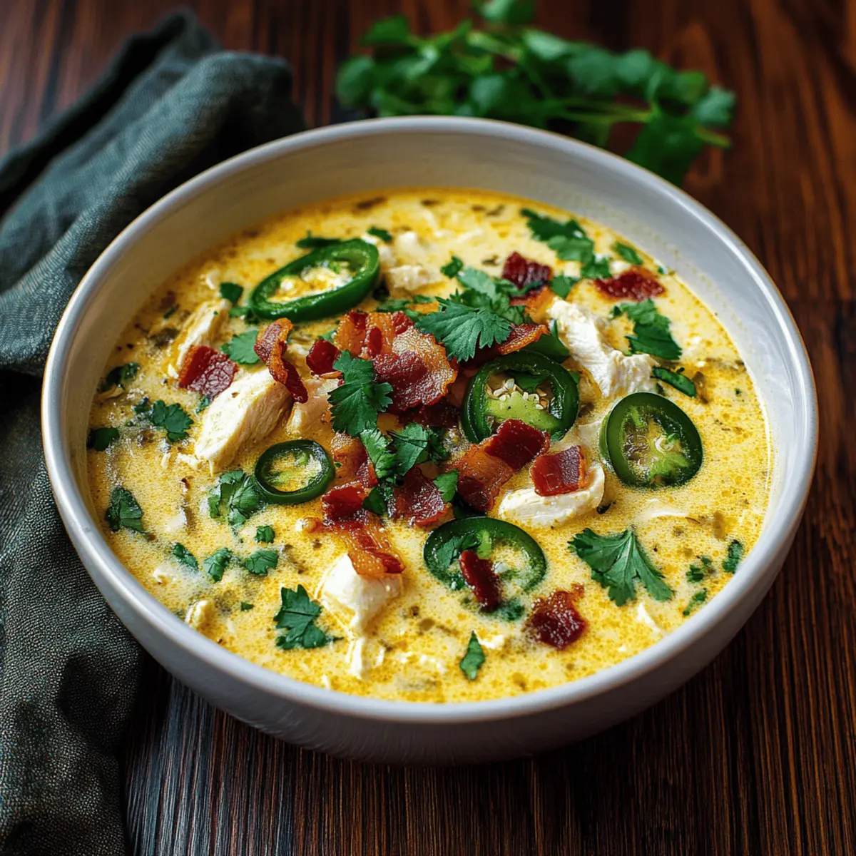 Jump to Recipe Print RecipeAs the sun dips below the horizon, a waft of warm, spicy aromas fills my kitchen, inviting me to gather around the table. This is when I whip up my go-to comfort food: Spicy Jalapeño Popper Chicken Soup. With a creamy texture and a kick of jalapeño heat, it’s like a bowl of cozy indulgence perfect for those chilly evenings. Not only is this soup quick to prepare, but it also offers a customizable touch for everyone at your table—whether you prefer a vegetarian version or a hearty chicken delight. So, why not create something special tonight? Let’s dive into the warmth and comfort of this deliciously satisfying recipe! Why is this soup a must-try? Comfort in a bowl: This Spicy Jalapeño Popper Chicken Soup envelops you in warmth, making it the ultimate dish for chilly nights. Customizable options mean you can easily tailor it to suit any dietary preference, whether you opt for tender chicken or a hearty vegetarian alternative. Flavor-packed with a delightful mix of spices and creamy cheese, every spoonful delivers a burst of deliciousness. Convenient to make, you’ll find it comes together quicker than delivery, perfect for impromptu gatherings. Pair it with crusty bread or hearty tortilla chips, and you have a satisfying meal that will impress family and friends! Spicy Jalapeño Popper Chicken Soup Ingredients For the Base Olive Oil – Adds richness; heats the pan for sautéing onion and garlic. Onion (1 medium, diced) – Provides base flavor and sweetness. Garlic (3 cloves, minced) – Enhances aroma and savory depth. Jalapeños (2 large, diced, seeds removed) – Offers spice and flavor; adjust quantity for heat preference. Boneless Skinless Chicken Breasts (1 pound) – The main protein source; adds heartiness. Chicken Broth (4 cups) – The soup base that adds depth and moisture. For the Creaminess Heavy Cream (1 cup) – Creates a rich and creamy texture; substitute with low-fat milk for a lighter version. Cream Cheese (1 cup, softened) – Contributes to creamy texture and flavor profile; ensure softened for easy incorporation. Shredded Cheddar Cheese (1 cup) – Adds richness and cheesy flavor; use pepper jack for extra spice. For the Flavor Boost Ground Cumin (1 teaspoon) – Adds warmth and earthy notes; do not omit for flavor balance. Paprika (1 teaspoon) – Enhances color and adds mild smokiness; consider smoked paprika for additional flavor. Salt and Pepper – Seasoning to taste for balance; adjust according to preference. For the Crunch Crumbled Bacon (½ cup, optional) – Adds a crunchy texture and smoky flavor; omit for a vegetarian version. For Garnish Fresh Cilantro – Brightens the dish; can substitute with green onions for garnish. With these ingredients in hand, you’re well on your way to making the ultimate Spicy Jalapeño Popper Chicken Soup that will have everyone asking for seconds! Step‑by‑Step Instructions for Spicy Jalapeño Popper Chicken Soup Step 1: Sauté the Aromatics Heat 2 tablespoons of olive oil in a large pot over medium heat. Once shimmering, add in the diced onion and sauté for about 5 minutes until it becomes translucent and fragrant. This base will provide a rich flavor for your Spicy Jalapeño Popper Chicken Soup, so stir frequently to ensure even cooking without browning. Step 2: Add Garlic and Jalapeños Incorporate the minced garlic and diced jalapeños into the pot, cooking for an additional 2 minutes. Stir them until the garlic is fragrant and the jalapeños begin to soften. The vibrant colors and aromas will fill your kitchen, setting the stage for the deliciously spicy soup to come. Step 3: Simmer with Chicken and Broth Carefully add the boneless skinless chicken breasts and the 4 cups of chicken broth to the pot, bringing everything to a hearty boil. Once boiling, reduce the heat to a low simmer and cover the pot, allowing it to cook for about 15 minutes. The chicken will cook through and absorb the fragrant broth, enriching the soup’s flavor. Step 4: Shred the Chicken After simmering, remove the chicken breasts from the pot and place them on a cutting board. Using two forks, shred the chicken into bite-sized pieces. Return the shredded chicken to the pot, stirring it back into the simmering broth. This step enhances the heartiness of your Spicy Jalapeño Popper Chicken Soup. Step 5: Stir in Cream and Spices Pour in 1 cup of heavy cream along with the teaspoon of ground cumin and paprika. Stir well to blend everything together, allowing the soup to heat through until it is almost bubbling. Season with salt and pepper according to your taste. The addition of cream will give your soup a velvety consistency and rich flavor. Step 6: Incorporate Cream Cheese and Cheddar Add 1 cup of softened cream cheese to the pot, stirring continuously until fully incorporated into the soup. Then, mix in 1 cup of shredded cheddar cheese, watching it melt and create a luscious texture. This is where your Spicy Jalapeño Popper Chicken Soup transforms into a creamy dream! Step 7: Add Bacon and Simmer If you’re using crumbled bacon, stir it into the pot now for an extra layer of flavor. Let the soup simmer for an additional 5 minutes, allowing all the ingredients to meld beautifully together. Keep an eye on it to ensure it doesn’t stick to the bottom, creating a deliciously rich and smoky profile. Step 8: Serve with Fresh Garnish Ladle the hot soup into bowls and garnish with fresh cilantro for a pop of color and flavor. You can also sprinkle extra cheddar on top if desired. This vibrant presentation will make your Spicy Jalapeño Popper Chicken Soup irresistible, perfect for cozy nights around the dinner table. Variations & Substitutions Feel free to get creative and customize your Spicy Jalapeño Popper Chicken Soup to suit your taste! Vegetarian Option: Swap chicken for chickpeas or roasted cauliflower for a hearty vegetarian twist. This way, you can enjoy the same comforting flavors without the meat. Li