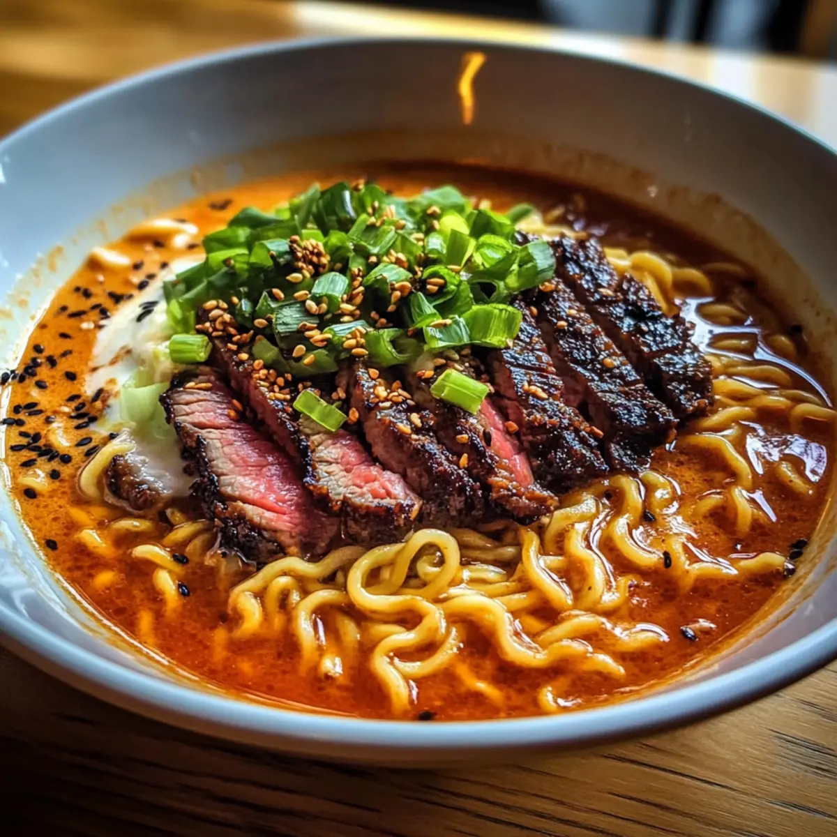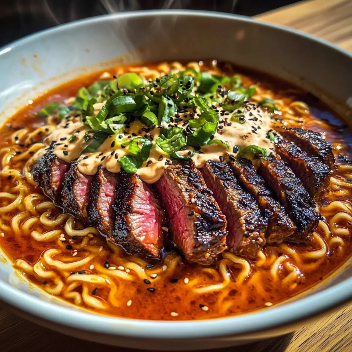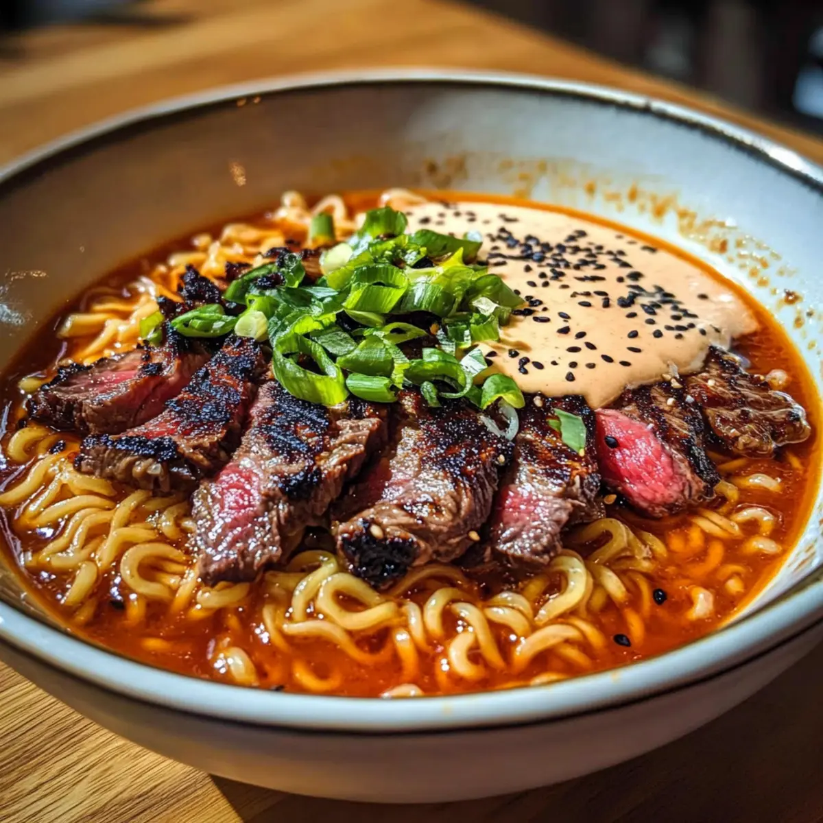 Jump to Recipe Print RecipeThe enticing aroma of spices wafts through my kitchen as I prepare a classic favorite that never fails to impress: Spicy Korean Ramen with Grilled Beef. This dish is not just a meal; it’s a celebration of vibrant flavors and textures that can transform any weeknight into a culinary adventure. The tender, charred beef pairs beautifully with a rich, spicy broth accented by a creamy sauce. It’s a quick, easy recipe that’s perfect for busy evenings or cozy nights in, proving that comfort food doesn’t have to be complicated. Plus, whether you choose beef, chicken, or even tofu, this adaptable dish allows everyone to enjoy a taste of Korea right at home. Ready to whip up this delightful ramen and make your taste buds dance? Let’s dive in! Why is this ramen a must-try? Bold, Spicy Flavors: This dish delivers a punch of warmth that will excite your palate. Quick & Easy: Whip this up in less than 30 minutes, making it perfect for busy nights. Versatile Protein Choices: Whether you prefer beef, chicken, or tofu, this recipe adapts to your liking while still providing that mouthwatering taste. Creamy Goodness: The blend of creamy sauce with the spicy broth creates an irresistible contrast that keeps you coming back for more. Crowd-Pleasing Delight: Serve this at your next gathering and watch as it becomes the star of the meal, just like my Spicy Shrimp Avocado Rice Bowl! Comforting & Satisfying: Not only is it delicious, but the combination of chewy noodles and tender ingredients creates a heartwarming dish that feels like a hug in a bowl. Spicy Korean Ramen Ingredients • Dive into flavor with these essential components! For the Beef Ribeye or Sirloin Steak (300g/10 oz) – The main protein that melts in your mouth when grilled; substitute with chicken thighs or pressed extra-firm tofu if desired. Soy Sauce (2 tbsp) – Infuses umami flavor and depth; use tamari for a gluten-free option. Gochujang (1 tbsp) – This Korean chili paste brings heat; reduce or substitute with miso paste mixed with sriracha for a milder kick. Sesame Oil (2 tsp total) – Offers a nutty aroma that is essential in Asian cuisine; while no perfect substitute exists, you can explore other oils for variations. Brown Sugar (1 tsp) – Balances the flavors with a hint of sweetness; honey or maple syrup can be tasty alternatives. Garlic Cloves (2, minced) – Elevates the overall flavor; feel free to use garlic powder in a pinch for convenience. Ground Black Pepper (½ tsp) – Provides a soft heat; if you want less visual specking, swap with white pepper. For the Ramen Instant Ramen Noodles (2 packs) – The foundation of this dish that offers delightful chewiness; consider fresh ramen or soba noodles for a gourmet twist. Chicken or Beef Broth (2 cups) – The heart of your broth; for a vegetarian version, opt for vegetable broth. Gochugaru (1 tbsp) – These Korean red chili flakes add extra heat; adjust to taste or use paprika if you’re in a bind. Rice Vinegar (1 tsp) – Brings an acidity that brightens the dish; white vinegar makes a suitable substitute. For the Creamy Sauce Mayonnaise (3 tbsp) – For that luscious, creamy texture; Kewpie is recommended for richness, but Greek yogurt serves as a lighter alternative. Sriracha (1 tbsp) – Introduces a zesty kick; feel free to adjust based on your spice tolerance. Sesame Oil (1 tsp) – Reinforces the rich flavor profile of the sauce. Garlic Powder (½ tsp) – A no-fuss way to add garlic taste; you can increase it for a bolder flavor. Sugar (Pinch, optional) – Helps balance the sauce’s flavors; omit for a lower-calorie option. Final Touches Chopped Green Onions (2 tbsp) – Adds a fresh crunch as a garnish; if needed, chives can stand in perfectly. Toasted Black Sesame Seeds (1 tsp) – Enhances texture and presentation; white sesame seeds can work as a substitute. Extra Gochugaru or Chili Oil (optional for heat) – Perfect for those spice enthusiasts seeking that extra kick. Unleash the vibrant flavors of the Spicy Korean Ramen and watch your family gather around the table for a delicious experience! Step‑by‑Step Instructions for Spicy Korean Ramen with Grilled Beef & Creamy Sauce Step 1: Marinate the Steak In a medium bowl, combine soy sauce, gochujang, sesame oil, brown sugar, minced garlic, and black pepper to create a marinade. Add the ribeye or sirloin steak, ensuring it’s well-coated. Let the steak marinate for at least 30 minutes at room temperature while you prepare the other ingredients, allowing the flavors to penetrate the meat beautifully. Step 2: Grill the Steak Preheat your grill or cast iron pan over medium-high heat. Once hot, place the marinated steak on the grill and cook for 3-4 minutes on each side until it reaches a medium-rare doneness, looking for a nice char. When done, transfer it to a cutting board to rest for 5 minutes before slicing thinly against the grain to preserve its tenderness. Step 3: Cook the Ramen Noodles While the steak is resting, bring a pot of water to a rapid boil. Add the instant ramen noodles and cook for 2-3 minutes until they are tender but still chewy. Once cooked, drain the noodles in a colander and set them aside, keeping them warm as you prepare the savory broth for your Spicy Korean Ramen. Step 4: Make the Broth In a large pot, combine the chicken or beef broth with gochugaru, soy sauce, rice vinegar, sesame oil, and a pinch of salt. Bring the mixture to a gentle simmer over medium heat, allowing it to bubble for about 2 minutes. Smell the fragrant aromas as they combine, creating a rich base for your ramen, ready to envelop the noodles and beef. Step 5: Prepare the Creamy Sauce In a small mixing bowl, whisk together mayonnaise, sriracha, sesame oil, garlic powder, and a pinch of sugar until smooth and creamy. This decadent sauce will provide a luscious contrast to the spicy broth, so set it aside in the refrigerator to chill slightly while the rest of the dish comes tog