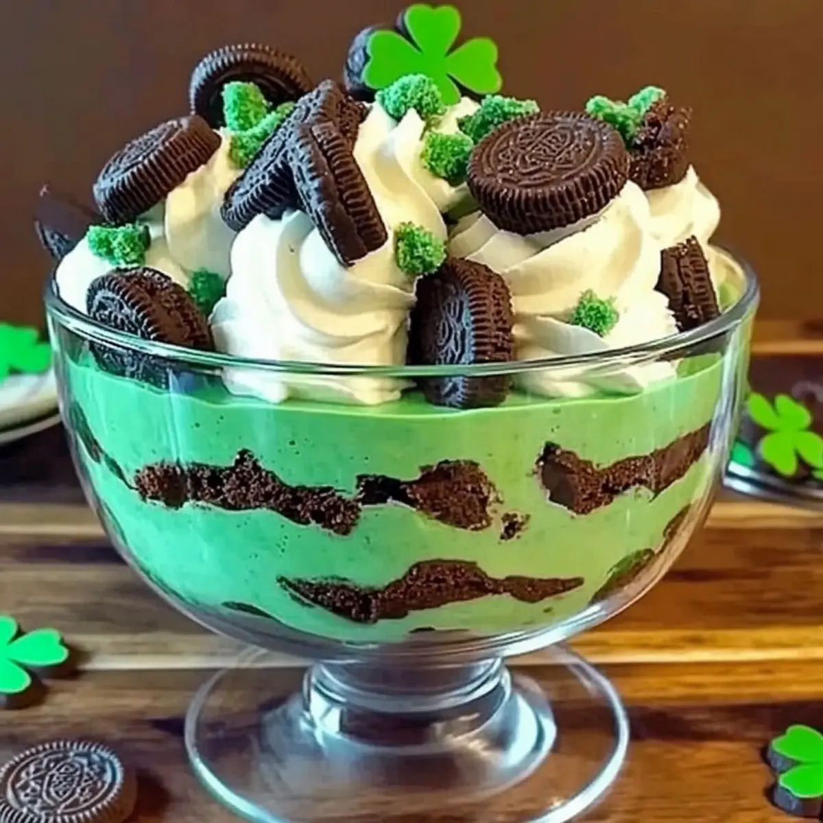 When ready to serve, uncover the trifle and add the final touch by sprinkling the reserved crushed Oreos on top. You can also add extra whipped topping in dollops and even toss on some green sprinkles for a festive flair. Your stunning St. Patrick’s Day Brownie Trifle is now ready to impress your guests!