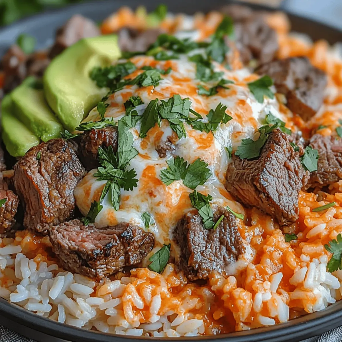 Once the rice is cooked, return the seared steak back into the skillet, gently mixing it with the rice. Pour the warm queso over the steak and rice mixture, stirring everything together until well combined. Allow it to heat through for an additional 2–3 minutes, ensuring everything is evenly coated with the creamy cheese sauce.