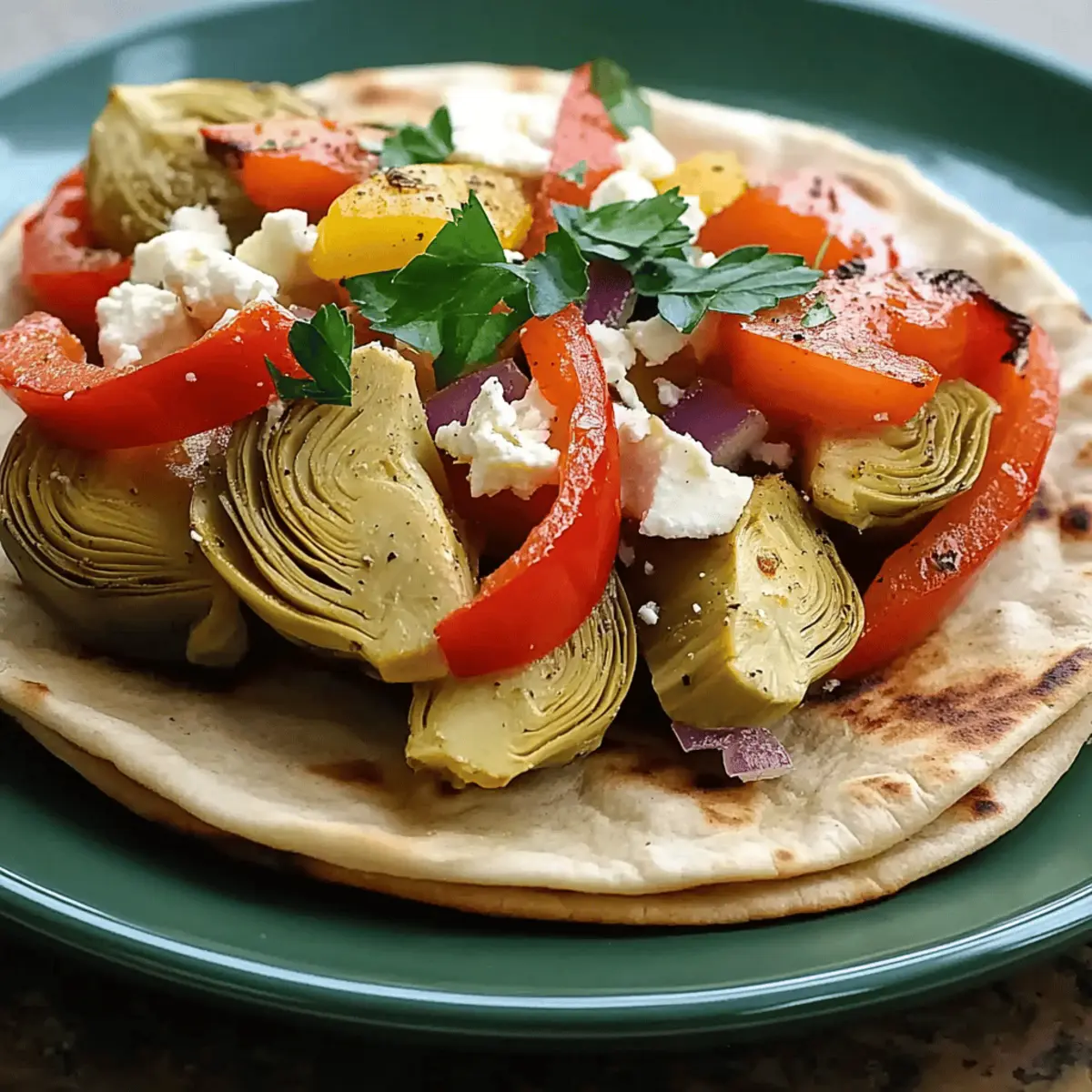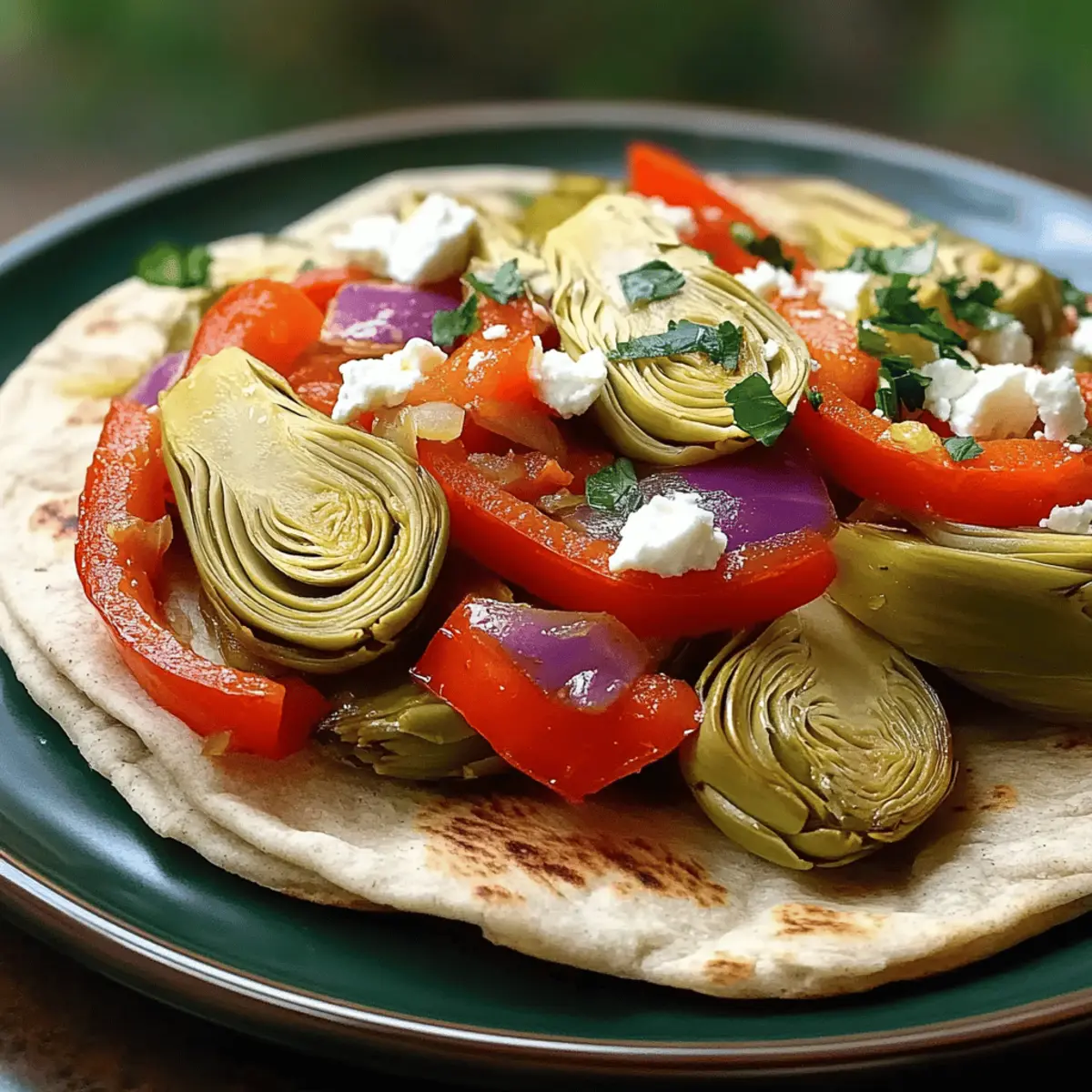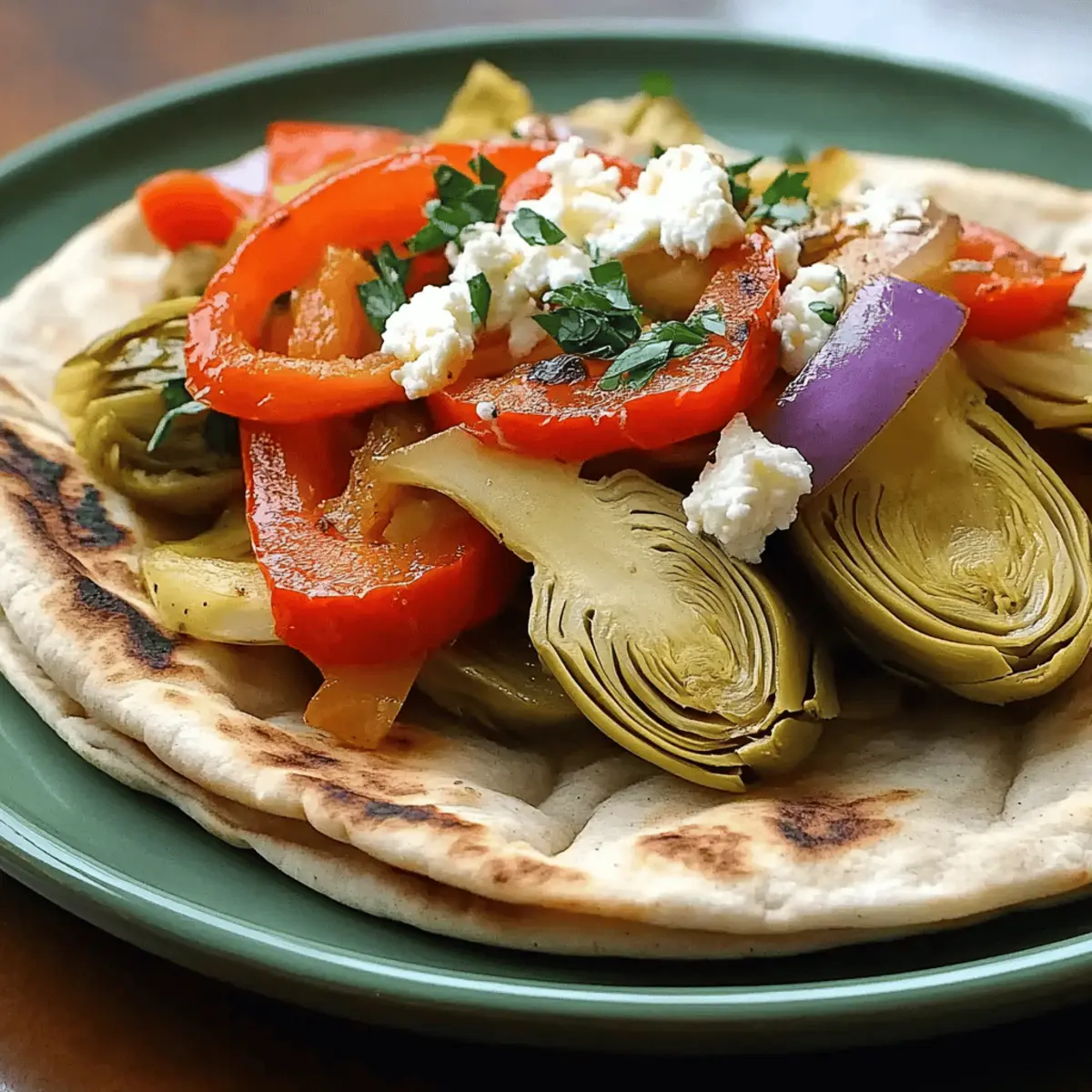 Jump to Recipe Print RecipeYou know that moment when you open your pantry and see a can of artichokes staring back at you, and suddenly inspiration strikes? That’s how these Perfect Stir-Fried Artichokes Pitas came to life! This recipe not only features tender artichoke hearts, but also sweet bell peppers and creamy feta, creating a delightful explosion of Mediterranean flavors right in your kitchen. Whipping up these pitas is a breeze, making them an ideal quick meal for those busy weekdays or a light dinner. Plus, with pantry staples at your fingertips, you can transform simple ingredients into something extraordinary. So, are you ready to embark on a culinary adventure that will take your taste buds on a sunny trip to the Mediterranean? Why are Stir-Fried Artichokes Pitas special? Quick and Easy: This recipe comes together in just 30 minutes, perfect for those busy weeknights! Flavor Explosion: The vibrant blend of artichokes, fresh garlic, and feta creates a Mediterranean experience you won’t forget. Flexibility: Easily modify the filling with your favorite vegetables or add extra toppings like Kalamata olives for added flair. Healthy Twist: Packed with plant-based nutrition, these pitas offer fiber and protein, making them a nourishing meal choice. Crowd-Pleaser: Perfect for both family dinners and gatherings; everyone will love this delightful dish! Stir-Fried Artichokes Pitas Ingredients For the Filling • Canned Artichoke Hearts – These tender hearts absorb flavors beautifully, enhancing the dish’s Mediterranean vibe. • Olive Oil – Use high-quality oil to elevate the sautéing process, contributing depth to your stir-fry. • Garlic – Fresh minced garlic provides the best aroma and taste, igniting the dish with essential Mediterranean notes. • Red Bell Pepper – Sweet and vibrant, offering color and flavor; alternatively, use yellow or orange peppers for a twist. • Red Onion – Adds a zesty kick; you can swap it out for yellow onion if it’s what you have on hand. • Dried Oregano – This herb imparts a concentrated Mediterranean aroma; for a fresher taste, increase the quantity of fresh oregano. • Feta Cheese – Creamy and salty, this enhances overall flavor; for a vegan version, either omit it or use goat cheese. For the Pitas • Whole Wheat Pitas – These provide a nutritious, chewy texture ideal for holding all the deliciousness inside; white pitas work too! • Salt and Pepper – Essential for seasoning the filling; adjust according to your taste preferences. Embrace this quick and delightful Stir-Fried Artichokes Pitas recipe, and let your taste buds travel to the Mediterranean! Step‑by‑Step Instructions for Stir-Fried Artichokes Pitas Step 1: Heat the Oil In a large skillet, heat 2 tablespoons of olive oil over medium heat. Allow the oil to warm for about 2 minutes until it shimmers, ensuring it’s hot but not smoking. This will create a perfect base for your stir-fry, providing flavor and moisture when you add the ingredients. Step 2: Sauté the Garlic Add 2 cloves of minced garlic to the heated oil and sauté for about 30 seconds. Stir constantly until the garlic becomes fragrant and turns light golden brown; be careful not to let it burn. This aromatic base will elevate the flavor profile of your Stir-Fried Artichokes Pitas. Step 3: Add the Peppers and Onion Next, toss in 1 sliced red bell pepper and 1 thinly sliced red onion, cooking them for 3-4 minutes. Stir frequently and watch for the vegetables to soften while still retaining a slight crispness. This step adds a lovely sweetness and color to your filling! Step 4: Incorporate Artichokes and Seasonings Now, fold in one can of drained and quartered artichoke hearts along with 1 teaspoon of dried oregano, salt, and pepper to taste. Sauté the mixture for about 5-7 minutes, letting the artichokes get golden edges and absorb all the delightful flavors. This is where your Stir-Fried Artichokes Pitas start to come together beautifully! Step 5: Warm the Pitas While the filling is finishing up, warm 4 whole wheat pitas in a dry skillet over low heat for about 1-2 minutes on each side. This step makes them pliable and prevents tearing when you fill them with your delicious artichoke mixture. Keep an eye on them to avoid burning. Step 6: Fill and Serve Finally, take the warm pitas and generously spoon the artichoke filling inside each one. Garnish with fresh tomatoes, Kalamata olives, or a squeeze of lemon juice if desired. This delicious assembly transforms your Stir-Fried Artichokes Pitas into a satisfying meal that’s ready to be enjoyed! Stir-Fried Artichokes Pitas Variations Feel free to explore these tasty twists and substitutions to personalize your dish, making every bite delightfully unique! Fresh Artichokes: Substitute canned artichokes with fresh, cooked artichokes for a more vibrant taste. Just remember to steam or boil them until tender before adding to the filling! Dairy-Free Delight: Omit feta for a dairy-free option or replace it with creamy hummus. This simple swap adds a new layer of flavor while keeping things plant-based. Veggie Boost: Add zucchini, mushrooms, or cherry tomatoes to the mix for extra nutrients and a heartier texture. Each vegetable brings its unique taste, elevating your Stir-Fried Artichokes Pitas to new heights! Herb Varieties: Experiment with fresh herbs such as basil or mint in place of oregano. These aromatic options can infuse a refreshing aroma and flavor, taking your dish in delightful new directions. Extra Crunch: Incorporate toasted pine nuts or sunflower seeds for a crunchy texture. They bring a lovely nutty flavor that pairs beautifully with the soft artichokes and creamy cheese. Spice it Up: Enhance the heat by adding crushed red pepper or a pinch of cayenne to the sauté. This will set your taste buds dancing with a kick of spiciness! Zesty Finish: Drizzle your finished pitas with a balsamic glaze or a squeeze of lemon juice for an extra bur