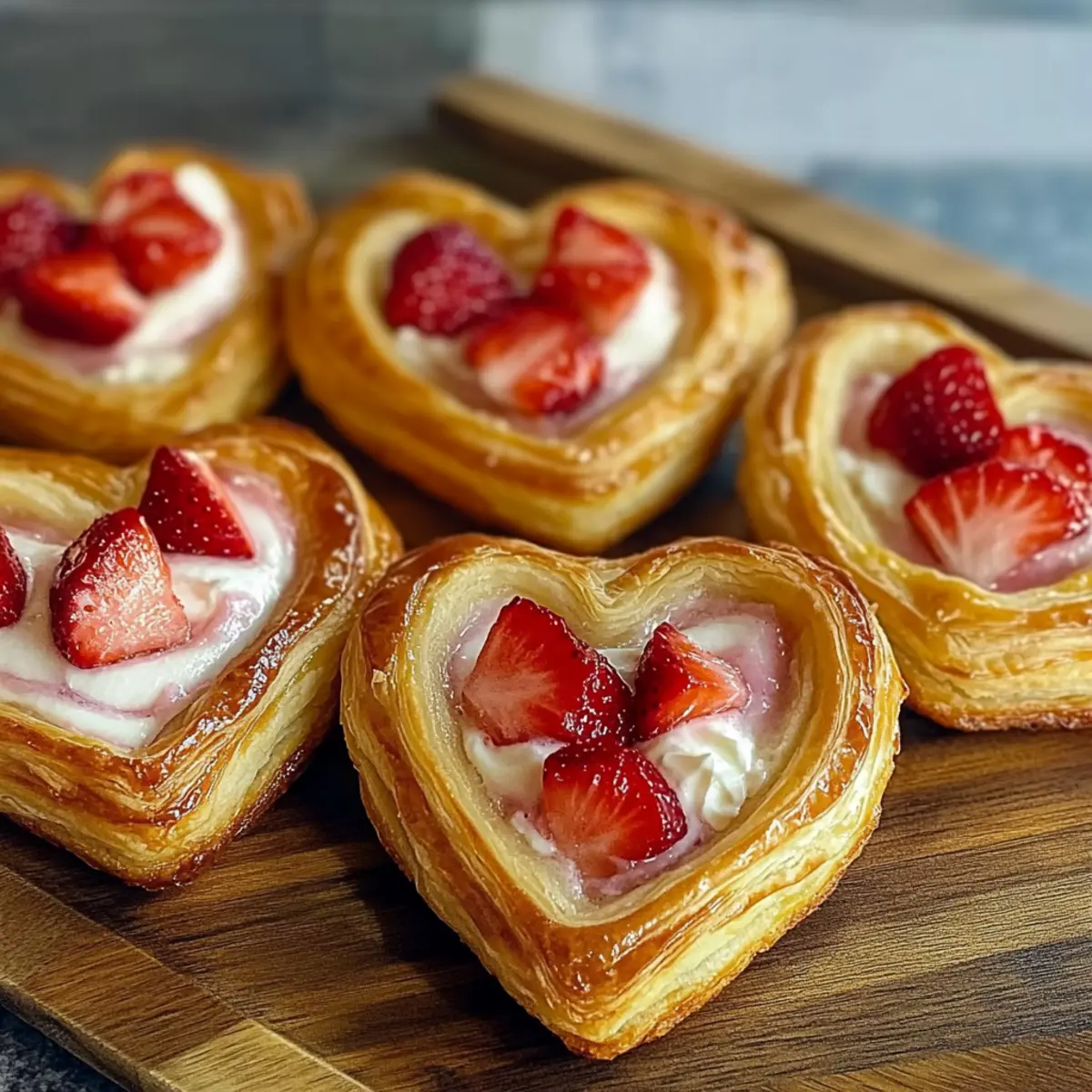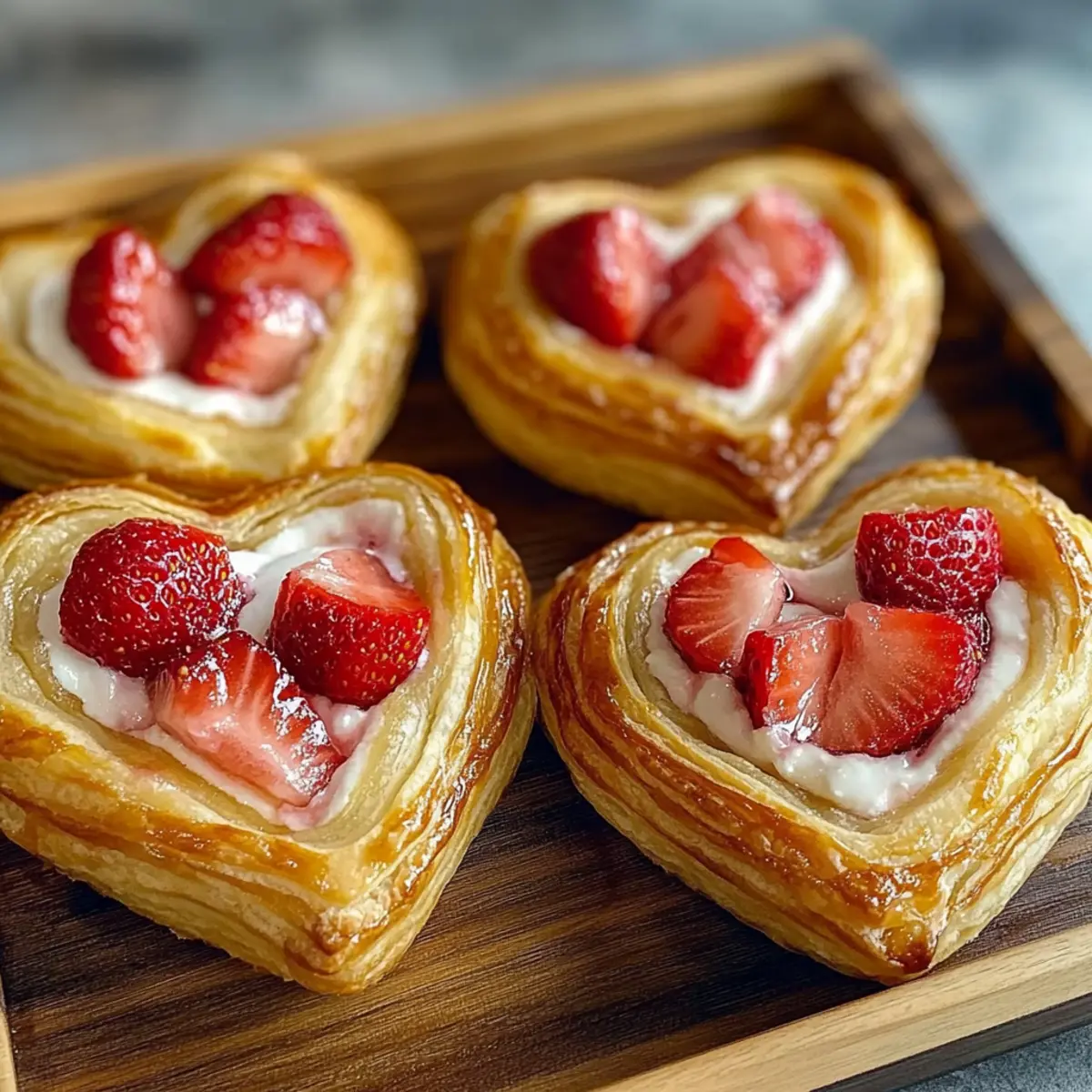 Jump to Recipe Print RecipeAs I unwrapped the store-bought puff pastry, a wave of excitement swept over me—this was the beginning of something deliciously special. The Strawberry Cream Cheese Heart Danishes I was about to create would transform any morning into a charming occasion, bringing joy to brunch tables or perfecting the intimate setting for a heartwarming Valentine’s Day. With their flaky exterior and luscious cream cheese filling, these pastries are not only a breeze to make but also serve as a delightful crowd-pleaser that looks like a masterpiece from your favorite bakery. Plus, they offer the perfect balance of sweetness and tang to soothe any craving. Curious how to whip up these delectable treats? Let’s dive in! Why will you adore these danishes? Decadent Flavor: Each bite reveals a delicious blend of fresh strawberries and rich cream cheese, perfectly balanced for a treat that satisfies your sweet tooth. Quick & Easy: No need for advanced baking skills; utilizing store-bought puff pastry saves time while providing a bakery-like touch. Perfect for Any Occasion: Whether you’re celebrating Valentine’s Day or hosting a brunch, these charming heart shapes make every moment feel special. Versatile Variations: Feel free to get creative! Swap strawberries with other fruits or experiment with flavors to match your mood or season. Impressive Presentation: Your guests will be wowed by the golden-brown finish and delightful aroma, making these danishes the star of any gathering. For more heartwarming recipes, check out our Strawberry Cheesecake Cinnabon for another sweet surprise! Strawberry Cream Cheese Heart Danishes Ingredients For the Pastry Store-bought puff pastry – Provides the flaky, airy texture for the danishes; crescent roll dough can substitute, but expect a different texture. For the Filling Cream cheese – Adds richness and creaminess; ensure it’s at room temperature for easy mixing, or use dairy-free cream cheese for a vegan option. White sugar – Sweetens the cream cheese filling; for a smoother consistency, consider using powdered sugar. Vanilla extract – Enhances the flavor of the filling beautifully. Red food coloring (optional) – Adds a delightful pop of color; omit or swap for strawberry jam for a natural tint. Diced strawberries – Fresh strawberries are ideal for maximum flavor; if using frozen, thaw and drain them well to prevent sogginess. For the Egg Wash Egg & water – Provides a shiny golden finish to the baked pastry; brush on the edges before baking. Let the charming flavors of these Strawberry Cream Cheese Heart Danishes make your next brunch unforgettable! Step‑by‑Step Instructions for Strawberry Cream Cheese Heart Danishes Step 1: Thaw the Puff Pastry Start by allowing the store-bought puff pastry to thaw at room temperature, which typically takes about 30–60 minutes, or overnight in the fridge for a more gradual process. Once it’s soft enough to unfold without tearing, you’ll know it’s ready to be transformed into your Strawberry Cream Cheese Heart Danishes. Step 2: Preheat the Oven As the pastry thaws, preheat your oven to 400°F (200°C). Line a baking sheet with parchment paper to prevent sticking and ensure easy cleanup once your danishes come out golden and flaky. This preparation step is crucial for achieving that perfect crunchy texture. Step 3: Make the Cream Cheese Filling In a mixing bowl, beat together room temperature cream cheese, white sugar, and vanilla extract until the mixture becomes smooth and creamy. If you wish to add a delightful touch of color, mix in a few drops of red food coloring. Finally, gently fold in half of the diced strawberries, allowing their freshness to shine through your cream cheese filling. Step 4: Prepare the Pastry Shapes On a lightly floured surface, roll out the thawed puff pastry to a thickness of about 1/8 inch. Use a 3–4 inch heart-shaped cookie cutter to cut out heart shapes, yielding about four hearts. To create a shallow edge for your filling, lightly score a smaller heart shape inside each cut-out without cutting all the way through. Step 5: Fill the Pastries Spoon or pipe 1–2 tablespoons of the creamy filling into the center of each heart shape. Top each cream cheese mixture with the remaining diced strawberries, being cautious not to overfill; this will keep your pastries neat and aesthetically pleasing after baking. Step 6: Apply the Egg Wash In a small bowl, whisk together the egg and a splash of cold water to create an egg wash. Brush this mixture carefully around the edges of the uncovered pastry, which will give your Strawberry Cream Cheese Heart Danishes a lovely golden color and shine once baked. Step 7: Bake the Danishes Transfer the filled heart-shaped pastries onto your prepared baking sheet and place them in the preheated oven. Bake for 12–15 minutes, until they puff up beautifully and turn a deep golden-brown. Rotate your pan halfway through baking to ensure even cooking for that mouthwatering finish. Step 8: Cool and Serve Once baked to perfection, remove the danishes from the oven and allow them to cool on the baking sheet for a few minutes. Then, transfer them to a wire rack to cool completely. Optional: Dust with powdered sugar for a sweet touch before serving these delightful Strawberry Cream Cheese Heart Danishes at your next brunch or festive occasion. Strawberry Cream Cheese Heart Danishes Variations Feel free to get creative and customize these danishes to elevate your baking experience! Berry Blitz: Substitute strawberries with a mix of raspberries, blueberries, or blackberries for a vibrant, fruity explosion. Zesty Twist: Add a splash of lemon juice to the cream cheese filling for a refreshing citrus zing that complements the sweetness. Nutty Flavor: Fold in some chopped nuts—like pistachios or walnuts—into the filling for a delightful crunch and nutty depth. Chocolate Lover’s Delight: Drizzle melted dark chocolate on top of the c