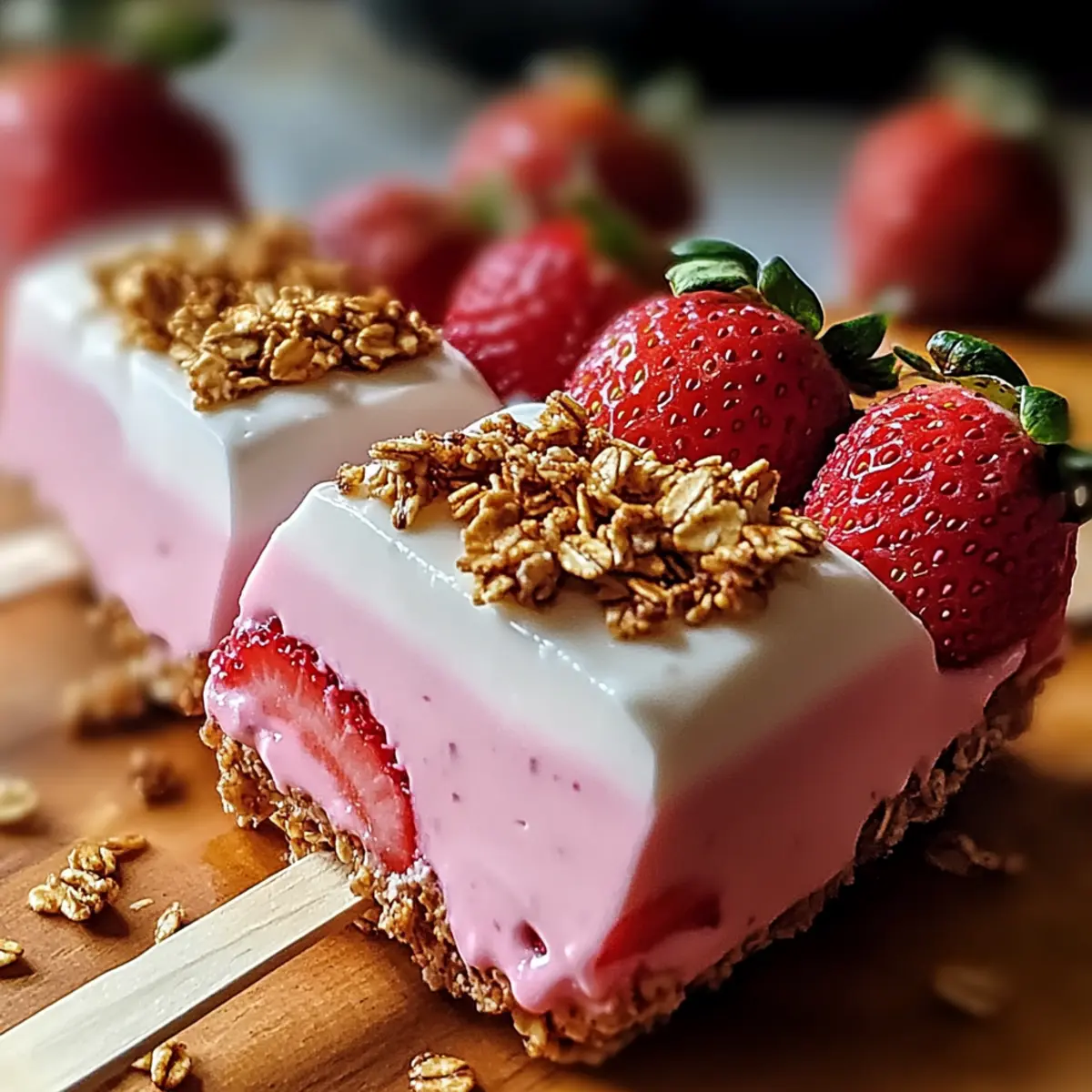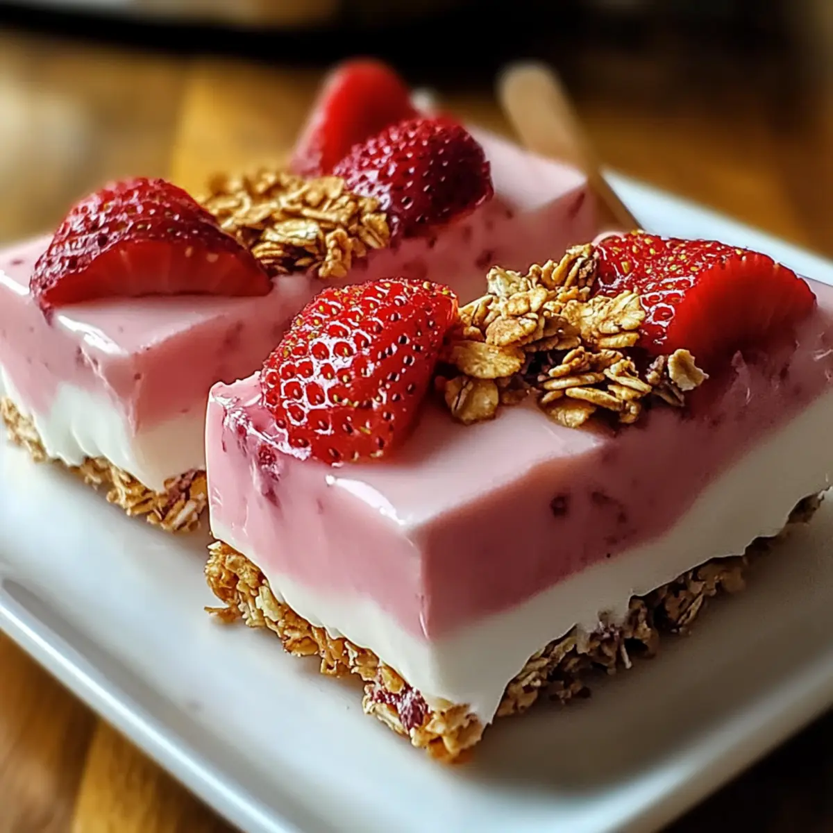 Jump to Recipe Print RecipeAs summer approaches, I find myself yearning for cool treats that don’t compromise on health. That’s where these Layered Strawberry Yogurt Bars come into play—an easy, no-bake delight that transforms ordinary ingredients into something extraordinary. With a crunchy granola base and luscious creamy layers, topped with vibrant strawberries, these bars are not only a refreshing summer snack but also a customizable canvas for whichever fruits and yogurts you prefer. In just a few simple steps, you can whip up this guilt-free indulgence that’s perfect for family gatherings or a quick pick-me-up. Ready to dive into this healthy, delicious world of Strawberry Yogurt Bars? Let’s get started! Why Are These Strawberry Yogurt Bars Irresistible? Deliciously Customizable: You can tailor every bar to fit your taste—swap strawberries for blueberries or add nuts for that extra crunch! Quick & Easy: Made without baking, these bars come together in no time, perfect for busy summer days. Healthful Indulgence: Each bar offers a guilt-free treat with only 150 calories—ideal for your snack cravings! Crowd-Pleasing Appeal: Whether for kids or adults, everyone loves this refreshing and vibrant snack that’s also visually stunning. Ultimate Summer Snack: With creamy yogurt and fresh fruit, these bars are your go-to for a cool, nutritious pick-me-up in hot weather. Pair It Perfectly: Match them with a refreshing berry smoothie or some of those Fried Strawberry Cheesecake Sandwiches for an amazing summer spread! Strawberry Yogurt Bars Ingredients For the Granola Base • Granola – Provides texture and crunch; substitute with gluten-free granola for a gluten-free option. • Melted Coconut Oil – Binds the granola mixture; can be replaced with melted butter for added richness. • Honey – Sweetens the granola and yogurt layers; for a vegan option, use maple syrup. • White Chocolate Chips – Adds sweetness and creaminess; optional, can substitute with dark chocolate for a rich flavor. For the Yogurt Layers • Plain Greek Yogurt – Offers a creamy texture and protein; replace with plant-based yogurt for a dairy-free option. • Vanilla Greek Yogurt – Enhances sweetness and flavor; feel free to use any flavored yogurt as a substitute. For the Strawberry Layer • Fresh Strawberries – Provides color and natural sweetness; frozen strawberries can work if thawed. • Lemon Juice – Brightens the flavors of the strawberries; fresh lime juice is an acceptable alternative. • Vanilla Extract – Complements overall flavors; lemon extract can be used for a zestier variation. For Assembly • Popsicle Molds – Essential for shaping your yogurt bars into that delightful, grab-and-go form. Step‑by‑Step Instructions for Strawberry Yogurt Bars Step 1: Prepare Strawberry Puree Begin by blending 1½ cups of fresh strawberries with honey and lemon juice in a blender or food processor until smooth. This process will take about 1-2 minutes. Once fully blended, chop the remaining strawberries into small pieces for added texture. Set both the puree and chopped strawberries aside as you move on to the yogurt layers. Step 2: Mix Yogurt Layers In a medium bowl, combine 1 cup of vanilla Greek yogurt, a tablespoon of honey, and a splash of vanilla extract. Stir until smooth and fully incorporated, creating a sweet and creamy yogurt layer. In another bowl, mix the plain Greek yogurt with the previously prepared strawberry puree and diced strawberries until well combined, adding a lovely pink hue to your mixture. Step 3: Combine Granola Base In a large bowl, mix together the granola, melted coconut oil, and honey. Use a spatula to ensure that every granola piece is well-coated—this will take about 1-2 minutes for proper binding. If desired, fold in white chocolate chips for an extra touch of sweetness. This granola mixture serves as the crunchy base of your Strawberry Yogurt Bars. Step 4: Assemble Bars Take your popsicle molds and press the granola mixture firmly into the bottom of each mold, creating an even base. Next, fill each mold halfway with the vanilla yogurt mixture, smoothing it out gently. Then, layer the strawberry yogurt mix on top, filling the molds to the brim. Insert popsicle sticks straight down into the mixture, ensuring they stand upright. Step 5: Freeze and Set Place the filled molds into the freezer for at least 4 hours, or until they are completely firm. To check for doneness, gently press the popsicle; it should be solid and not mushy. This freezing process allows the different layers to blend beautifully while solidifying into your delightful Strawberry Yogurt Bars. Step 6: Unmold and Serve Once fully frozen, remove the molds from the freezer. To make unmolding easier, run warm water over the outside of the molds for about 30 seconds. Gently pull on the popsicle sticks to release the bars. Serve immediately and enjoy the refreshing flavors of your homemade Strawberry Yogurt Bars, perfect for a healthy snack or dessert. What to Serve with Layered Strawberry Yogurt Bars These vibrant, frozen treats pair perfectly with an array of delightful accompaniments that enhance their refreshing flavors. Light Lemon Shortbread Cookies: The buttery, tangy sweetness of these cookies contrasts beautifully with the creamy yogurt bars, creating a delightful snack spread. Fresh Fruit Salad: A medley of seasonal fruits will amplify the fruity notes in the yogurt bars while adding a satisfying freshness to each bite. Consider a mix of melon, kiwi, and berries. Refreshing Berry Smoothie: Blend up your favorite berries, yogurt, and a splash of almond milk to create a creamy, cool drink that complements the bars perfectly. Crispy Coconut Chips: These light, crunchy chips add a delightful texture that pairs wonderfully with the smoothness of the yogurt without overwhelming its fruity flavors. Honey and Yogurt Dip: Serve additional yogurt mixed with a touch of honey as a dip for th