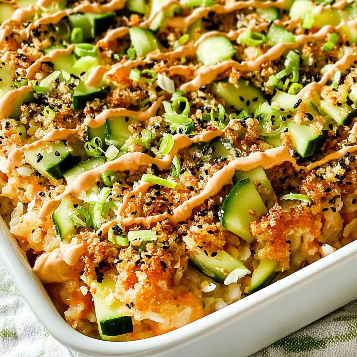 These Sushi Bake ingredients are perfect for meal prep enthusiasts! You can prepare the sushi rice up to 24 hours in advance; just refrigerate it in an airtight container after cooling to prevent drying out. The crab filling can also be mixed and stored for up to 3 days ahead, ensuring you have everything ready to assemble when needed. To maintain the quality of your final dish, leave the avocado, cucumber toppings, and panko breadcrumbs off until just before serving; this keeps the textures fresh and crunchy. When you’re ready to enjoy your delicious Sushi Bake, simply assemble the layers, bake for 10-15 minutes until heated through, and then add the fresh toppings for a delightful meal!