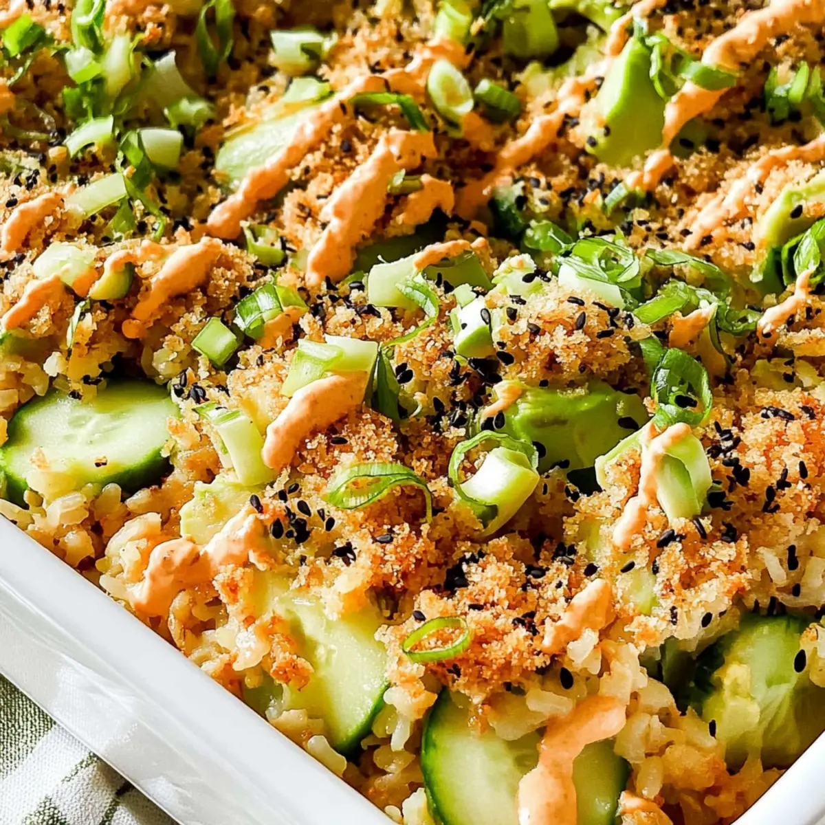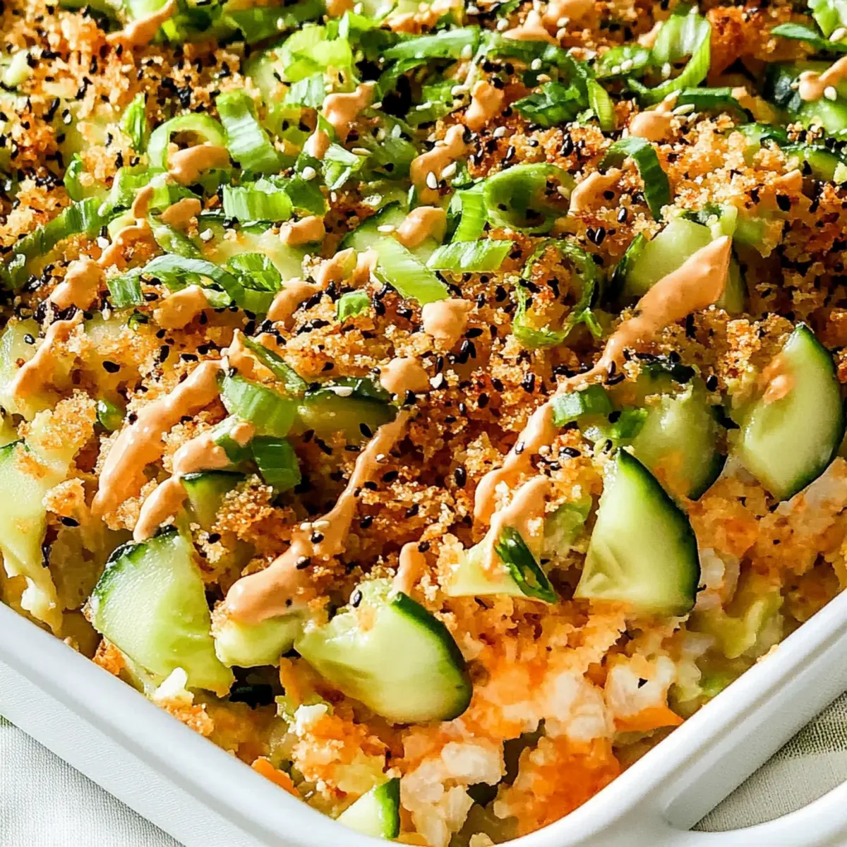 Once the sushi bake is out of the oven, spread a layer of mashed avocado on top of the crab mixture while it’s still warm. Then, layer the marinated cucumbers evenly over the avocado. Sprinkle the toasted panko crumbs generously on top, followed by a drizzle of Sriracha mayo for a kick of heat. Finally, garnish everything with chopped green onions and a sprinkle of furikake to enhance the flavor and presentation of your warm, delightful Sushi Bake.