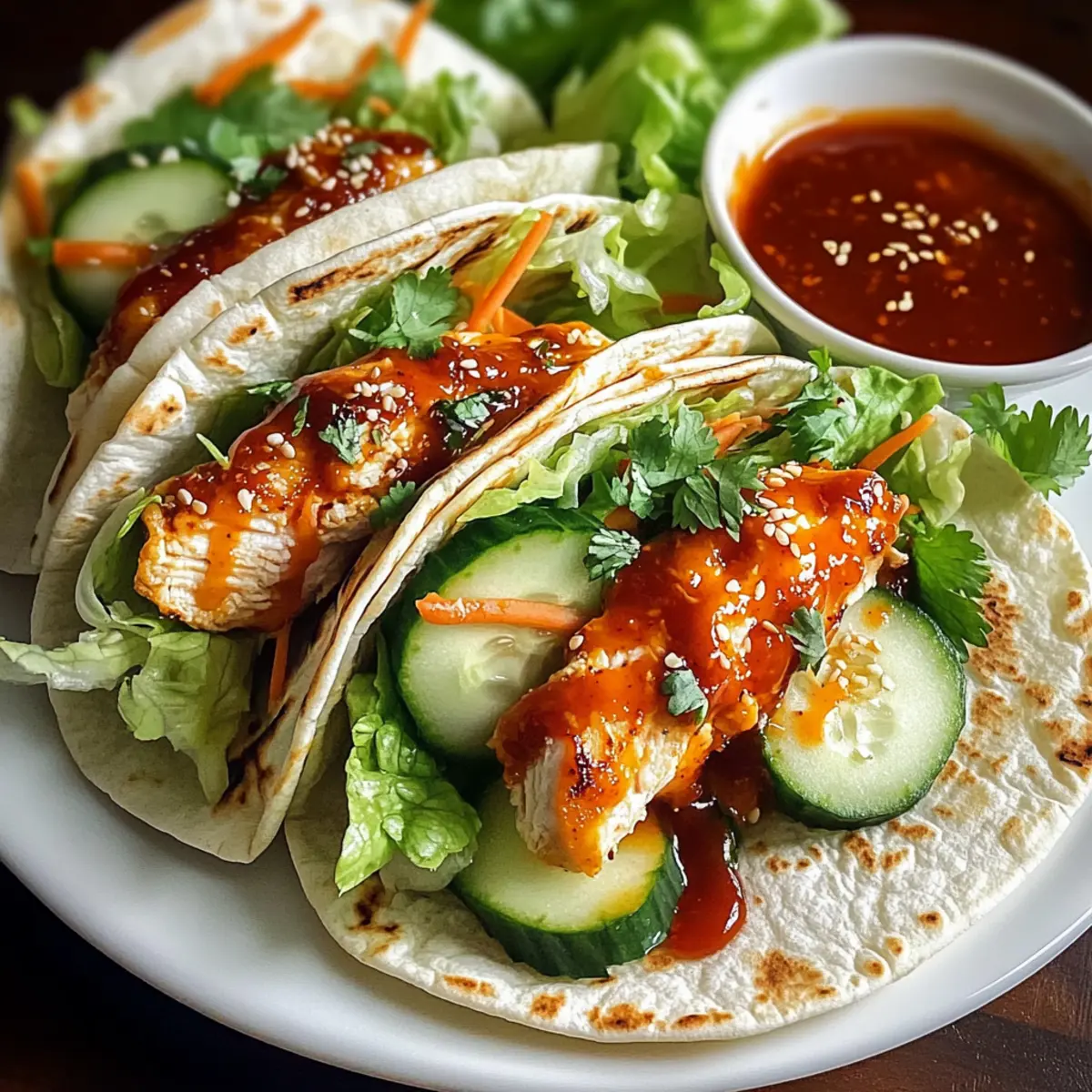 On each warmed tortilla, start layering with shredded lettuce to create a cool, crunchy base. Next, add a generous portion of the sliced chicken strips, followed by shredded carrots and diced cucumbers. If you love herbs, sprinkle some cilantro on top for that extra burst of flavor.