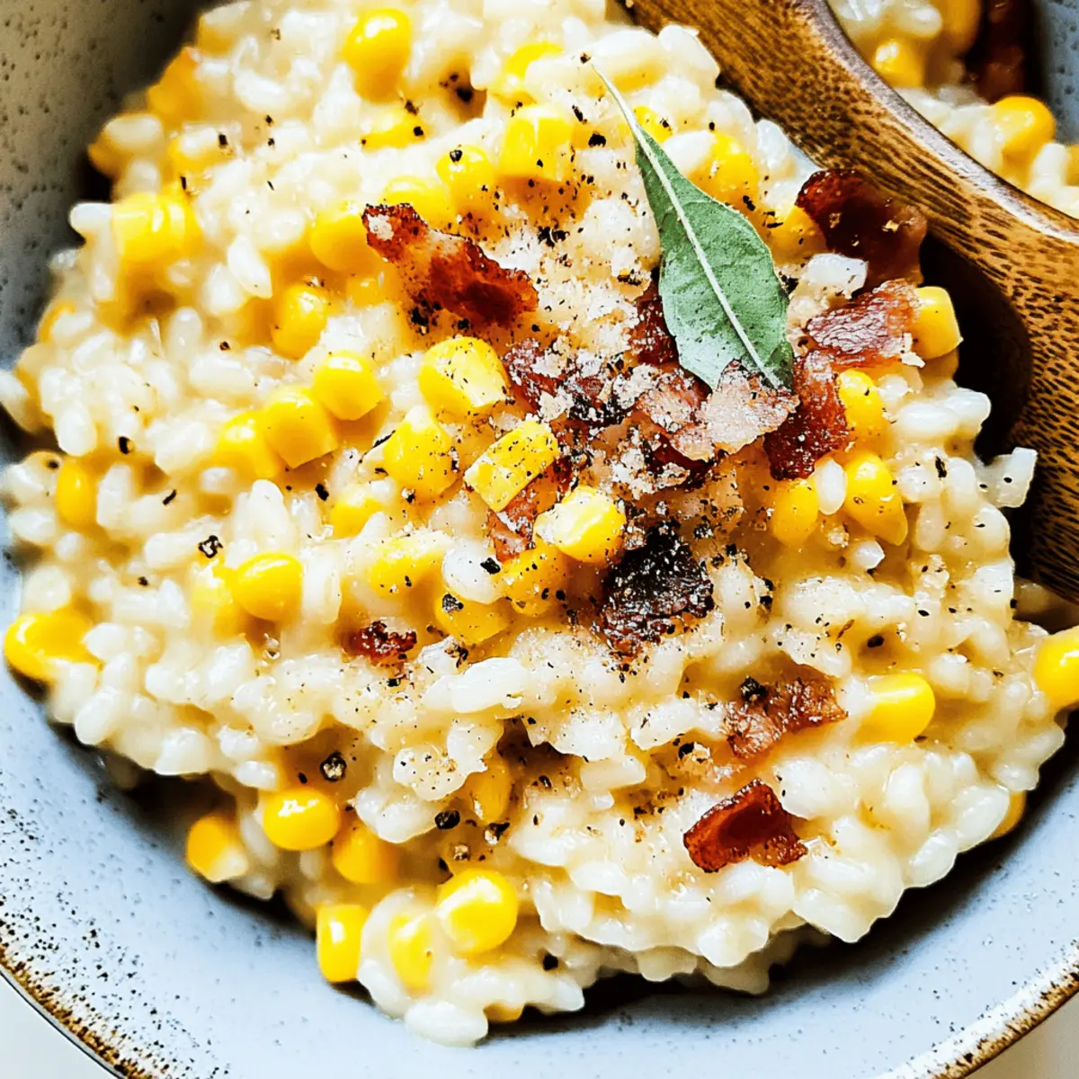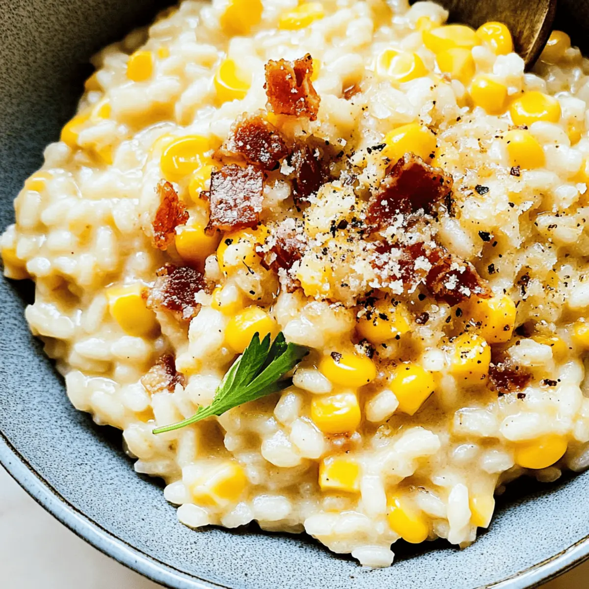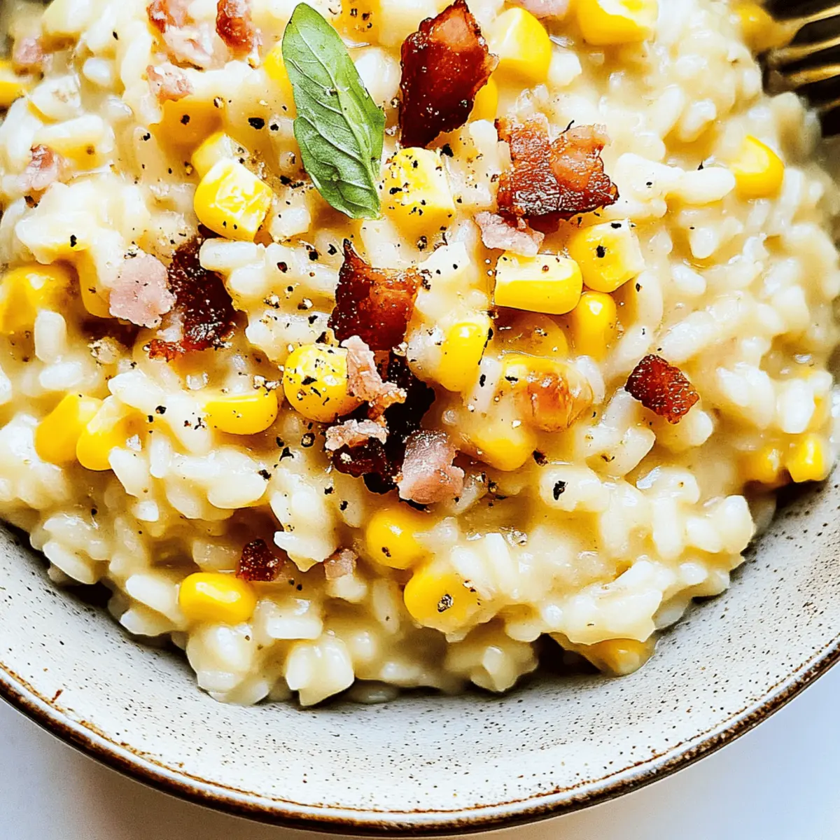 Jump to Recipe Print RecipeAs I sautéed onions and garlic the other day, a wave of nostalgia washed over me, reminding me of sun-soaked summer days spent at home. That’s the kind of warmth you’ll feel with this creamy Sweet Corn Risotto, where every bite resonates with sweet summer corn and comforting flavors. This dish brings the essence of the season to your table, making it perfect for everything from cozy weeknights to special gatherings. Topped with crispy pancetta for a satisfying crunch, it’s a crowd-pleaser that effortlessly transforms into a vegetarian or vegan delight with just a few simple swaps. Whether you’re looking to impress or just craving something heavenly, this risotto won’t disappoint. Curious about how to achieve that perfect creaminess? Keep reading! Why is this risotto so irresistible? Creaminess is the star here! Each spoonful of Sweet Corn Risotto envelops you in a velvety texture that’s both comforting and indulgent. Seasonal appeal comes alive with fresh, sweet corn, making it a perfect choice for summer gatherings or cozy nights in. Versatile yet impressive, it easily adapts for dietary preferences—swap pancetta for crispy sage for a delightful vegetarian twist. Effortlessly elegant, this dish can stand alone or pair beautifully, like with Sausage Sweet Potatoes or Cornbread Muffins Moist. Plus, the blend of flavors tantalizes your palate, ensuring every guest leaves satisfied! Sweet Corn Risotto Ingredients • The following ingredients will help you create a creamy, comforting Sweet Corn Risotto that impresses! For the Risotto Arborio Rice – The key ingredient for achieving that creamy texture as it releases starch during cooking. Sweet Corn – Fresh corn adds natural sweetness and texture; feel free to use frozen if necessary, but fresh truly sings! Vegetable Broth – This flavorful liquid is essential; ensure it’s gluten-free for dietary needs, or substitute with chicken broth if desired. Onion – A foundational flavor, but you can switch to shallots for a milder and sweeter undertone. Garlic – Fresh garlic is best to elevate the aroma and flavor of your risotto. For Flavor and Texture Bell Pepper – Adds a touch more sweetness and color; any color works, but red or yellow are particularly delightful! White Wine – Introduces acidity and depth; if you skip this, replace it with more broth, though the flavor may be a bit less complex. Butter – Adds a rich creaminess; for a dairy-free option, olive oil can be substituted, albeit with a slight flavor difference. Parmesan Cheese – Historically used for flavor, it provides a savory, nutty essence; use nutritional yeast for a dairy-free alternative. For the Topping Pancetta – Crispy pancetta gives a salty contrast to the dish; swap it for crispy bacon or leave it out for a vegetarian version! Step‑by‑Step Instructions for Creamy Sweet Corn Risotto with Crispy Pancetta Step 1: Prepare Corn Stock In a saucepan, combine your vegetable broth with spent corn cobs, a bay leaf, and an optional parmesan rind. Simmer on medium heat for about 30 minutes to allow the flavors to infuse, keeping it warm while you prepare the risotto. The aroma should be inviting, setting a comforting tone for your Sweet Corn Risotto. Step 2: Cook Aromatics In a heavy-bottomed pot, melt 2 tablespoons of butter over medium heat. Add diced onion and minced garlic, sautéing until the onion becomes translucent and fragrant, about 5 minutes. The warmth of the butter and the scent of aromatics will signal that your base for the creamy risotto is on its way to perfection. Step 3: Toast Rice Add 1 cup of arborio rice to the pot, stirring well to coat it with the buttery mixture. Toast the rice for about 2–3 minutes until it begins to look translucent, lightly coated in the luscious butter. You’ll notice a nutty aroma emerge; this step is essential for achieving that delightful creaminess in the Sweet Corn Risotto. Step 4: Deglaze and Simmer Pour in ½ cup of white wine, using a wooden spoon to deglaze the pot by scraping up any flavorful bits stuck to the bottom. Stir continuously as the wine sizzles and evaporates, about 2-3 minutes. Then, start adding your warm corn stock one ladle at a time, stirring frequently; each ladle should be absorbed before adding the next, which will take around 20 minutes. Step 5: Add Corn and Bell Pepper As the rice reaches a creamy, al dente consistency, stir in 1 cup of sweet corn kernels and ½ cup of finely diced bell pepper. Continue cooking for an additional 5 minutes, allowing the vegetables to soften and meld their flavors into the risotto. You’ll notice the rich, golden color developing; this is where the magic of Sweet Corn Risotto truly shines. Step 6: Serve with Toppings In a small skillet, quickly sauté extra sweet corn with crispy pancetta and minced garlic over medium heat until golden and aromatic, about 4-5 minutes. Serve the Sweet Corn Risotto hot, topped with this crispy mixture for an added crunch and burst of flavor. The delightful contrast will elevate your dish, making it truly irresistible. Sweet Corn Risotto Variations & Substitutions Feel free to get creative with this Sweet Corn Risotto recipe by exploring delightful variations that cater to your taste buds. Vegetarian Option: Swap crispy pancetta for crispy sage leaves to maintain that satisfying crunch while keeping it meat-free. The earthiness of sage adds a lovely aromatic quality. Vegan Twist: Use olive oil instead of butter and skip the cheese, replacing it with nutritional yeast for a cheesy flavor. This version is still rich and comforting! Seasonal Veggies: Mix in seasonal vegetables like peas, zucchini, or asparagus to enhance the nutritional value and add vibrant color. It’s a great way to celebrate summer’s bounty! Herb Boost: Experiment with fresh herbs such as basil or parsley to add depth of flavor. A handful stirred in before serving can brighten up the dish dramatically. Extra C