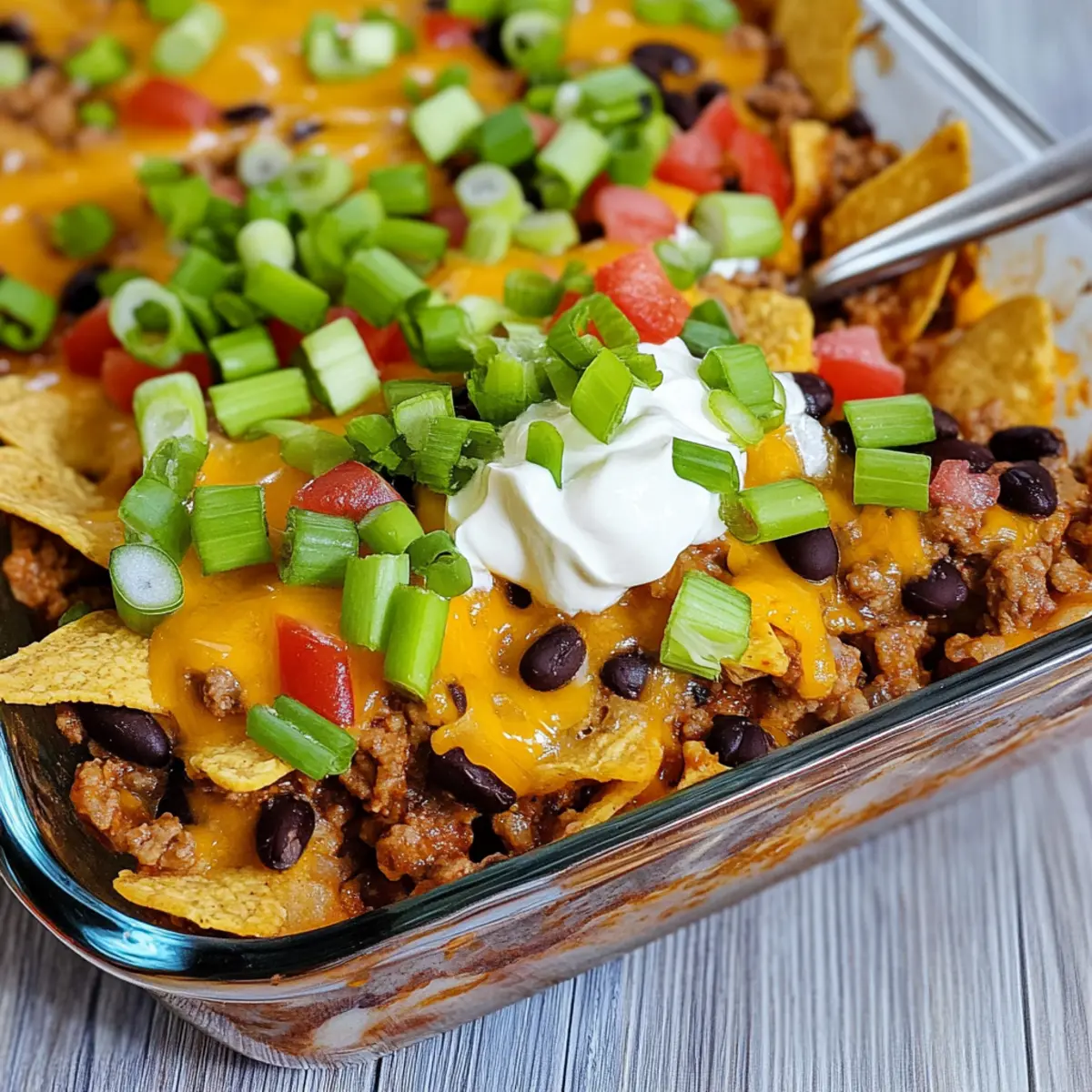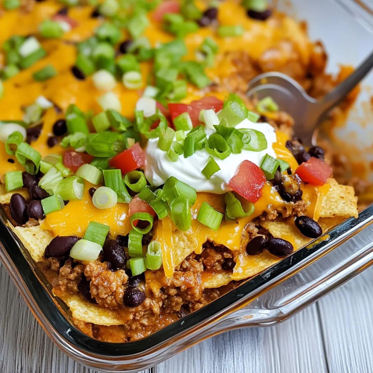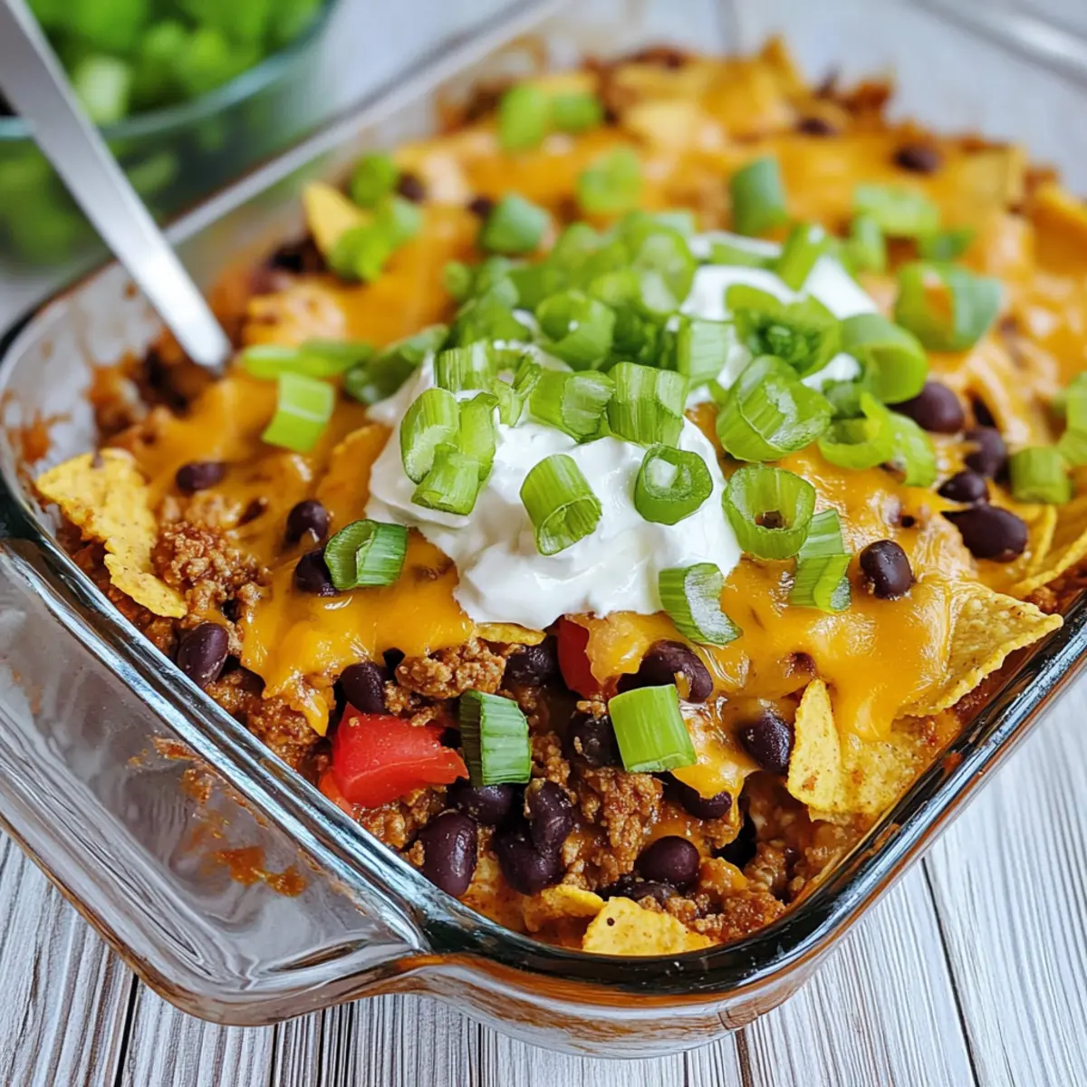 Jump to Recipe Print Recipe“Hey, did you ever think about turning your favorite street food into a cozy dinner?” That’s how the idea for my Easy Walking Taco Casserole was born! This dish wraps up all the deliciousness of tacos—seasoned ground beef, creamy sour cream, and a crunchy Fritos layer—into a warm and hearty casserole that’s perfect for busy weeknights or a festive Taco Tuesday. The best part? It’s family-friendly and make-ahead, so you can whip it up in no time and even enjoy leftovers later. Imagine serving this bubbly delight straight from the oven, ready to be topped with your favorite fixings! Are you ready to discover how to bring this fun twist to your table? Why Is Taco Casserole a Must-Try? Flavor Explosion: Dive into a medley of flavors with seasoned beef and creamy textures that elevate every bite. Crowd-Pleasing: Great for family dinners or gatherings, it turns ordinary nights into special events. Easy Preparation: With simple steps, anyone can master this dish, making it perfect for busy weeknights. Customizable Toppings: Dress it up with your favorite toppings like guacamole or jalapeños for a personal touch! Make-Ahead Magic: Prep it in advance, store it in the fridge, and pop it in the oven whenever you’re ready. For more easy dinner ideas, check out my Cheese Dog Casserole or Healthy Oven Tacos. Taco Casserole Ingredients • Get ready for a flavorful journey! For the Casserole Ground Beef – Use lean ground beef for a healthier dish; feel free to substitute with ground turkey or chicken. Small Onion – Adds a sweet, flavorful kick; shallots or leeks can work well in its place. Taco Seasoning – Essential for that classic taco flavor; consider making your own at home for a fresh twist. Water – Helps to combine flavors and moisten the meat; essential for softening those spices. Black Beans – Adds fiber and richness; swap them out with kidney beans or pinto beans if you like. Diced Tomatoes with Green Chiles – Brings moisture and a hint of spice; any canned diced tomatoes can work, altering the taste slightly. Sour Cream – Provides creaminess and balances the flavors; Greek yogurt is a healthier alternative if you prefer. Fritos Corn Chips – Offers a delightful crunch to the casserole; try Doritos for a bold flavor change. Mexican-Style Shredded Cheese – Melts to create a deliciously gooey layer; Monterey Jack or sharp cheddar makes a great substitute. Optional Toppings Green Onions – Add a fresh crunch and vibrant color to finish off your dish. Guacamole – Brings creaminess and a rich flavor; homemade or store-bought works great! Salsa – A zesty addition, perfect to mix in or drizzle on top for added taste. Jalapeños – For those who love a little heat, add fresh or pickled slices on top; spice it up! This Taco Casserole is not just a meal; it’s an experience waiting to unfold! Step‑by‑Step Instructions for Taco Casserole Step 1: Preheat and Prepare Preheat your oven to 350°F (175°C) and grab a 13×9 inch baking dish. Lightly coat the dish with non-stick spray to prevent sticking. This ensures your Easy Walking Taco Casserole comes out perfectly without any hassle. Once prepped, set the baking dish aside while you cook the beef mixture. Step 2: Brown the Beef In a large skillet over medium heat, add 1 pound of lean ground beef. Cook until the beef is browned and nearly cooked through, which takes about 5-7 minutes. As it cooks, use a spatula to break the meat into small pieces. When the beef is mostly browned, stir in 1 chopped small onion and sauté until the onion is soft and translucent, around 3-5 minutes. Step 3: Add Taco Seasoning Stir in 1 packet of taco seasoning along with ½ cup of water, increasing the heat to bring the mixture to a gentle boil. This step should only take 2-3 minutes. Keep an eye on the mixture as it bubbles, ensuring everything is well combined and coated in the delicious seasoning. Step 4: Mix in the Goodness Lower the heat and add 1 can of drained black beans, 1 can of diced tomatoes with green chiles, and ½ cup of sour cream to the skillet. Stir well to combine and cook for an additional 8-10 minutes until the mixture thickens slightly and is heated through. You’ll notice the vibrant colors and aromas as the flavors meld together beautifully. Step 5: Layer the Casserole Now it’s time to assemble your Taco Casserole! Start by layering Fritos corn chips evenly across the bottom of your prepared baking dish. Sprinkle 1 cup of shredded cheese on top of the Fritos, followed by the hearty beef mixture. Finish by topping with the remaining cheese, creating a deliciously cheesy crust. Step 6: Bake to Perfection Cover the baking dish with foil and place it in the preheated oven. Bake for 15 minutes to allow the flavors to blend together. After 15 minutes, carefully remove the foil and continue baking for another 5 minutes. You’ll know it’s ready when the cheese is bubbly and lightly golden on top, signaling that it’s time to serve. What to Serve with Easy Walking Taco Casserole Elevate your dining experience by pairing your casserole with delightful sides that enhance its flavors. Fresh Garden Salad: A crisp salad with mixed greens and a zesty vinaigrette balances the richness of the casserole. Grilled Corn on the Cob: Sweet, buttery corn adds a delightful crunch and flavor contrast, perfect for summer gatherings. Spanish Rice: Flavorful seasoned rice absorbs the savory tastes of the casserole, making each bite more satisfying and delicious. Guacamole and Tortilla Chips: This festive duo is not only a classic but also offers creamy and crunchy textures that complement your taco casserole beautifully. Sour Cream Dip: A creamy dip served with corn chips allows guests to mix and match flavors while enjoying all the textures of the meal. Margaritas: For a fun drink, pair with refreshing margaritas that bring a festive atmosphere to your dinner table! Each option adds a distinct taste an