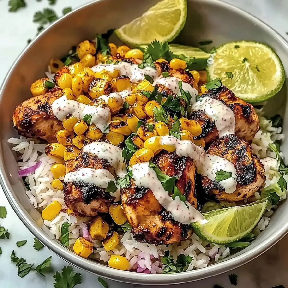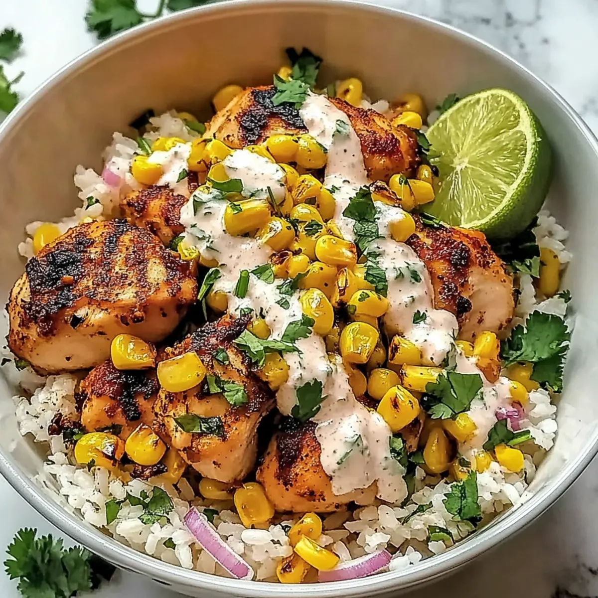 Jump to Recipe Print RecipeAs I stood by the stove, the vibrant colors of my Tasty Street Corn Chicken Bowl caught my eye, instantly lifting my spirits. This dish is a celebration of flavor and ease, harmonizing tender chicken thighs with the smoky, creamy allure of Mexican street corn—just what you need for a quick weeknight dinner! In no more than 30 minutes, this family-friendly meal emerges as a hearty, one-pot wonder that will satisfy everyone at the table. Not only is it a feast for the eyes, but it also balances convenience and deliciousness, making it perfect for those busy evenings when takeout seems all too tempting. Curious about how to bring this mouthwatering experience to your home? Let’s dive into the recipe! Why is this bowl a weeknight winner? Quick Prep Time: This Tasty Street Corn Chicken Bowl comes together in just 30 minutes, making it perfect for those hectic weeknights. Delicious Fusion: The smoky flavors of Mexican street corn blend beautifully with juicy chicken, creating a delightful bite that will have your family asking for seconds. One-Pot Magic: Save on cleanup with this one-pot meal that minimizes time in the kitchen while maximizing flavor on your plate. Customizable Feast: Whether it’s shrimp or tofu, you can easily adapt the recipe to fit your family’s preferences, ensuring everyone leaves the table satisfied. Nutrient-Rich: Packed with protein, carbs, and veggies, this dish not only pleases the palate, but also supports a balanced diet, making it ideal for meal prep. For more delicious ideas, check out our Garlic Chicken Thighs or Cheesy Garlic Chicken for additional weeknight inspiration! Tasty Street Corn Chicken Bowl Ingredients For the Chicken Boneless, Skinless Chicken Thighs – Provides moisture and flavor to the dish. Substitution: Bone-in thighs can work; adjust cooking time accordingly. Lime Juice – Adds acidity and brightness to both chicken marinade and the final dish. No ideal substitute; fresh lime is best. Avocado Oil – Used for marinating and cooking, adds healthy fats. Substitution: Olive oil can be used instead. Chili Powder – Adds warmth and depth of flavor. Substitution: Paprika can be used for a milder flavor. Ground Cumin – Enhances the earthy notes in the dish. Substitution: Garam masala for a twist on flavor. Garlic (powder or minced) – Provides a savory base flavor. Substitution: Fresh shallots can be used for a milder taste. Salt & Black Pepper – Essential for seasoning. Adjust according to taste preferences. For the Street Corn Mix Sweet Corn Kernels – Provides sweetness and texture. Note: Grilled or sautéed is preferred; frozen corn must be thawed and charred for best flavor. Sliced Red Onion – Adds crunch and sharpness to the corn mix. Substitution: Green onions for a milder taste. Sour Cream & Mayonnaise – Creates a creamy element in the street corn mix. Substitution: Greek yogurt for a tangy alternative. Cotija Cheese – Adds creaminess and a salty bite. Substitution: Feta cheese or Parmesan cheese can be used. For Serving Prepared Rice – Provides a base for the bowl. Note: Use lime for seasoning; brown or jasmine rice is recommended. Fresh Cilantro Leaves – Used for garnish, adding brightness and freshness. Substitution: Chopped parsley for a different herbal flavor. Lime Wedges – Enhances flavor upon serving. Essential for freshness; no substitute. Step‑by‑Step Instructions for Tasty Street Corn Chicken Bowl Step 1: Marinate Chicken In a medium bowl, whisk together lime juice, avocado oil, chili powder, ground cumin, garlic powder, salt, and pepper. Coat the boneless, skinless chicken thighs thoroughly with the marinade, ensuring they’re evenly covered. Cover the bowl with plastic wrap and refrigerate for 15 to 30 minutes, allowing the flavors to infuse while you prepare the rest of the ingredients. Step 2: Sear Chicken Preheat a large skillet over medium-high heat and add a splash of avocado oil. Once hot, place the marinated chicken thighs in the skillet and sear for 8-10 minutes on each side, until the exterior is golden brown and the internal temperature reaches 165°F. Remove the chicken from the skillet and let it rest on a cutting board for a few minutes before slicing. Step 3: Prepare Street Corn Mix In a mixing bowl, combine the sweet corn kernels, sliced red onion, sour cream, mayonnaise, cotija cheese, chili powder, and a squeeze of lime juice. Stir well to blend the flavors, and season to taste with additional salt and pepper as needed. This creamy street corn mix will add a vibrant touch to your Tasty Street Corn Chicken Bowl. Step 4: Heat Rice In a microwave-safe bowl, warm the prepared rice for about 1-2 minutes until steaming. Alternatively, you can heat the rice on the stove over low heat until warmed through. Fluff the rice with a fork to keep it light and airy, then season with a pinch of salt and a squeeze of lime juice to enhance its flavor. Step 5: Assemble Bowls To assemble your Tasty Street Corn Chicken Bowl, divide the seasoned rice among serving bowls. Top each bowl with the sliced chicken thighs and generous spoonfuls of the creamy street corn mixture. Finish with a sprinkle of cotija cheese, fresh cilantro leaves, and a few lime wedges for a zesty finishing touch. Tasty Street Corn Chicken Bowl Variations Feel free to make this Tasty Street Corn Chicken Bowl your own—there are countless ways to customize this delicious recipe! Seafood Swap: Use shrimp instead of chicken for a delightful seafood twist. Just adjust cooking times to avoid overcooking the shrimp, which cook faster than chicken. Vegan Option: Substitute chicken with tofu or tempeh, marinating them with the same spices for an equally flavorful, plant-based meal. Spice Level Adjustment: Experiment with the chili powder by adding cayenne or jalapeños for a spicy kick. This can elevate the dish and cater to those who crave heat. Flavorful Rice Boost: Stir in cilantro, lime zest, or even a bit 