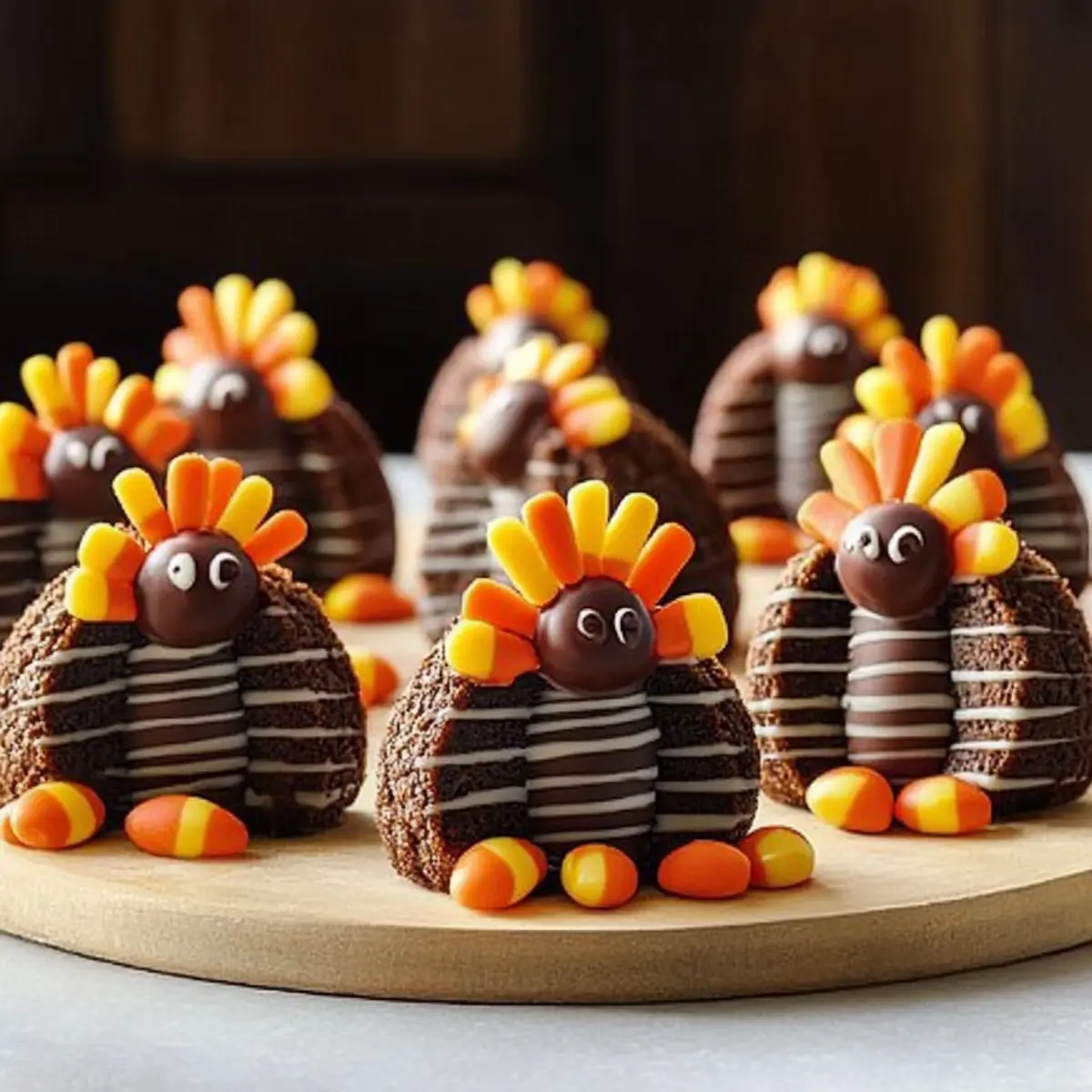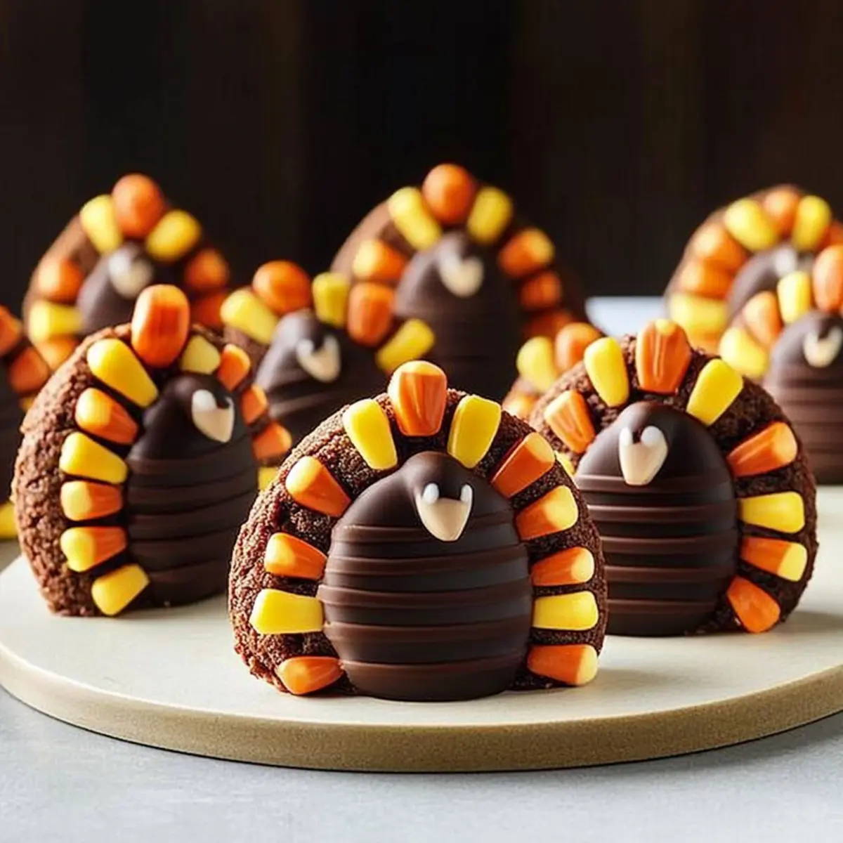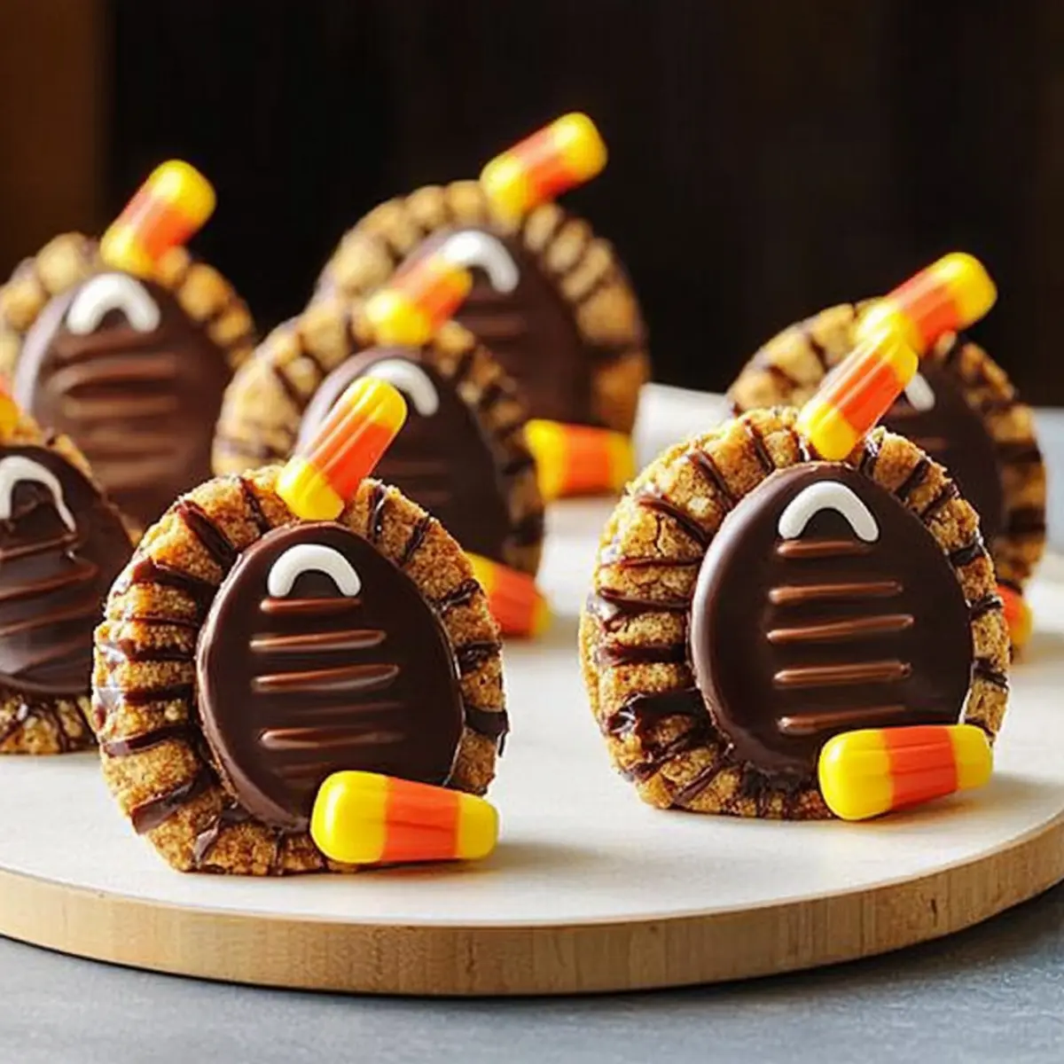Jump to Recipe Print RecipeThere’s something utterly delightful about transforming simple ingredients into whimsical creations that spark joy at the dinner table. These No-Bake Fudge-Stripe Turkey Cookies are just the ticket for bringing that magic to your Thanksgiving festivities! With just a handful of ingredients, including the irresistible crunchy fudge-striped cookies, this recipe is not only quick to assemble but also a fantastic way to engage your little chefs in the kitchen. Plus, they make for an eye-catching centerpiece that will have everyone at the dessert table eagerly reaching for seconds. Are you ready to create some adorable, festive treats that will tickle both taste buds and imaginations? Let’s get started! Why Are Fudge-Stripe Turkey Cookies a Must-Try? Simple, No-Bake Magic: These cookies require no baking at all, making them easy to whip up—perfect for busy Thanksgiving preparations. Kid-Friendly Fun: Engaging kids in the kitchen has never been easier! They’ll love assembling these adorable turkey creations, turning cooking into a delightful game. Visual Appeal: With their chocolatey bodies and colorful candy corn beaks, these cookies serve as a stunning centerpiece that will attract attention and smiles. Perfectly Tasty: Combining the beloved fudge-striped cookies with creamy frosting and chocolate-covered cherries results in a delicious treat that everyone will adore—just like our Gingerbread Oatmeal Cookies. Versatile Options: Feel free to substitute ingredients and create variations, such as using cake pops instead of cherries for a fun twist! This recipe offers endless potential. Quick Assembly: With just a few steps, you can create festive cookies that will have your guests coming back for more, ensuring your dessert table is the talk of the gathering. Turkey Cookie Ingredients Discover the sweet simplicity behind these delightful Turkey Cookies with this easy ingredient list! For the Cookie Base Fudge-Striped Cookies – The foundation of your turkey creation; their unique shape adds both flavor and fun! Trimmed Cookies – Use leftover fudge-striped cookies to enhance stability; they can help balance the turkey’s body. For the Frosting and Attachments Chocolate Frosting – Acts as the adhesive for your turkey parts; homemade frosting can give it an extra personal touch. Chocolate-Covered Cherries – The perfect round choice for the turkey’s body, but feel free to swap them with other chocolates like truffles! Candy Corn – Bright and colorful; these little treats form the turkey’s beak, bringing the character to life! Embrace the joy of making these Turkey Cookies as a festive centerpiece for your Thanksgiving celebrations! Step‑by‑Step Instructions for No-Bake Fudge-Stripe Turkey Cookies Step 1: Prepare Your Workspace Begin by gathering a flat, clean surface to assemble your Turkey Cookies. Lay out 20 fudge-striped cookies chocolate side down, ensuring they’re evenly spaced. A cookie tray or cutting board works well for this. This layout will serve as the foundation for your whimsical turkey creations, making it easy to see your progress as you layer the ingredients. Step 2: Trim Cookies for Stability Take the remaining fudge-striped cookies and carefully trim them using a sharp knife to create a flat edge. This step is essential for stability; aim for a straight cut that allows the cookie pieces to stand upright. If the cookies feel brittle, try placing them in a sealed container with a slice of soft bread for moisture before cutting. Step 3: Attach the Turkey’s Body Using a generous amount of chocolate frosting, place one chocolate-covered cherry on top of each base cookie. This cherry represents the adorable turkey body. Press gently to ensure it adheres well and stands firmly. Let your decorated base cookies rest for a minute; this will help the frosting set slightly and provide a good foundation for the next step. Step 4: Add the Turkey’s Feathers Now it’s time to attach the trimmed cookie pieces as feathers. Position these cookies perpendicular to the fudge-striped base cookies, using frosting as glue to secure them in place. Allow about six trimmed cookies per turkey for a festive look. Press gently to ensure they stick and create a vibrant, eye-catching display that captures the essence of your Turkey Cookies. Step 5: Create Beaks with Candy Corn Using a small dab of frosting, attach a piece of candy corn to the front of each cherry to serve as the turkey’s beak. Aim for a stable, neat application so that they stay in place. This small detail adds character and color to your fudge-stripe turkey cookies, making them charming and playful for your Thanksgiving celebrations. Step 6: Let Them Set Once all pieces are assembled, allow your Turkey Cookies to set for about 15-20 minutes at room temperature. This rest period will help the frosting firm up, ensuring everything stays intact. If you’re in a hurry, you can place them in the refrigerator for a quicker set time, but avoid moisture to keep your cookies crisp and delightful! What to Serve with No-Bake Fudge-Stripe Turkey Cookies? These festive treats are not only fun to make but also perfect for creating a well-rounded dessert spread for your Thanksgiving feast. Pumpkin Pie: The classic Thanksgiving dessert provides a creamy contrast to the crunchy turkey cookies, enhancing the holiday flavors. Nothing beats slicing into a pumpkin pie after the excitement of assembling these whimsical treats! Whipped Cream: A dollop of fluffy whipped cream can elevate the presentation of your fudge-stripe turkey cookies, adding a light, airy texture that beautifully complements their rich chocolate. Fruit Salad: Fresh fruit salad brings brightness and a hint of tartness that balances the sweetness of the cookies. Mixing seasonal fruits like cranberries and oranges adds a delightful crunch and color to your table. Apple Cider: Serve warm apple cider to accompany the treats; its sweet 