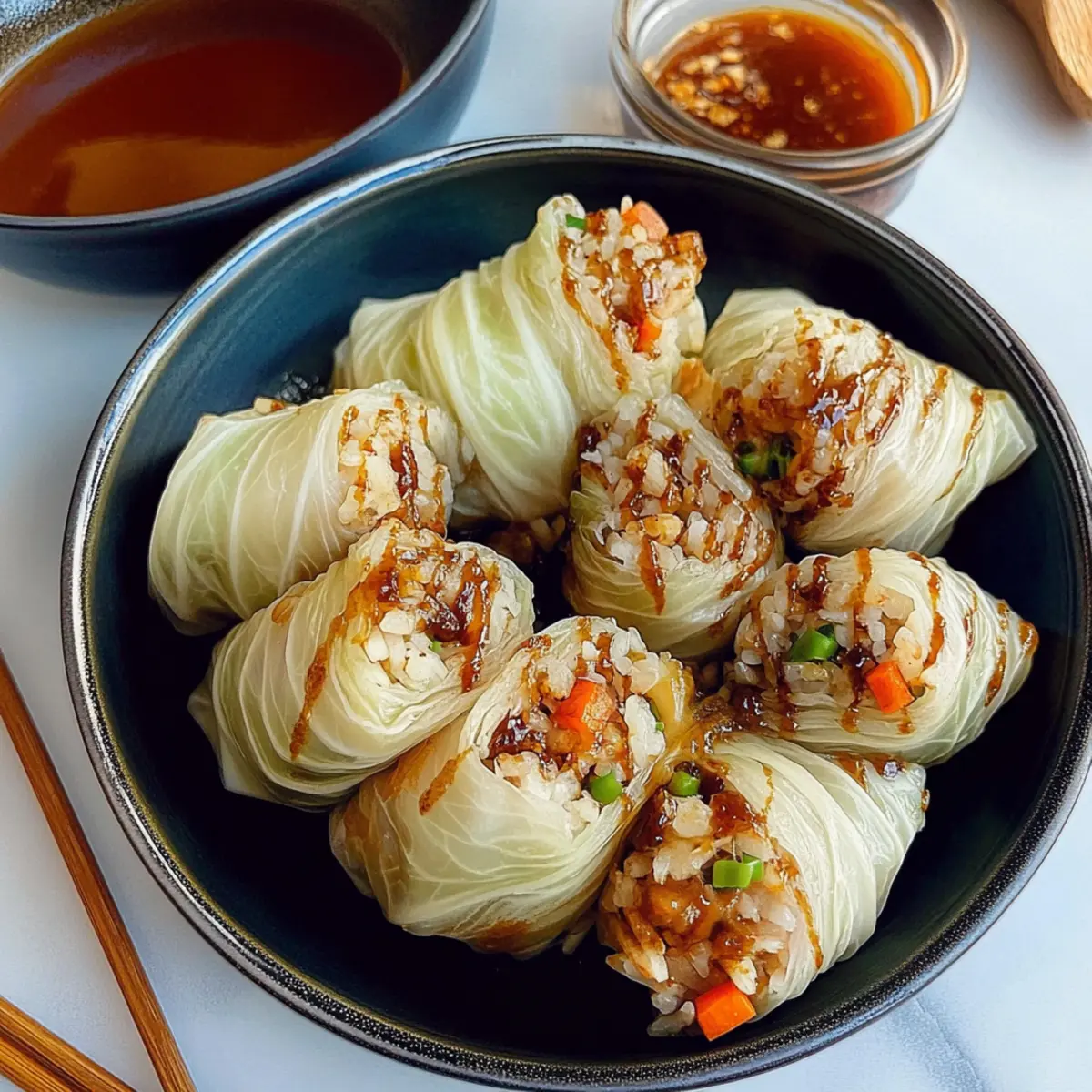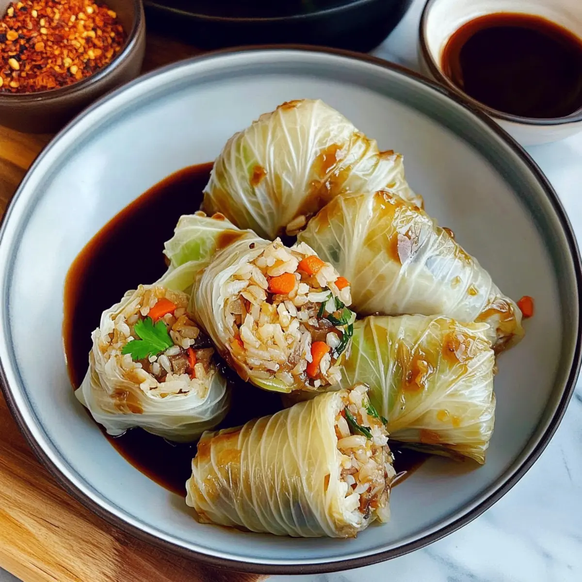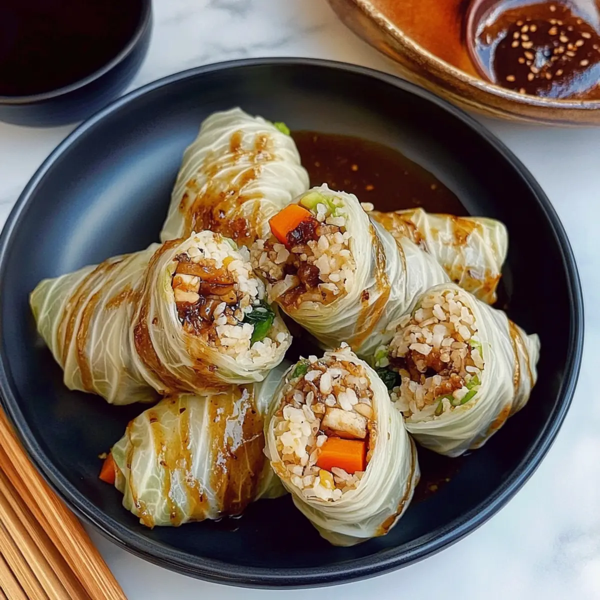 Jump to Recipe Print RecipeThe soothing aroma of garlic and ginger fills my kitchen as I prepare a dish that never fails to impress: Asian-Inspired Vegan Cabbage Rolls with Garlic Brown Sauce. These delightful rolls wrap tender napa cabbage leaves around a robust blend of rice and veggies, making for a dish that’s both quick to whip up and incredibly adaptable! Whether you’re vegan, gluten-free, or just seeking a delicious homemade meal, these vegan cabbage rolls tick all the boxes. They’re not just satisfying; they also bring a burst of vibrant flavors that even the pickiest eaters will love. Ready to enhance your culinary repertoire with a twist on a classic? Let’s roll up our sleeves and dive into this vibrant recipe that’s sure to impress at any gathering! Why Are Vegan Cabbage Rolls So Irresistible? Flavorful Fusion: These vegan cabbage rolls combine the best of both worlds, infusing traditional cabbage rolls with Asian-inspired flavors for a unique twist. Quick Preparation: With straightforward steps, you can have this crowd-pleaser ready in no time—perfect for a busy weeknight meal or an impressive gathering with friends. Adaptable Ingredients: Whether you prefer sushi rice or want to try quinoa, this recipe is easily customizable to fit dietary preferences and ingredients you have on hand. Consider pairing it with Cheesecake Cinnabon Rolls for a delightful dessert experience. Vibrant Textures: Enjoy the satisfying contrast of crisp cabbage wraps with a savory, warm filling, offering a delightful mouthfeel in every bite. Healthy Choice: At just 122 calories per roll, they’re a guilt-free, nutritious option that’s sure to please everyone at the table. Vegan Cabbage Rolls Ingredients For the Filling • Dry Sushi Rice (1 ¼ cups) – Provides structure and absorbs flavors; substitute with any short-grain rice if unavailable. • Napa Cabbage (1 large head) – Acts as the wrapper for the filling; can substitute with other cabbage varieties like Savoy or green cabbage. • Oil (1 tbsp, divided) – Used for sautéing vegetables and frying the rolls; use sesame oil for a flavorful twist. • Onion (1 medium, diced) – Adds sweetness and depth; substitute with shallots if desired. • Ginger (¾ tbsp, minced) – Provides warmth and spice; fresh ginger is recommended, but ground ginger can work in a pinch. • Garlic (3 cloves, minced) – Enhances flavor significantly; use garlic powder as a last resort. • Carrot (1 medium, diced) – Adds sweetness and crunch; you can substitute with zucchini for a different texture. • Peppers (2 medium, diced) – Provides sweetness and color; any bell pepper variety will work. • White Button Mushrooms (8, diced) – Contributes umami and texture; substitute with shiitake or a mix of mushrooms for variety. • Tamari (2 tbsp) – Acts as a savory seasoning; coconut aminos can be used as a gluten-free alternative. • Sea Salt, Ground Pepper, Onion Powder (½ tsp each) – Enhances overall flavor; adjust to taste. • Red Pepper Flakes (¼ tsp or to taste) – Adds heat; use black pepper as a milder alternative. • Sesame Seeds (to garnish) – Adds texture and flavor; can omit if desired. For the Garlic Brown Sauce • Oil (1 tsp) – Base for the sauce. • Ginger (½ tbsp, minced) – Adds an aromatic flavor that complements the dish. • Garlic (2 cloves, minced) – Enhances the sauce’s flavor profile significantly. • Tamari (1 ½ tbsp) – Provides umami and depth. • Rice Vinegar (1 tbsp) – Adds acidity to balance flavors perfectly. • Maple Syrup (¾ tbsp) – Introduces a hint of sweetness to the sauce. • Water (½ cup) – Adjusts consistency for the sauce. • Cornstarch (½ tbsp) – Acts as a thickener for the sauce’s perfect consistency. • Salt, Pepper, Red Pepper Flakes (to taste) – Enhances sauce flavor according to preference. These vegan cabbage rolls are versatile and delicious, ensuring a delightful experience at every meal! Step‑by‑Step Instructions for Asian-Inspired Vegan Cabbage Rolls Step 1: Cook Rice Begin by soaking 1¼ cups of dry sushi rice in water for 45–60 minutes. After soaking, drain the rice and transfer it to a pot. Add 1¾ cups of water and a pinch of salt, then bring to a boil. Lower the heat and cover, cooking for 10–12 minutes until tender and the water is absorbed. Once cooked, set aside to cool slightly. Step 2: Prepare Cabbage Leaves In a large pot, bring water to a rolling boil. Carefully add 3–4 leaves from a large head of napa cabbage and blanch them for 2–3 minutes until they become pliable. Remove the leaves and cool them immediately in cold water to stop the cooking process. Repeat with the remaining leaves, ensuring they are all softened for easy wrapping. Step 3: Sauté Vegetables Heat ½ tablespoon of oil in a large skillet over medium heat. Add diced onion, minced ginger, and minced garlic, sautéing for about 1 minute until fragrant. Next, toss in the diced carrot, bell peppers, and diced white button mushrooms, cooking for an additional 3–4 minutes until the veggies soften. Stir in 2 tablespoons of tamari along with sea salt, ground pepper, onion powder, and red pepper flakes for extra flavor, cooking for another 1–2 minutes. Step 4: Assemble the Rolls In a large bowl, combine the cooked rice and sautéed vegetables, mixing thoroughly. On a prepared cabbage leaf, place about 1½–2 tablespoons of the filling in the center. Fold the sides inward and then roll up tightly from the bottom, creating a secure wrap. Repeat this process for each leaf until the filling is used up. Step 5: Pan-Fry the Rolls In the same skillet, heat another ½ tablespoon of oil over medium heat. Add the assembled cabbage rolls seam-side down, and cook for 4–5 minutes until golden brown. Carefully flip the rolls and fry the other sides for an additional 4–5 minutes. The rolls should be crispy and warm throughout. Step 6: Make the Garlic Brown Sauce In a small sauc