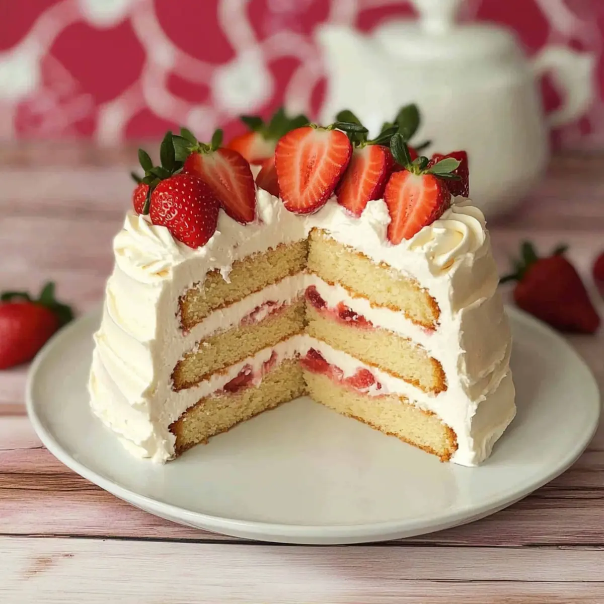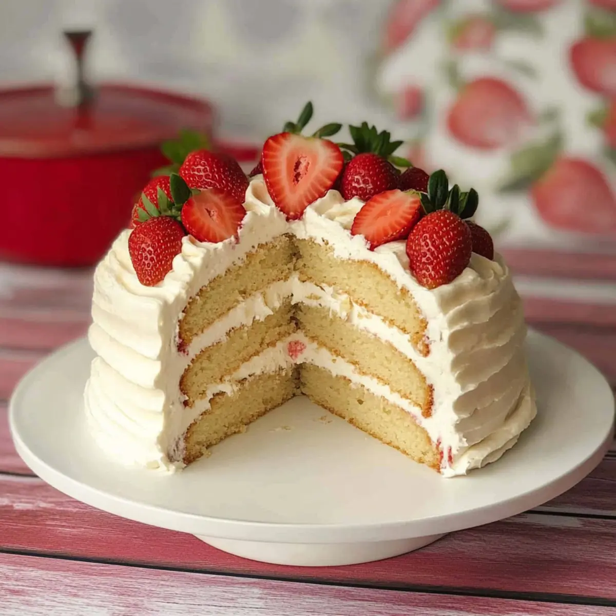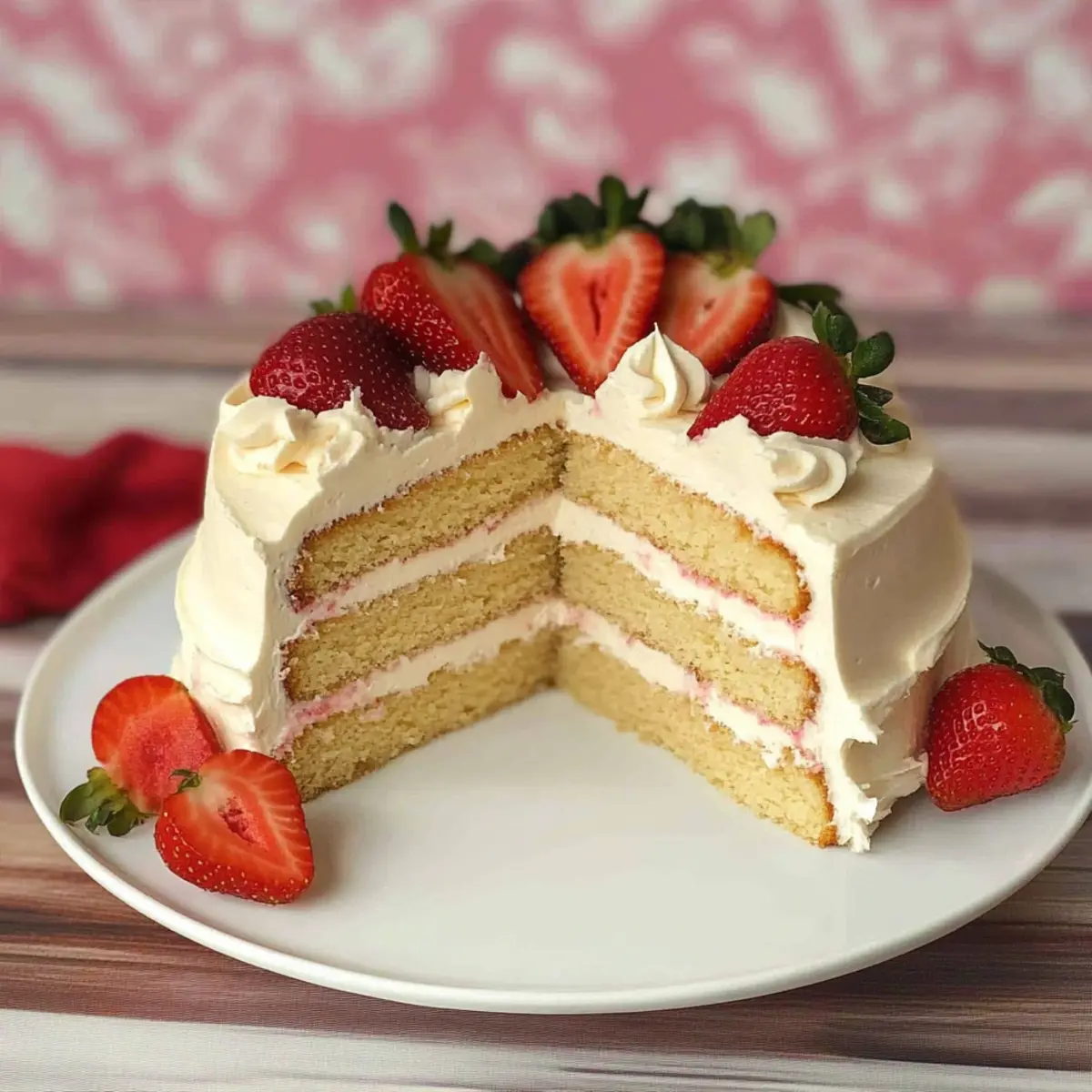 Jump to Recipe Print RecipeHave you ever found yourself longing for that classic vanilla cake, only to be met with the limitations of dietary restrictions? Well, I’ve got great news for you! This Vegan Vanilla Cake is a luscious, light, and fluffy delight that proves you can indulge without sacrificing flavor or texture. Not only is it remarkably straightforward to whip up—making it a favorite for both seasoned bakers and kitchen novices alike—it’s also wonderfully versatile, allowing for gluten-free adaptations and even cupcakes! Topped with a smooth vegan vanilla frosting and fresh strawberries, this cake stands tall for any occasion, from birthdays to casual get-togethers. Curious how to create this scrumptious masterpiece in your own kitchen? Let’s dive in! Why is this Vegan Vanilla Cake special? Deliciously Versatile: This cake easily adapts to suit any occasion, whether a birthday party or a cozy family dinner. Gluten-Free Option: With simple substitutions, it’s just as delightful in a gluten-free version, ensuring all your guests can join in the fun. Simplicity in Preparation: Even if you’re new to baking, this recipe makes it easy to achieve amazing results without fuss. Rich, Creamy Frosting: The velvety vegan frosting adds a rich touch that pairs beautifully with the cake, while fresh strawberries bring a pop of color and flavor. Crowd-Pleasing Appeal: Everyone, vegan or not, will be reaching for seconds! For more delightful desserts, check out my Fried Strawberry Cheesecake or the luscious Butterfinger Cheesecake Sweet. Vegan Vanilla Cake Ingredients • A light and fluffy treat awaits! For the Batter All Purpose Flour – Provides structure; consider using a gluten-free blend for a gluten-free version. White Granulated Sugar – Adds sweetness and moisture; can substitute with coconut sugar for a lower glycemic index. Baking Soda – Acts as a leavening agent; ensure it’s fresh for the best rise. Salt – Enhances flavor; omit if on a low-sodium diet. Soy Milk or Other Non-Dairy Milk – Adds moisture and fat; almond milk or oat milk can be used but check for added sugars. Vanilla Extract – Boosts flavor; use pure vanilla extract for optimal taste. Canola Oil – Adds moisture and richness; substitute with vegetable oil or melted coconut oil. Distilled White Vinegar or Apple Cider Vinegar – Reacts with baking soda for lift; essential for achieving cake fluffiness. For the Frosting Powdered Sugar – Provides sweetness and texture for frosting; you can make your own by blending granulated sugar. Vegan Butter – Acts as the base for frosting; choose a brand with no trans fats. For Decoration Fresh Strawberries – Optional for added freshness; only use if serving immediately to avoid sogginess. This Vegan Vanilla Cake is incredibly easy to make, but why not take a moment to appreciate each ingredient’s role in creating this delightful dessert? You’ll adore how every layer comes together to reveal a cake that’s not just vegan but truly irresistible! Step‑by‑Step Instructions for Vegan Vanilla Cake Step 1: Preheat and Prepare Pans Begin by preheating your oven to 350°F (180°C). While the oven heats, take two 7-inch round cake pans and thoroughly coat them with non-stick spray. For extra assurance, place a round of parchment paper at the bottom of each pan. This step ensures your Vegan Vanilla Cake will come out perfectly without sticking. Step 2: Sift Dry Ingredients In a large mixing bowl, combine your flour, granulated sugar, baking soda, and salt. Using a sifter, sift these ingredients together to eliminate lumps and incorporate air, which helps create that light and fluffy texture. Set this bowl aside as you prepare the wet ingredients, allowing the dry mixture to blend well. Step 3: Mix Wet Ingredients In a separate bowl, mix together the soy milk, vanilla extract, canola oil, and distilled vinegar. Whisk until they are well combined and slightly frothy, which will activate the vinegar with the baking soda later. This step is essential for achieving the perfect rise in your Vegan Vanilla Cake. Step 4: Combine Wet and Dry Mixtures Slowly pour the wet mixture into the bowl of dry ingredients. Gently whisk together until just combined; be careful not to overmix as this can lead to denser cake. You’ll want to see a few lumps in the batter—this ensures your cake stays light and fluffy during baking. Step 5: Pour Batter into Pans Divide the batter evenly between the two prepared cake pans. Use a spatula to smooth the tops for an even bake. Ensure both pans are filled to the same level to create balanced layers. Once done, place them into the preheated oven to bake for 25-30 minutes. Step 6: Check for Doneness Keep an eye on your vegan cakes as they bake. After about 25 minutes, insert a toothpick into the center of each cake; it should come out clean or with a few moist crumbs. If needed, extend the baking time by a few minutes to ensure they are thoroughly baked. Step 7: Cool Cakes Once baked, remove the pans from the oven and let them cool for about 5-10 minutes. Then, gently turn the cakes out onto a wire rack to cool completely. This helps prevent sogginess and ensures your Vegan Vanilla Cake layers are light and airy. Step 8: Prepare Vegan Frosting As the cakes cool, prepare the frosting by beating together the powdered sugar, vegan butter, vanilla extract, and soy milk in a mixing bowl. Whisk until the mixture is smooth and creamy. You want it to be spreadable but firm enough to hold its shape once frosted. Step 9: Assemble the Cake Once the cake layers are completely cool, place one layer on a serving plate. Spread a generous amount of vegan frosting on top. Carefully stack the second layer on top of the frosted cake. Frost the top and the sides of the entire cake for a beautiful finish that showcases your Vegan Vanilla Cake. Step 10: Decorate with Strawberries If serving immediately, adorn the top of the cake with fresh strawberries for