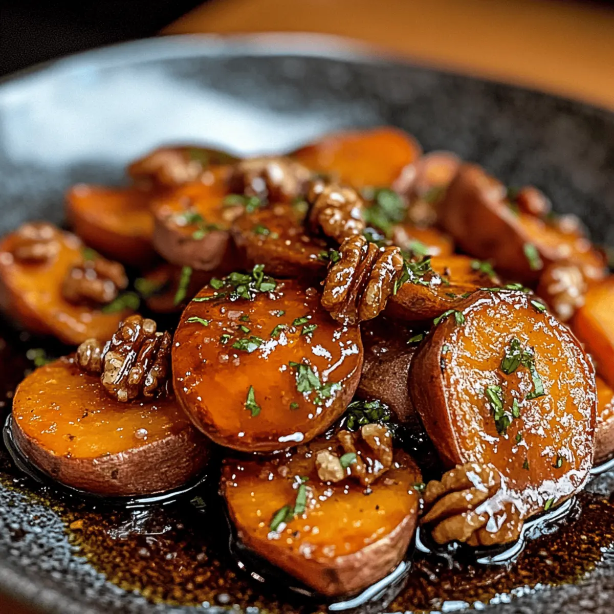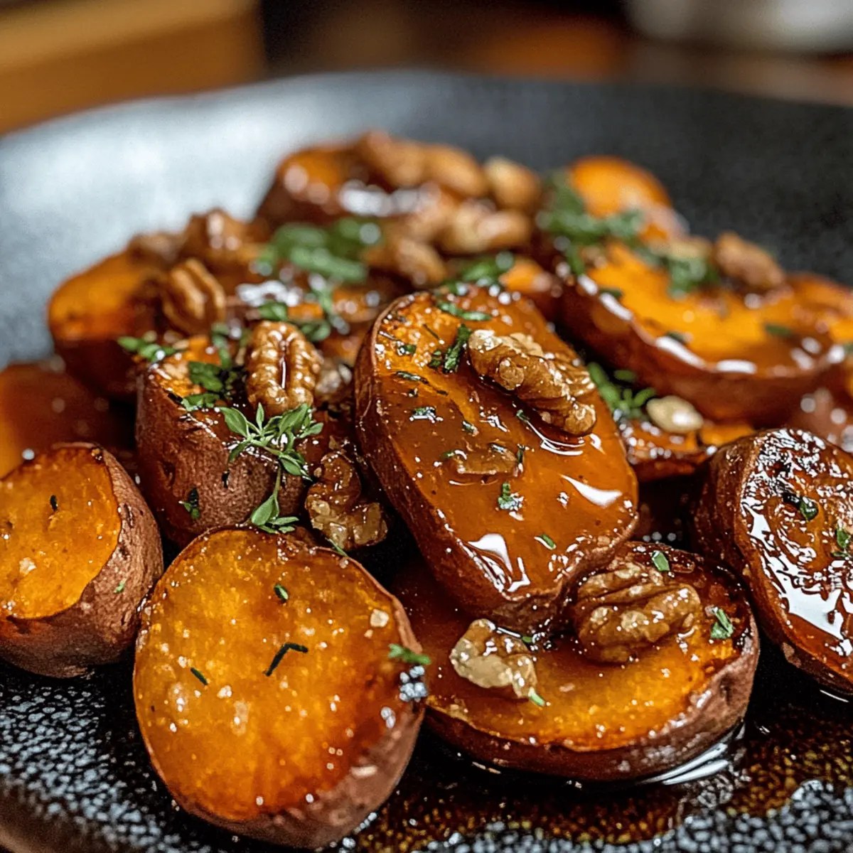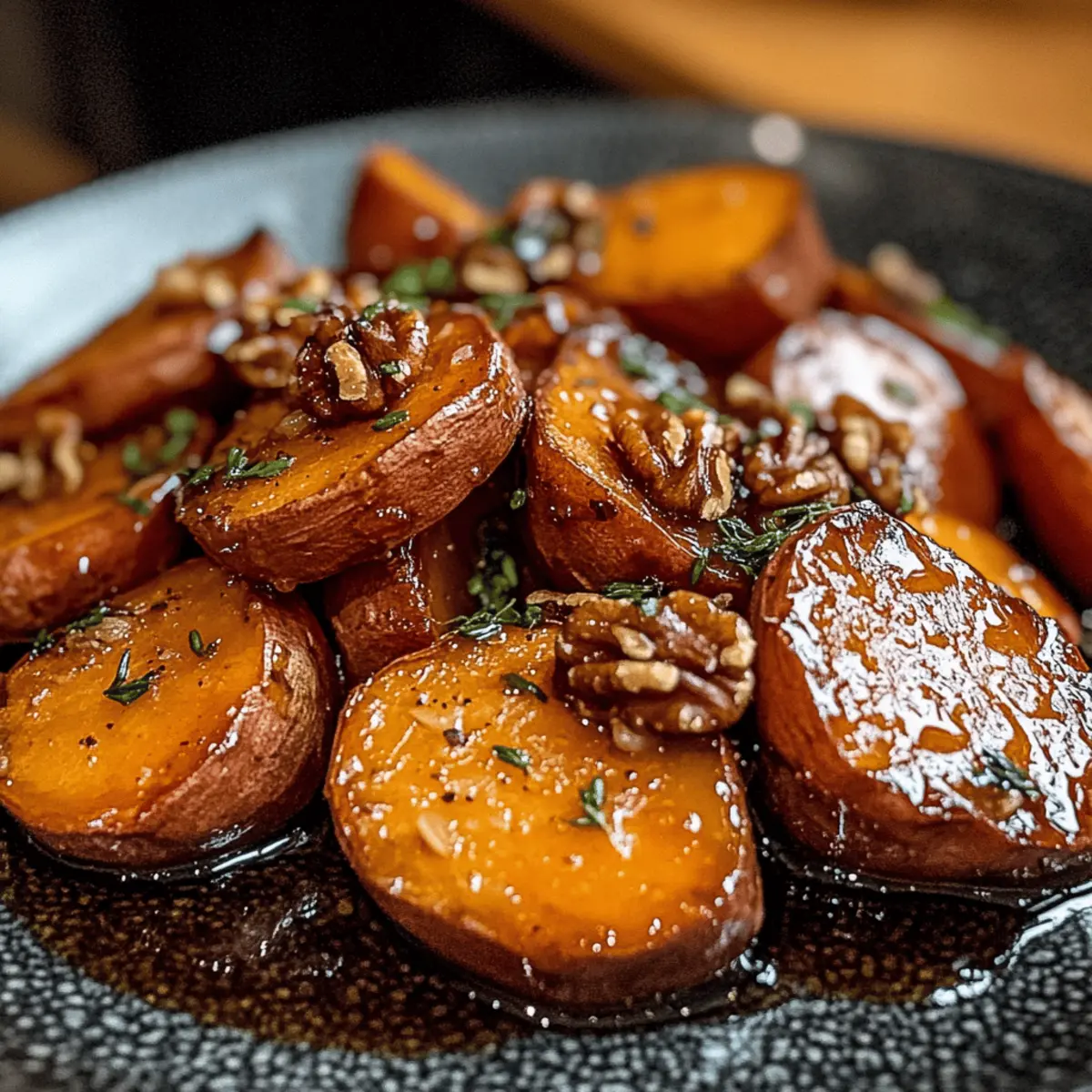 Jump to Recipe Print RecipeAs the sweet aroma of roasted sweet potatoes wafted through my kitchen, I knew I had stumbled upon something special. These Walnut Maple Roasted Sweet Potatoes are more than just a side dish; they’re a warm embrace on a chilly holiday evening. With just the right touch of cinnamon and a drizzle of rich maple syrup, every bite balances comfort with a hint of elegance. Plus, the delightful crunch from caramelized walnuts takes this dish from ordinary to extraordinary, making it the crowd-pleaser you’ll want to serve at your next gathering. Whether it’s Thanksgiving or a cozy family dinner, these sweet potatoes promise to be a shining star on your holiday table. Ready to discover how to make this simple yet impressive dish? Let’s dive in! Why Are These Sweet Potatoes Special? Comforting Flavors: Walnut Maple Roasted Sweet Potatoes combine the sweetness of roasted sweet potatoes with the warmth of cinnamon and the irresistible taste of maple syrup. Crowd-Pleasing Dish: Everyone loves a warm, flavorful side that pairs well with almost any main course, making it perfect for holiday gatherings or family dinners. Easy Preparation: Minimal effort and just a few ingredients transform this side dish into a star. Simply toss, roast, and serve! Nutty Crunch: The caramelized walnuts add a delightful texture contrast, elevating the dish from simple to sophisticated. Versatile Variations: Feel free to experiment by swapping walnuts for pecans or adding a pinch of cayenne for a subtle kick, ensuring that you never tire of this comforting favorite. If you’re looking for even more delicious comfort food ideas, check out these Sausage Sweet Potatoes or the sweet and savory Maple Glazed Bacon. Walnut Maple Roasted Sweet Potatoes Ingredients For the Roasted Sweet Potatoes Sweet Potatoes – They bring natural sweetness and body; choose firm, unblemished tubers for the best flavor. Butter – Adds richness to the glaze; feel free to use vegan butter for a dairy-free option. Cinnamon – For that warm, cozy flavor; nutmeg makes a great substitute if you prefer a different spice profile. Maple Syrup – Sweetens the dish and provides a unique flavor; honey can replace it, though it alters the taste slightly. For the Topping Walnuts – They contribute crunch and nuttiness; pecans can be substituted for a different texture and flavor. Fresh Thyme – Enhances the aromatic experience; if you’re out, dried thyme works, but the flavor won’t be as vibrant. Enjoy creating these Walnut Maple Roasted Sweet Potatoes that are sure to be a comforting holiday side dish! Step‑by‑Step Instructions for Walnut Maple Roasted Sweet Potatoes Step 1: Preheat Your Oven Begin by preheating your oven to 400°F (200°C). This temperature will ensure that your Walnut Maple Roasted Sweet Potatoes achieve the perfect caramelization. As the oven heats up, gather your ingredients and prepare your baking sheet, lining it with parchment paper for easy cleanup. Step 2: Prepare the Sweet Potatoes Peel the sweet potatoes and slice them into even rounds, about ½ inch thick. This uniformity is key to ensure all pieces cook at the same rate. Place the sliced sweet potatoes in a large mixing bowl, ready to be coated in goodness. Step 3: Mix the Coating In your bowl of sweet potatoes, add melted butter, cinnamon, and a pinch of salt. Toss everything together until the sweet potatoes are evenly coated in the rich, fragrant mixture. The buttery glaze should glisten, inviting you to move to the next step. Step 4: Arrange on the Baking Sheet Transfer the coated sweet potatoes to the prepared baking sheet, spreading them out in a single layer. Avoid overcrowding to allow for optimal roasting and caramelization. At this stage, the sweet potatoes should look beautifully coated and ready to transform in the oven. Step 5: Roast and Flip Roast the sweet potatoes in the preheated oven for 25 minutes. Halfway through, take the baking sheet out and flip the sweet potato rounds to ensure they cook evenly. They should start to soften and show a hint of golden color before introducing the walnuts. Step 6: Add the Walnuts and Maple Syrup Once flipped, drizzle on the maple syrup and sprinkle the walnuts over the sweet potatoes. The syrup will create a sweet glaze that clings to the potatoes while the walnuts add a delightful crunch. Return the baking sheet to the oven for an additional 15 minutes. Step 7: Check for Doneness After the additional roasting time, check to see that the sweet potatoes are fork-tender and the walnuts are beautifully caramelized. They should have an inviting golden hue. If needed, you can let them roast for a few more minutes while keeping an eye on the walnuts to prevent burning. Step 8: Garnish and Serve Carefully remove the Walnut Maple Roasted Sweet Potatoes from the oven. Sprinkle with fresh thyme for a pop of color and aromatic flavor. Serve the sweet potatoes warm, and enjoy the comforting combination that this dish brings to your holiday table. What to Serve with Walnut Maple Roasted Sweet Potatoes Transform your holiday gathering into a feast of comfort and warmth with these delightful pairings. Herb-Roasted Chicken: Juicy, tender chicken infused with herbs complements the sweet and earthy notes of your sweet potatoes beautifully. Savory Green Beans: Crisp-tender green beans tossed in olive oil and garlic bring a fresh crunch, contrasting the rich sweetness of the dish. Garlic Mashed Potatoes: Creamy mashed potatoes seasoned with garlic work as a delightful, comforting base that harmonizes with the flavors of your sweet potatoes. Maple-Glazed Brussels Sprouts: Adding a sweet maple glaze to Brussels sprouts enhances the whole meal with a roasted, caramelized twist. Cranberry Sauce: A side of tangy cranberry sauce offers a sharp contrast, brightening the meal and making each bite feel festive. Festive Salad: A mixed greens salad topped with goat cheese and walnuts adds lightness and texture