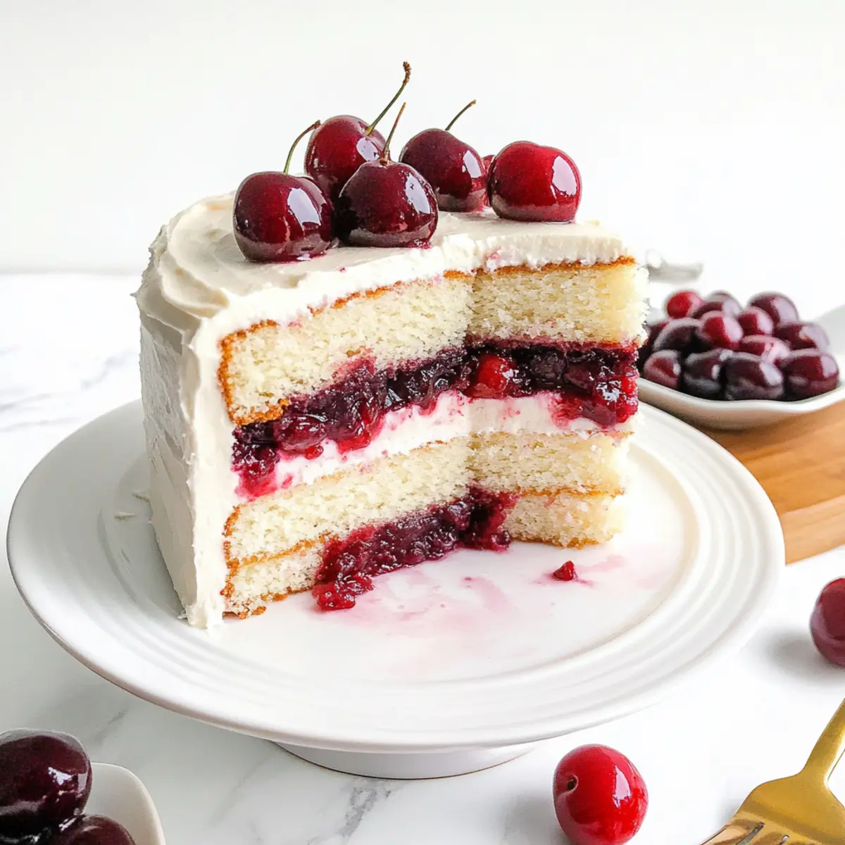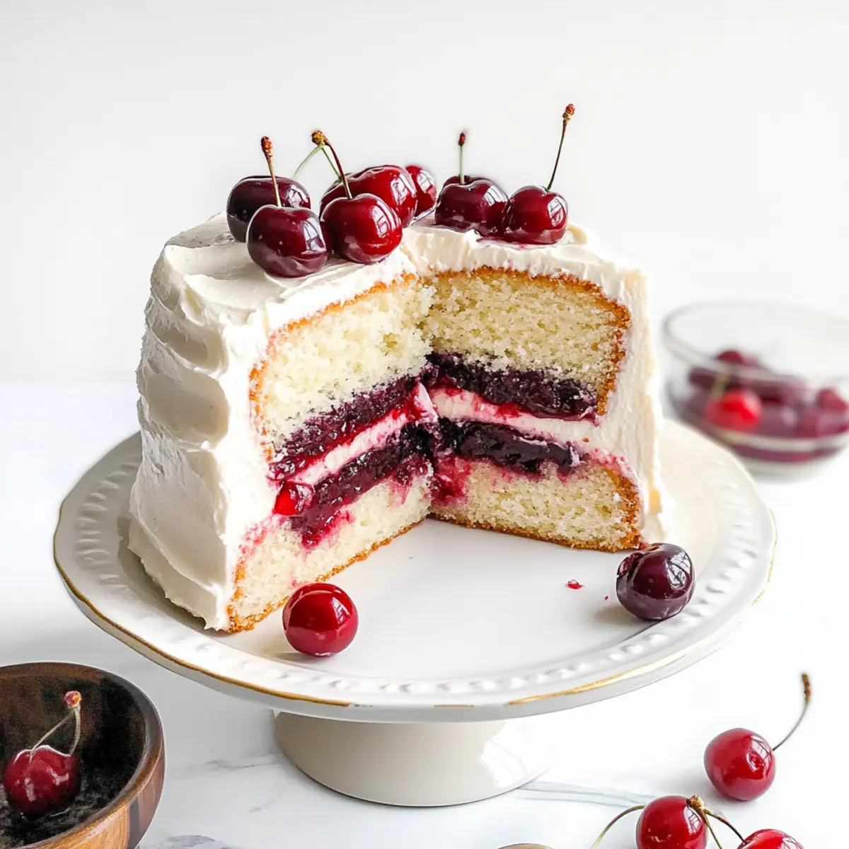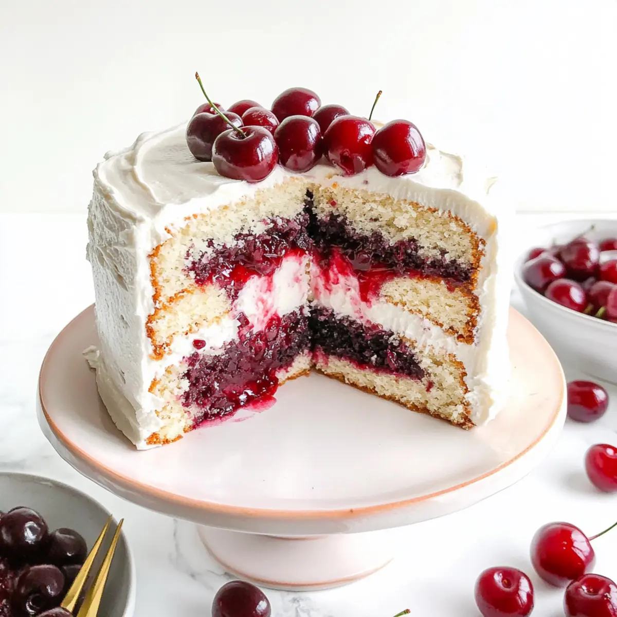 Jump to Recipe Print RecipeAs I sift through the flour and sugar, the sweet scent of nostalgia fills the air. Today, I’m excited to share my recipe for White Forest Cake—a delightful dessert that effortlessly brings elegance to any occasion. This stunning cake features layers of light, fluffy sponge, complemented by a luscious cherry filling and a creamy, not-too-sweet cream cheese frosting. Not only is it a showstopper for celebrations like Valentine’s Day and Christmas, but it also boasts incredible versatility—perfect for those who love a touch of fruitiness in their desserts. Whether you’re a seasoned home chef or someone looking to elevate your baking game, this White Forest Cake promises to impress without hours of complicated prep. Ready to create a dessert that looks as good as it tastes? Let’s dive into this delectable recipe! Why is White Forest Cake So Special? Simplicity at Its Finest: This elegant cake is easy to make, making it perfect for all bakers, whether you’re a newbie or a seasoned pro. Balanced Flavors: With a delightful marriage of tart cherries and creamy frosting, each bite is a taste of pure heaven. Versatile Option: Switch out the cherry filling for your favorite berries or try a fluffy whipped cream frosting for a fun twist! Eye-Catching Design: The layers of cake and filling create a stunning visual that will impress at any gathering—don’t be surprised if your guests ask for the recipe! Make-Ahead Friendly: You can prepare the cake layers in advance and freeze them, saving time for those busy celebration days. Need more inspiration? You might enjoy making a Strawberry Cheesecake Cinnabon or a Jiggly Japanese Cheesecake for your next baking adventure! White Forest Cake Ingredients • Get ready to bake the perfect White Forest Cake! For the Cake Cake Flour – Provides a light texture for the sponge cake; substitute with all-purpose flour for a denser result. Sugar – Sweetens the cake and beautifully balances the tart cherry filling; no direct substitutes recommended. Baking Powder & Baking Soda – Leavening agents that help the cake rise; fresh supplies are key for the best rise. Salt – Enhances flavor; either standard table salt or sea salt works wonderfully. Buttermilk – Adds moisture and tenderness; regular milk with a tablespoon of vinegar can serve as a substitute. Melted Butter – Provides richness and moisture; vegetable oil can replace it if desired. Egg Whites – Offers the light, airy texture; whole eggs can be used but will alter color and texture slightly. Vanilla & Almond Extract – Flavor enhancers that deepen the taste; pure extracts yield the best results. For the Cherry Filling Frozen Cherries – Used in the filling; fresh cherries are a seasonal swap, but adjust sweetness if necessary. Cherry Liqueur – Adds a rich flavor to the filling; you can omit it for a non-alcoholic version or use cherry extract instead. Cornstarch – Thickens the cherry filling; no substitute needed here. For the Frosting Cream Cheese – The main ingredient in the creamy frosting; mascarpone can be used for variety, though flavors will differ. Powdered Sugar – Sweetens and stabilizes the frosting; alternative sweeteners may work, but texture may vary. Enjoy the process of creating your delicious White Forest Cake! Step‑by‑Step Instructions for White Forest Cake Step 1: Combine Dry Ingredients In a large mixing bowl, whisk together 2 cups of cake flour, 1 ½ cups of sugar, 2 teaspoons of baking powder, 1 teaspoon of baking soda, and ½ teaspoon of salt until evenly blended. This precise combination sets the foundation for a fluffy White Forest Cake. Take a moment to enjoy the sweet aroma of the sugar as it dances with the flour! Step 2: Mix Wet Ingredients In a separate bowl, combine 1 cup of buttermilk, ½ cup of melted butter, 4 egg whites, 2 teaspoons of vanilla extract, and 1 teaspoon of almond extract. Whisk vigorously until the mixture is smooth and well-integrated. This creamy blend will help achieve the cake’s moisture and delicate texture, creating a luscious base for your delightful dessert. Step 3: Prepare Batter Gradually fold the dry ingredients into the wet mixture, stirring gently with a spatula until just combined—avoid overmixing to keep the cake light. Take a moment to appreciate the batter’s glossy sheen, which indicates it’s ready for baking. Preheat your oven to 350°F (175°C) while you prepare the pans. Step 4: Bake Evenly divide the batter among three greased 8-inch round cake pans. Smooth the tops with a spatula and carefully place them in the preheated oven. Bake for approximately 26 minutes or until a toothpick inserted in the center comes out clean. Cool the cakes in the pans for 10 minutes, then turn them out onto wire racks to cool completely. Step 5: Prepare Cherry Filling In a medium saucepan, combine 2 cups of frozen cherries, ¼ cup of cherry liqueur (or cherry extract), ½ cup of sugar, and 2 tablespoons of cornstarch. Cook over medium heat for about 10 minutes, stirring frequently until the mixture thickens and bubbles. Once achieved, transfer to a bowl and chill it in the refrigerator, allowing the flavors to meld beautifully. Step 6: Make Frosting In a large mixing bowl, beat 8 ounces of cream cheese with 1 teaspoon of vanilla extract until creamy and smooth. Gradually add 3 cups of powdered sugar, mixing until the frosting reaches a spreadable consistency. Don’t rush through this step; take the time to achieve a silky texture that will elevate your White Forest Cake. Step 7: Assemble Cake Begin layering your cake by placing the first layer on a serving plate, and generously frost the top with your cream cheese mixture. Spoon a layer of chilled cherry filling on top, then repeat this process with the second cake layer. For the third layer, top and frost the entire cake to create a beautiful, creamy exterior, making sure each layer is visually distinct and delicious. Step 8: Garnish a