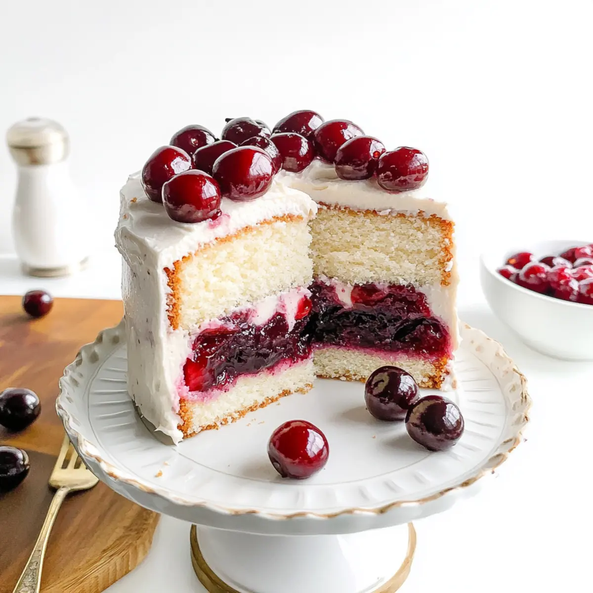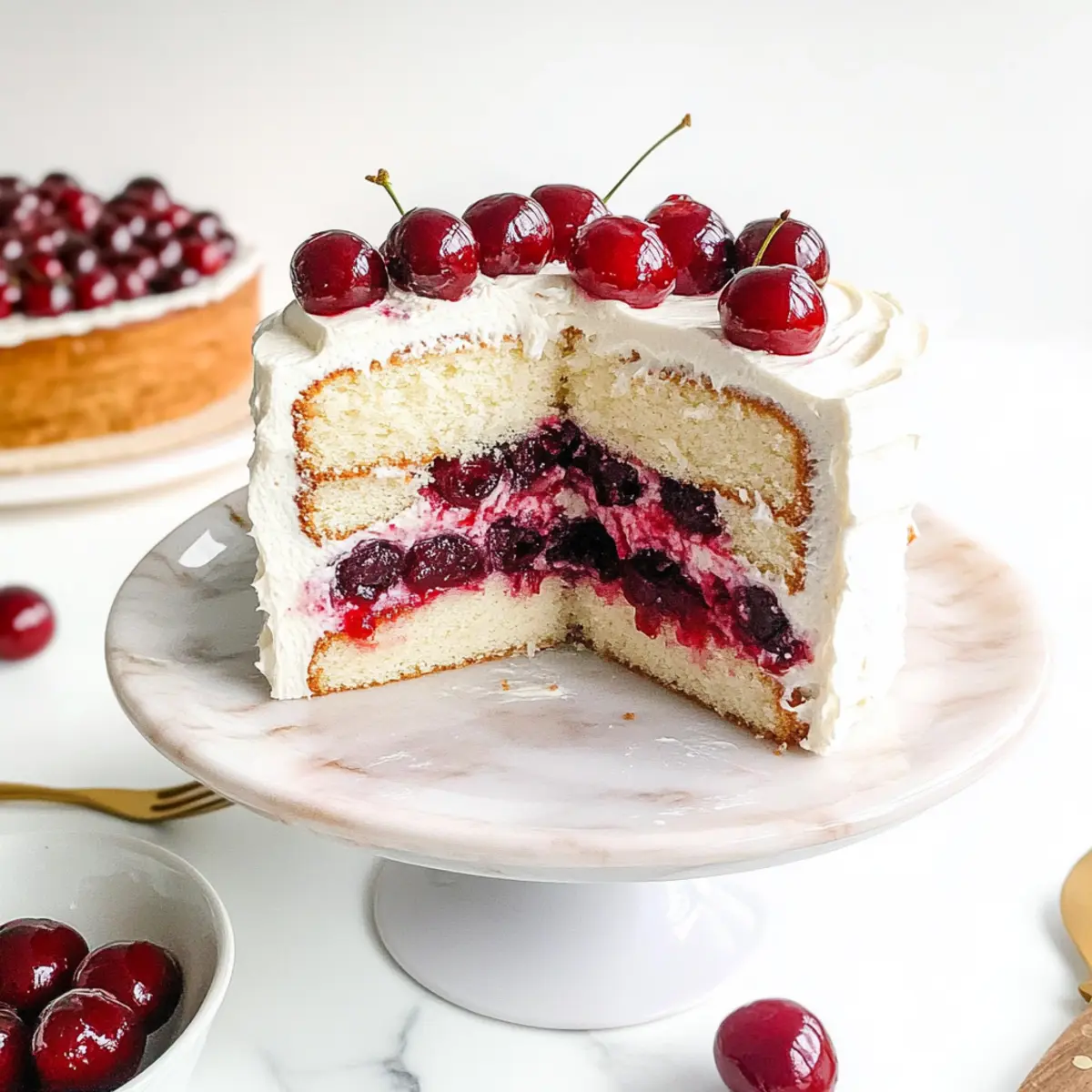 This White Forest Cake offers a delightful twist on the traditional dessert, featuring luscious cherry layers and creamy frosting—perfect for any celebration.