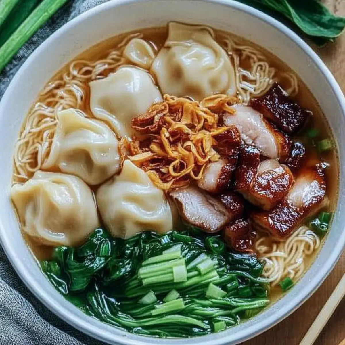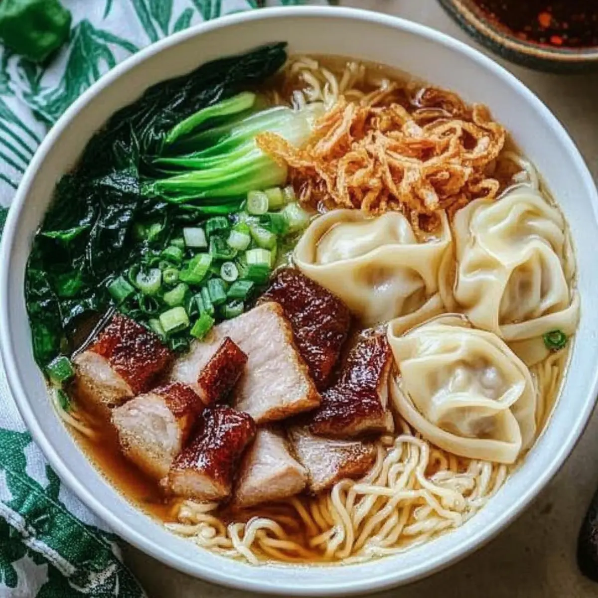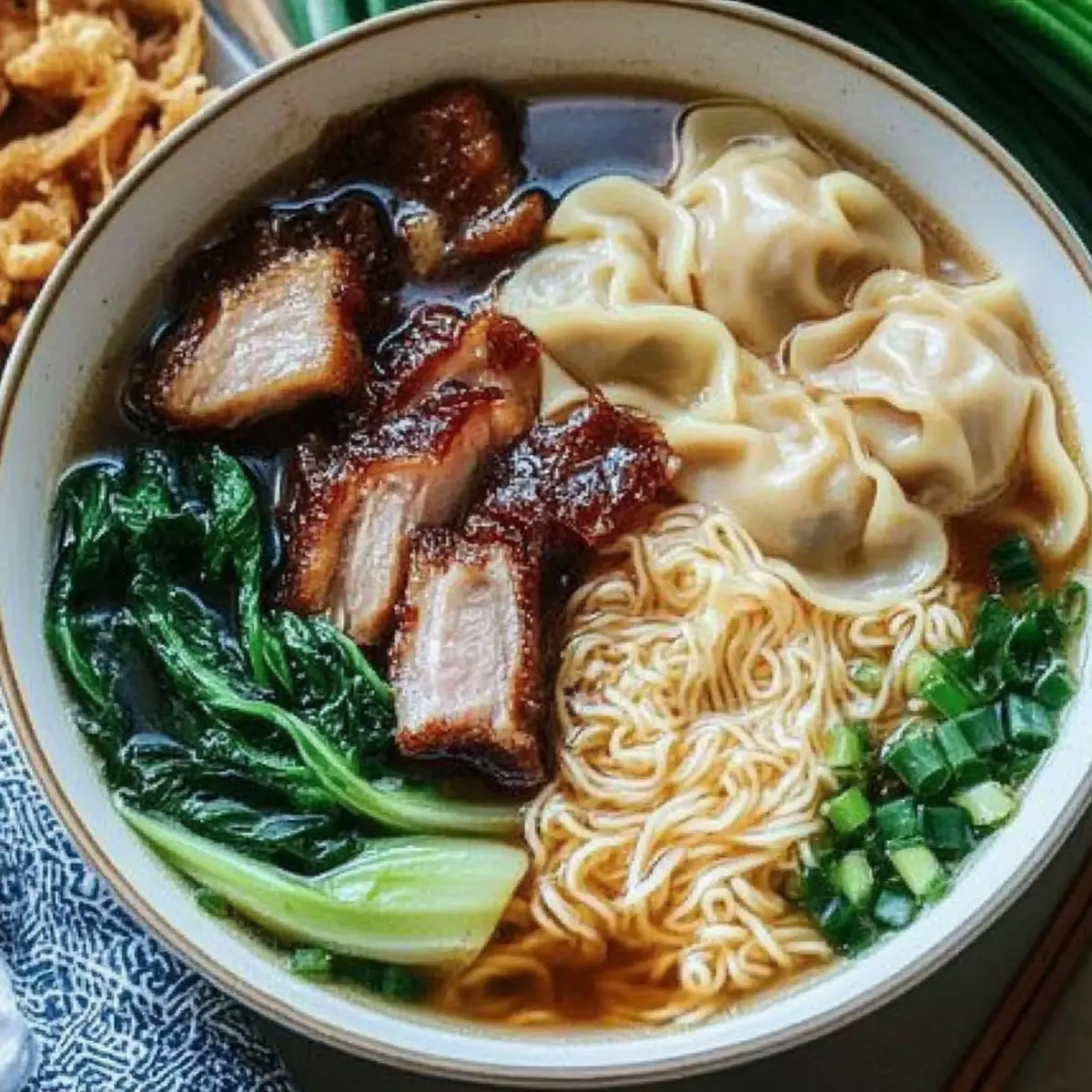 Jump to Recipe Print RecipeAs I leaned over my steaming bowl of Wonton Char Siu Noodle Soup, the rich, savory aroma transported me straight to the bustling streets of Cantonese cuisine. This quick and customizable dish not only comforts the soul but also offers a wonderful way to utilize leftover BBQ pork, effortlessly transforming a busy weeknight into an extraordinary dining experience. The combination of springy egg noodles, tender greens, and juicy wontons creates a harmony of textures and flavors, making this soup a beloved recipe for any time of day. Plus, it’s a surefire crowd-pleaser that can be tailored to suit various palates, whether you’re feeding your family or enjoying a solo meal. Ready to elevate your home-cook game with a dish that feels like a warm hug in a bowl? Let’s dive into this delicious culinary adventure! Why is this Wonton Soup a Must-Try? Comforting, the rich broth envelops the noodles, creating a cozy meal that soothes the mind and tummy. Quick and easy, it takes minimal prep and can be whipped up in under 30 minutes—ideal for those busy weeknights. Customizable, you can effortlessly swap ingredients like using leftover rotisserie chicken in place of char siu or your favorite greens instead of choy sum. Crowd-pleasing, this soup is perfect for family dinners or impressing friends without much fuss, reminiscent of your favorite takeout joint. If you love heartwarming bowls like Chicken Noodle Soup and want to explore more delicious options, keep reading for all the amazing variations! Wonton Char Siu Noodle Soup Ingredients For the Broth • Chicken Broth (2 cups) – This rich base adds depth, but feel free to swap in vegetable or beef broth for a different twist. • Ginger (1 slice) – Provides warmth and an aromatic flavor that elevates the broth. • Shaoxing Wine (1 tsp) – Enhances the overall flavor; dry sherry works in a pinch. • Light Soy Sauce (1 tsp) – This brings a savory umami depth to the dish, while regular soy sauce can also do the job. • White Pepper (1/8 tsp) – Just a pinch adds subtle heat and complexity. • Sugar (1/4 tsp) – Balances the savory flavors perfectly. For the Noodles and Wontons • Thin Egg Noodles – The star of this Wonton Char Siu Noodle Soup; if unavailable, try ramen or somen noodles instead. • Wontons (6 pieces) – These are vital for texture and protein; use homemade or store-bought, or swap with dumplings if you prefer. For the Greens • Choy Sum (or Baby Bok Choy) – Adds a fresh, crisp texture; spinach or sautéed kale are good substitutes as well. For Garnishing • Char Siu Pork – The heart of any char siu noodle soup, bringing savory goodness; substitute rotisserie chicken or any protein you love. • Fried Shallots – Optional, but they add a delicious crispy topping that enhances your soup’s flavor. • Green Onion – Use chopped green onion for a fresh garnish that adds a delightful touch. • Sesame Oil (1/2 tsp) – A finishing touch for aromatic richness; just a drizzle elevates the entire dish! Why not gather these ingredients and let the fragrance of this comforting Wonton Char Siu Noodle Soup sweep you away to your own kitchen paradise? Step‑by‑Step Instructions for Wonton Char Siu Noodle Soup Step 1: Prepare the Broth In a medium saucepan, pour 2 cups of chicken broth and add a slice of ginger along with 1 teaspoon of Shaoxing wine. Bring the mixture to a rolling boil over medium-high heat, then stir in 1 teaspoon of light soy sauce, 1/8 teaspoon of white pepper, and 1/4 teaspoon of sugar. Let it simmer for about 5 minutes, allowing the flavors to meld beautifully while you prepare the other ingredients. Step 2: Blanch the Greens In a separate pot, fill with water and bring it to a rapid boil. Season with a pinch of salt and a splash of oil. Gently add 1 cup of choy sum (or baby bok choy) and cook for 40-50 seconds, until the greens are vibrant and tender. Use a slotted spoon to remove the greens and set them aside, ensuring to leave the boiling water for the noodles. Step 3: Cook the Noodles With the same boiling water, add the thin egg noodles, cooking according to the package instructions until just al dente, usually around 2-3 minutes. Once cooked, drain the noodles and place them in a large serving bowl, ready to be immersed in the delicious broth. Step 4: Prepare the Wontons In a small pot, bring water back to a boil and gently add 6 wontons. Cook them until they float, typically about 3-5 minutes, indicating they are done. Carefully remove them from the pot with a slotted spoon and set aside next to the cooked noodles, making sure they stay warm and delicious. Step 5: Assemble the Soup Now comes the best part: ladle the hot, flavorful broth over the noodles in the bowl, ensuring they are fully submerged. Place the wontons delicately on top, followed by generous pieces of char siu pork. Add the blanched choy sum for a pop of color and nutrition. Step 6: Garnish and Serve For an elevated finishing touch, drizzle 1/2 teaspoon of sesame oil over everything, enhancing the aroma and flavor. Sprinkle fried shallots and chopped green onions on top for that perfect crunch and freshness. Your comforting Wonton Char Siu Noodle Soup is now ready to be savored! What to Serve with Wonton Char Siu Noodle Soup Indulging in a steaming bowl of comforting wonton char siu noodle soup opens the door to delightful pairing possibilities that elevate your meal. Pickled Vegetables: These tangy bites provide a refreshing crunch, perfectly balancing the savory richness of the soup. Their bright flavors awaken the palate, enhancing the overall dining experience. Crispy Spring Rolls: With a crunchy exterior and savory filling, these rolls add texture and a satisfying bite that complements the soft soup elements beautifully. They’re perfect for dipping in a sweet chili sauce for an added zing. Garlic Stir-Fried Greens: Quick sautéed greens like bok choy or spinach infused with garlic bri